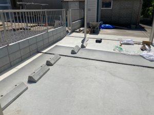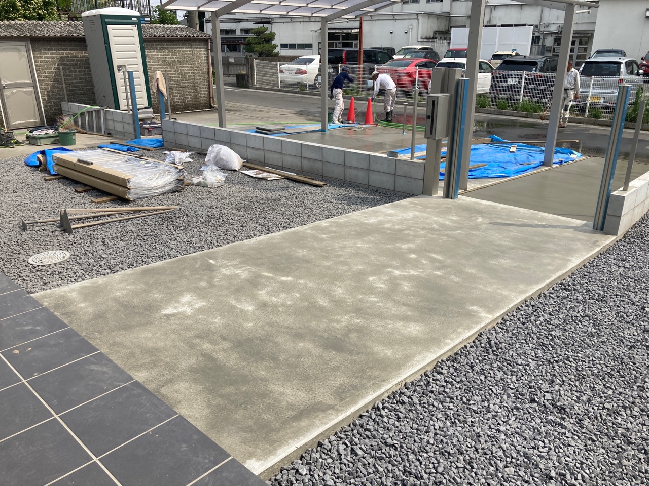 駐車場の土間コンクリートが打設されました。先日までとは変わり、今週はずっと晴れの予報。コンクリート、外部仕事をするには大変ありがたい天候です。