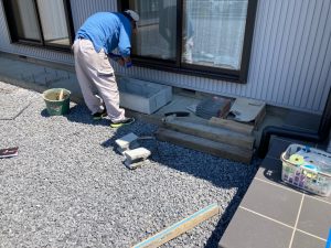 縁側の掃き出し窓の前にはモルタルで踏み段をつくります。お寺さんが見えた時に昇降しやすいように1FLまでの高さの半分くらいとします。