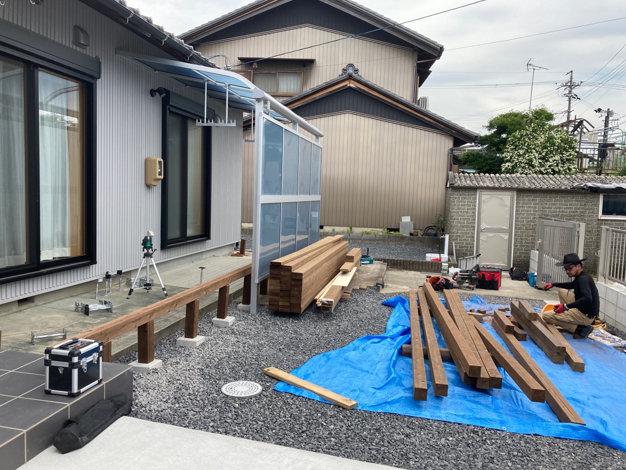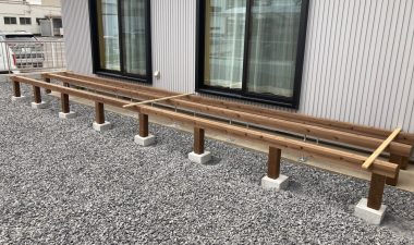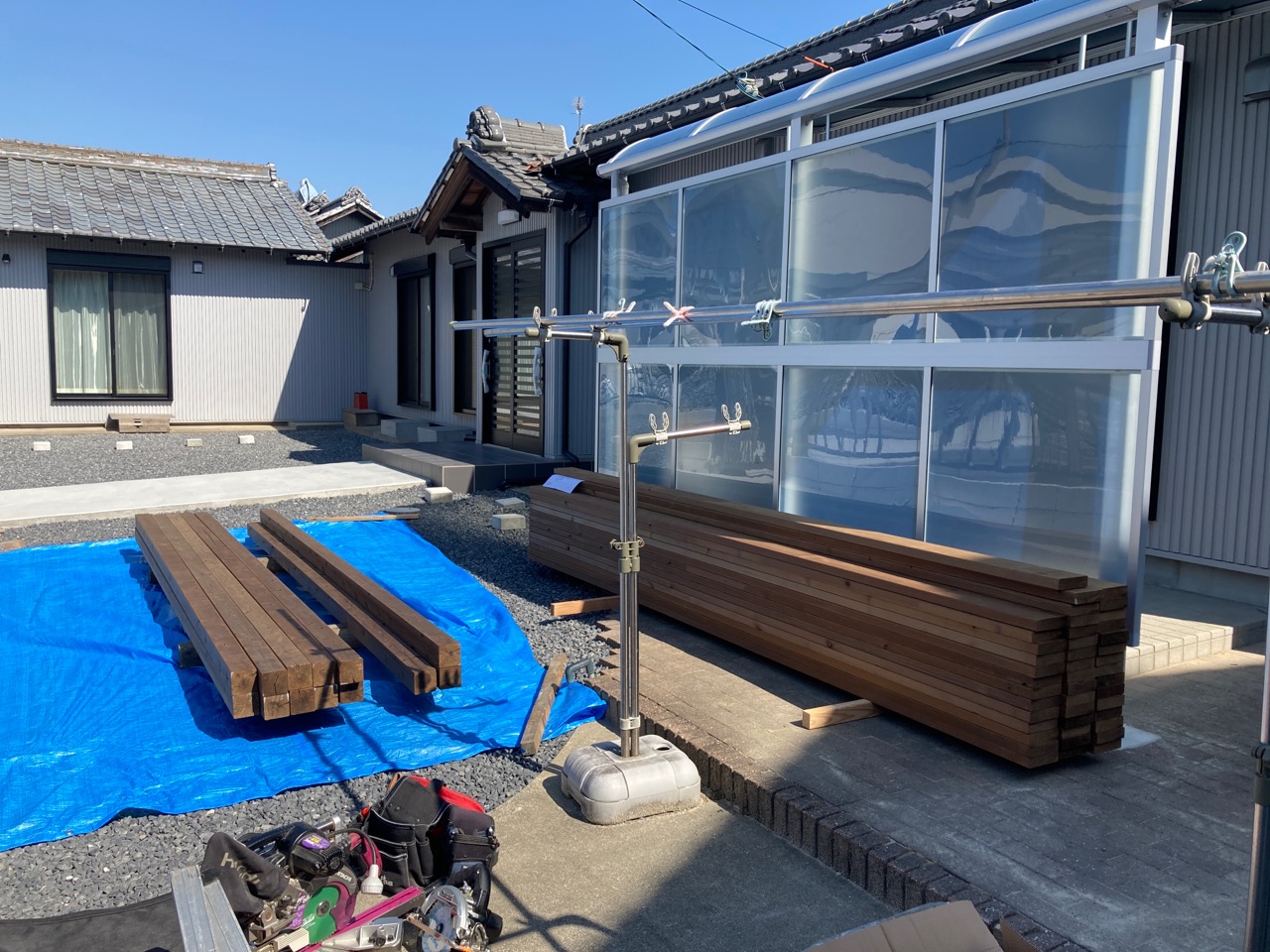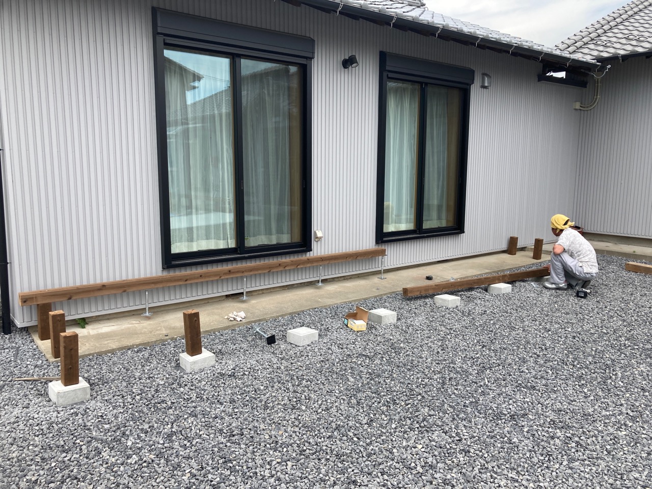 長くかかったリフォームの最後の工事、掃き出し窓前のウッドデッキの制作に取り掛かりました。簡単な形状のデッキですが、何より距離が長いので材料も大量に必要です。