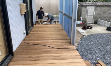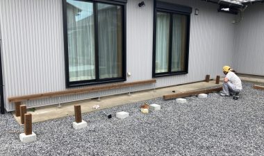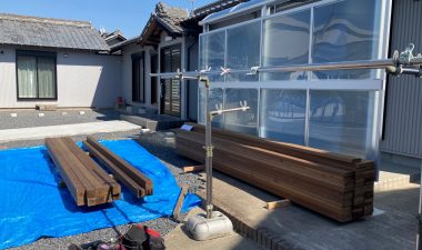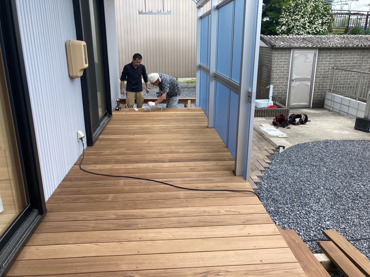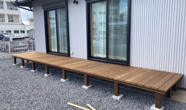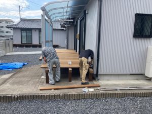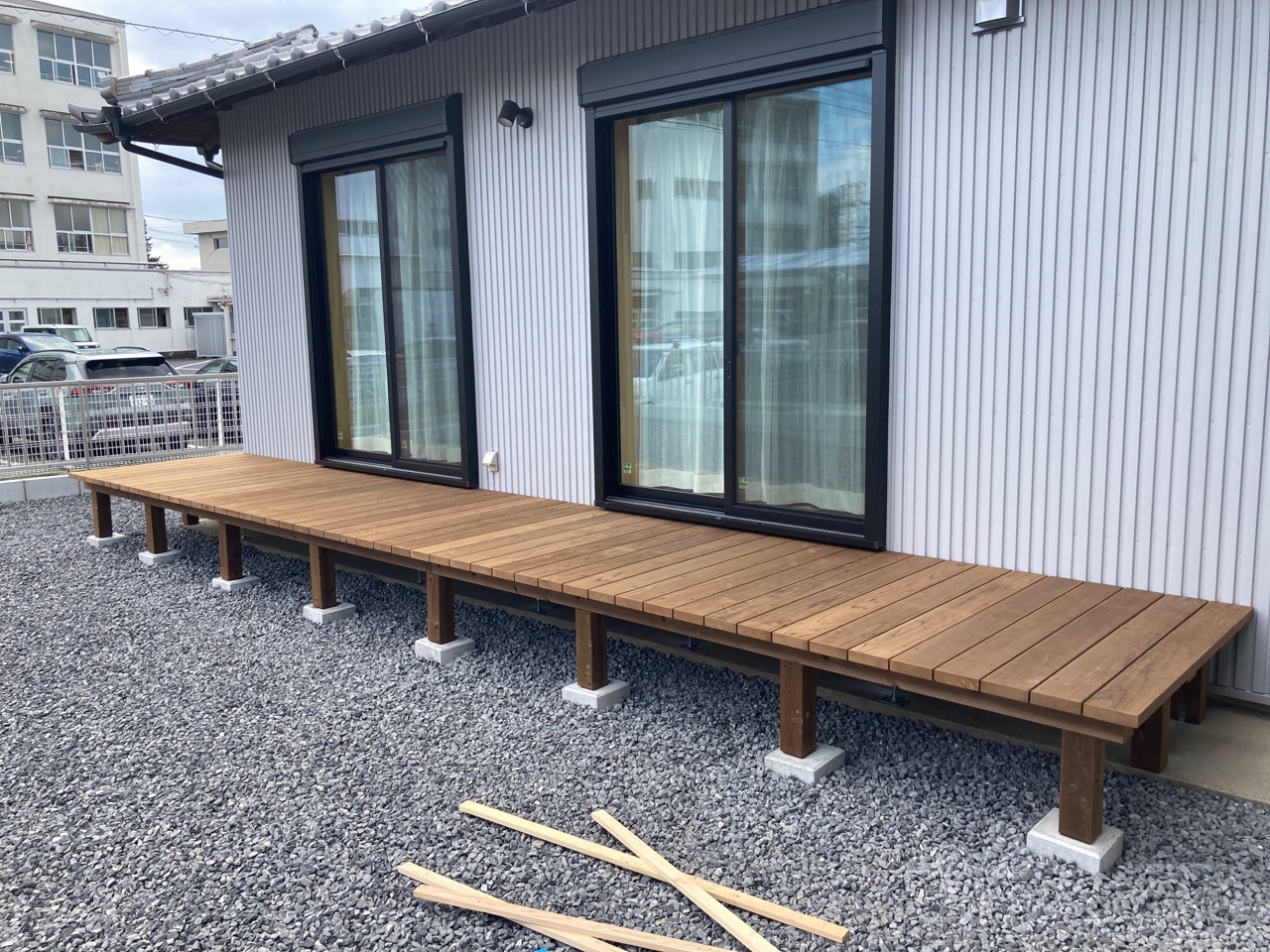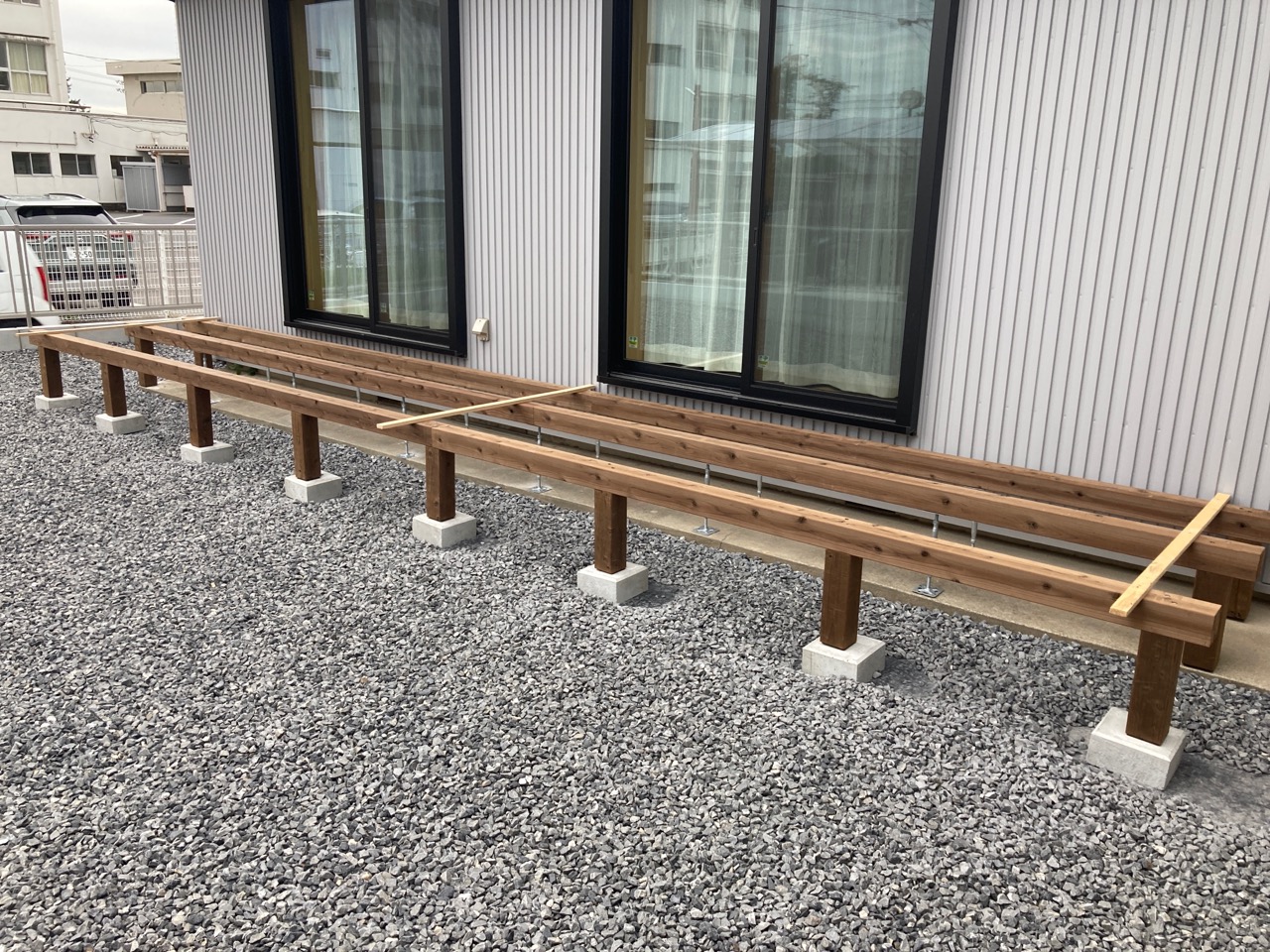 長くかかったリフォームの最後の工事、掃き出し窓前のウッドデッキの制作に取り掛かりました。簡単な形状のデッキですが、何より距離が長いので材料も大量に必要です。