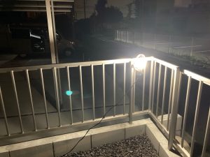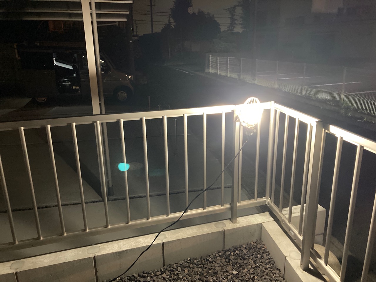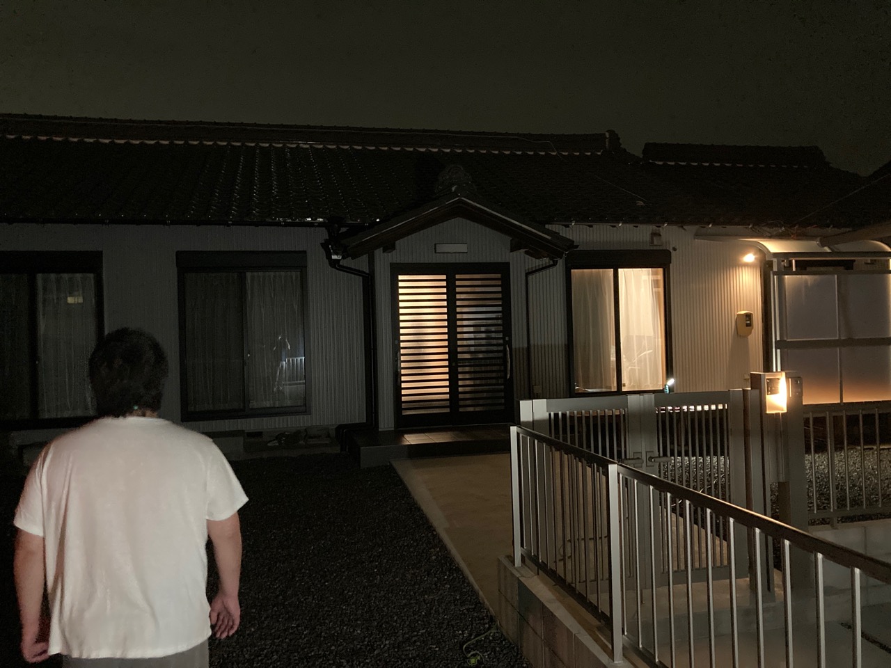 諸事情あり、リフォームの完成を前後してしばらくこの家を離れていたi様ですが、約2か月ぶりに戻ってこられました。今回は外構の各箇所にエクステリアライトを計画したいとの事で、実際に各所に照明を焚くとどれくらいに見えるのかを検証しにうかがいました。・・という事で日が落ちてから手持ちの投光器を焚いてみてだいたいのイメージをつかみます。夜になると外灯も少なく人通りが全くなくなるので、このようにエクステリアライトが煌々と灯っている住宅があると少し安心します。
