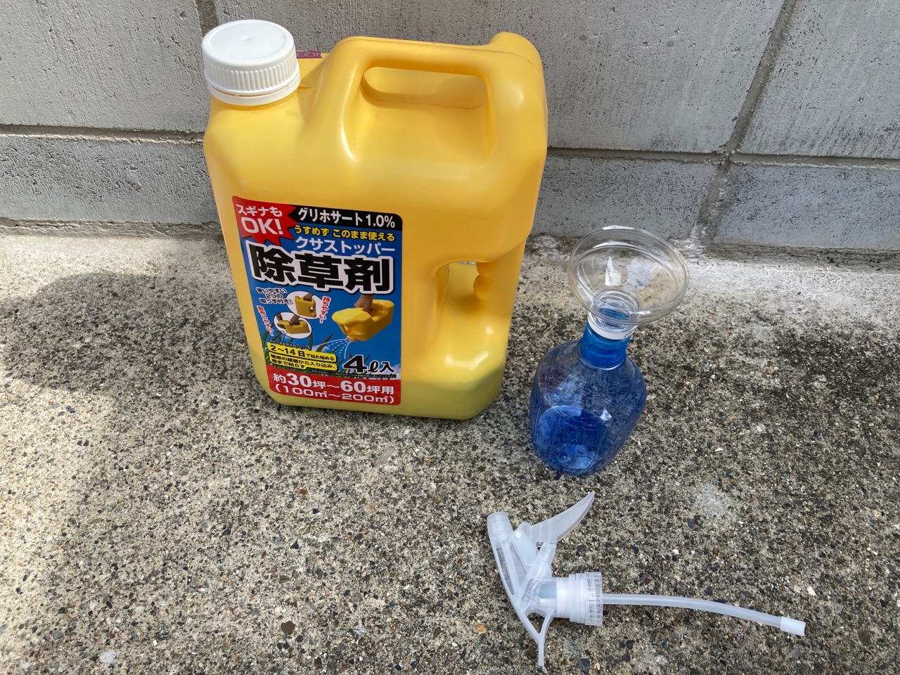 先日屋根垂木の間から生えていた雑草を速やかに撤去したところに除草剤を散布します。屋根の勾配があり容器を逆さにして流し込むのは不可能ですので、百均で霧吹きを購入。漏斗も一緒に購入するのを忘れたのでペットボトルの口を切り取って漏斗代わりにしました。無事に霧吹き完了。根っこまで散布できる訳ではないので、もしかしたらまた生えてくるかもしれません。