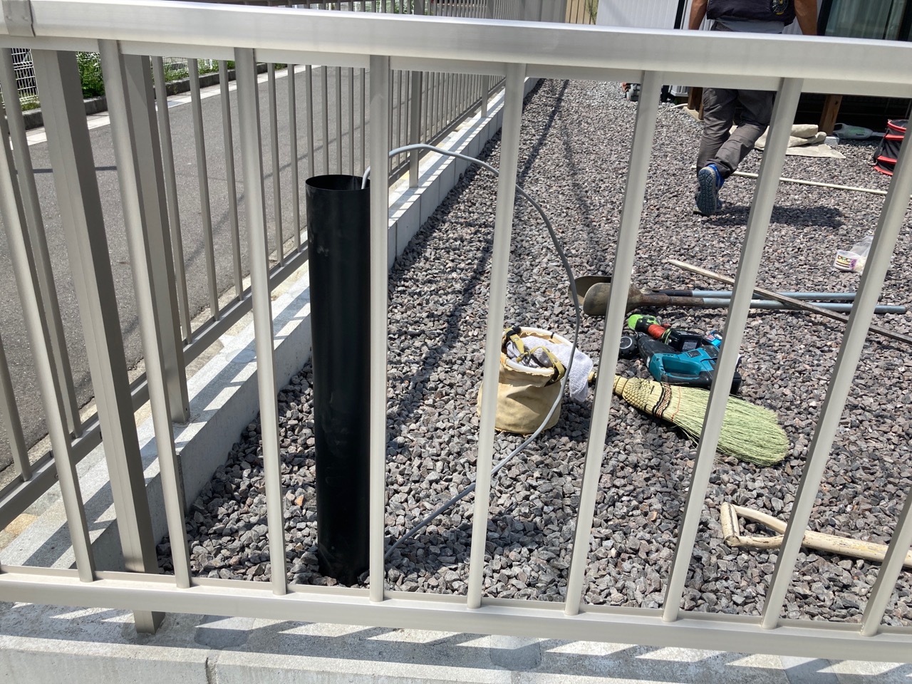 境界のブロックにアルミフェンスを建てたいとの事で取付工事にうかがいました。すでに天端をモルタルで固めてしまったブロックにどうやって支柱を差すか? コア抜きドリルを使用して円形の穴を開けていきます。円形の歯が滑らかに入っていくようにホースを接続し散水しながら開口を行う湿式工法です。世の中には便利な道具があるものです。