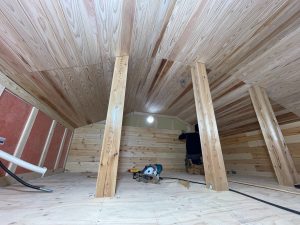 小屋裏収納用のハシゴも付けられたので、応援で来ているk保木大工さんは材料を運びあげ、手際よく壁・天井の杉材の羽目板を張っていきます。