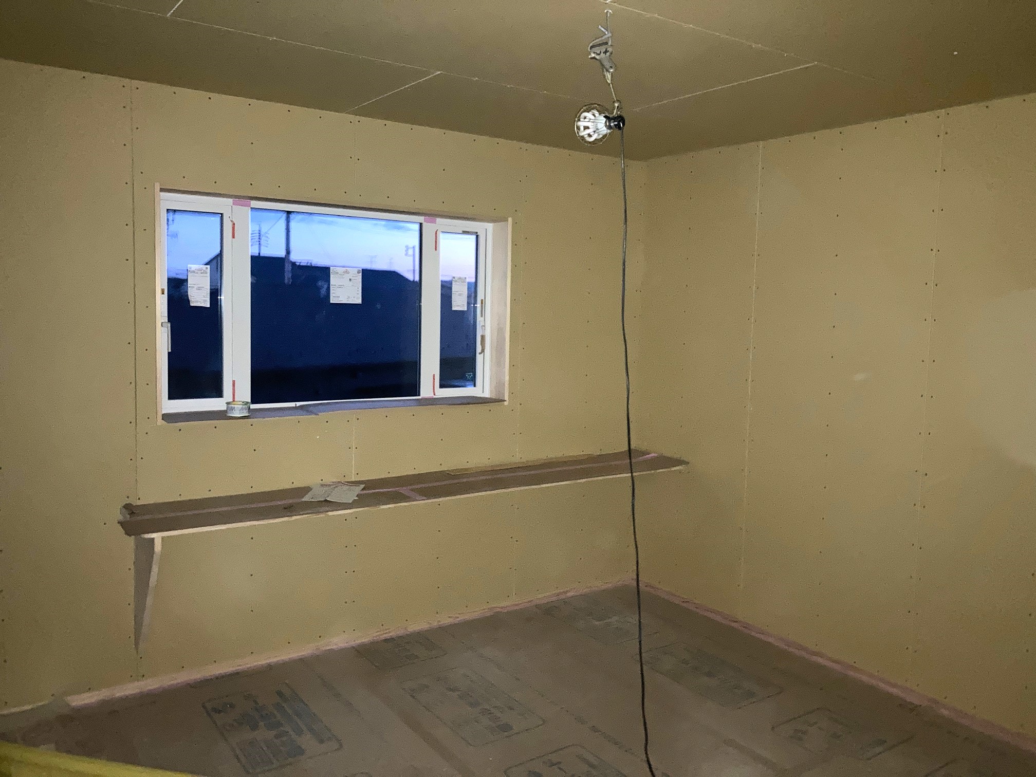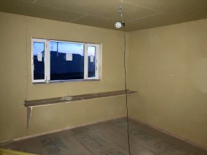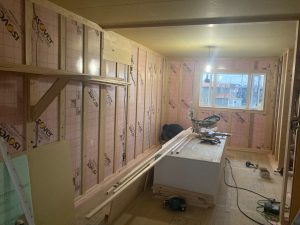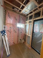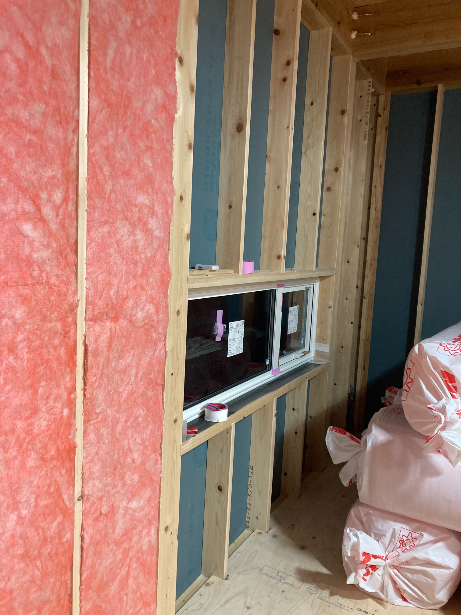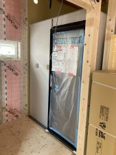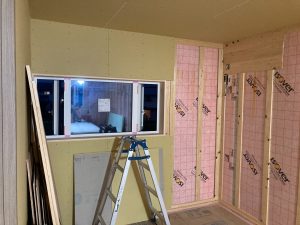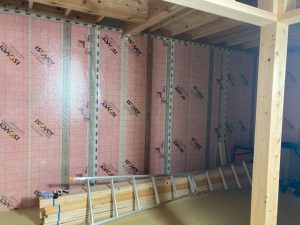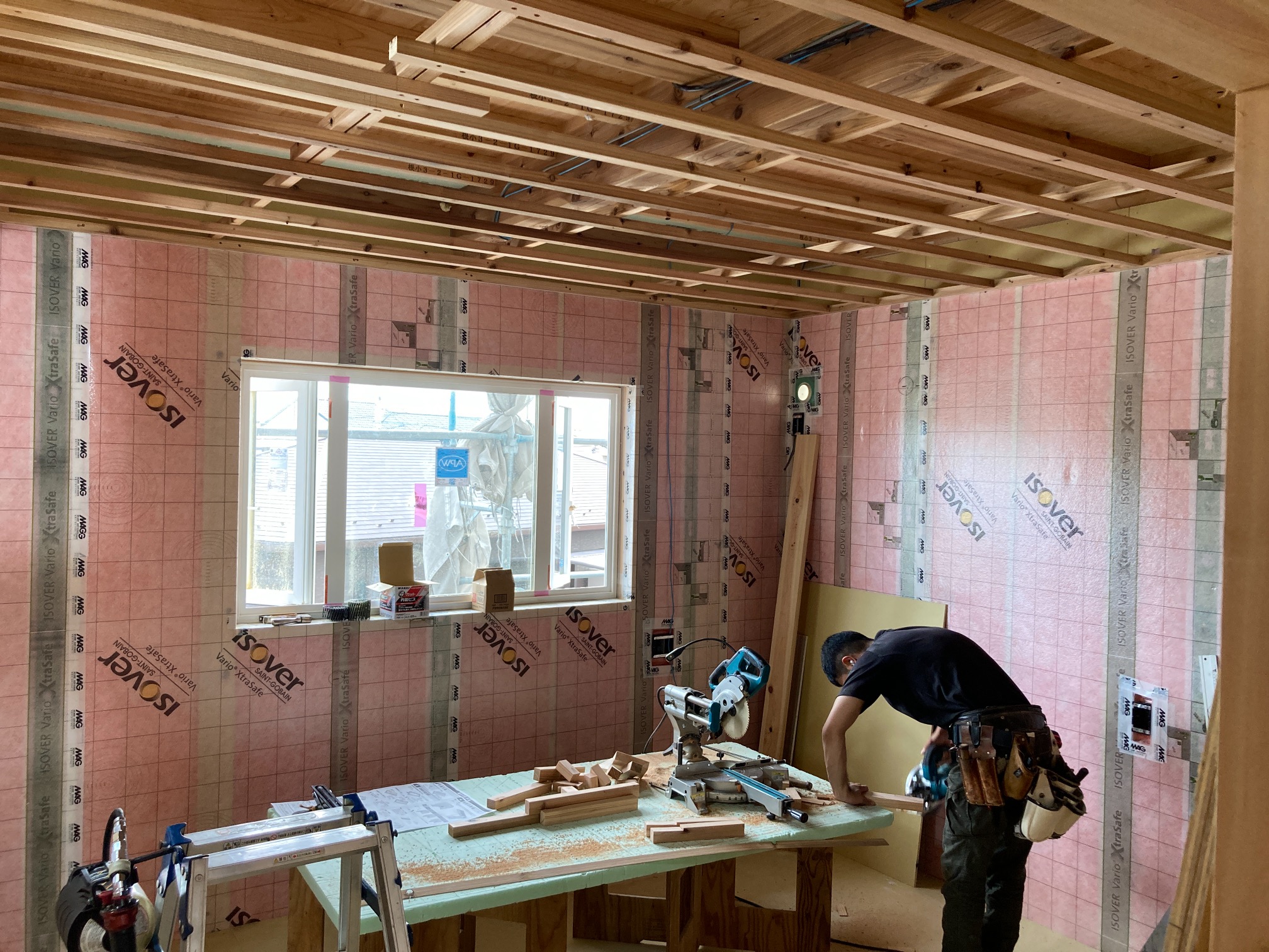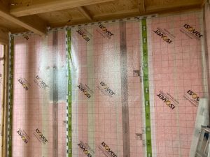 室内は高性能グラスウール120㎜を充填し気密シート・気密テープを施していきます。シートがピシッとしていて気持ちいがいいです。