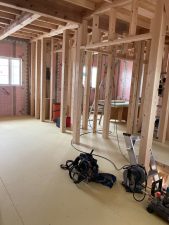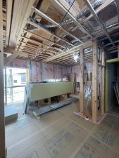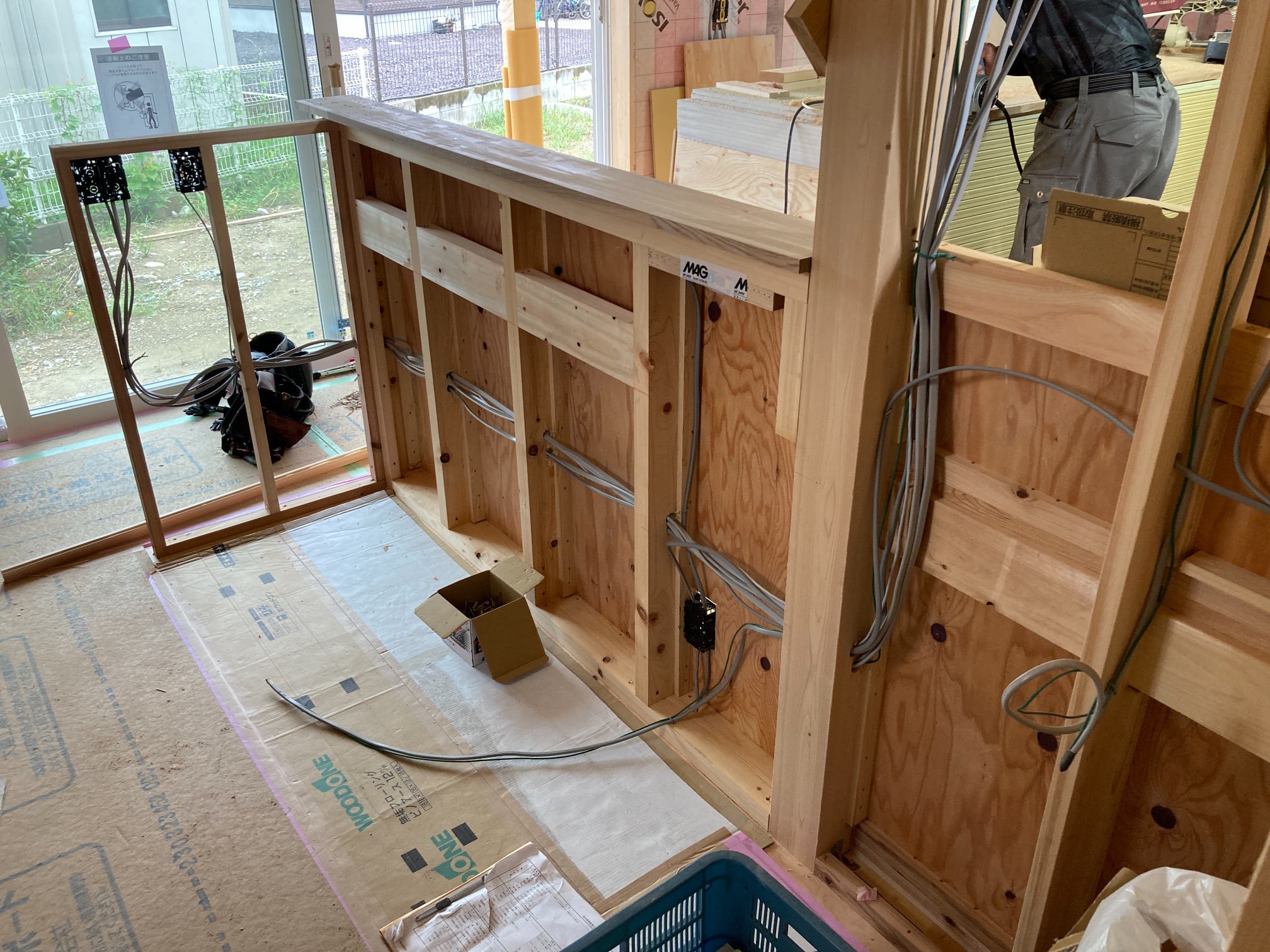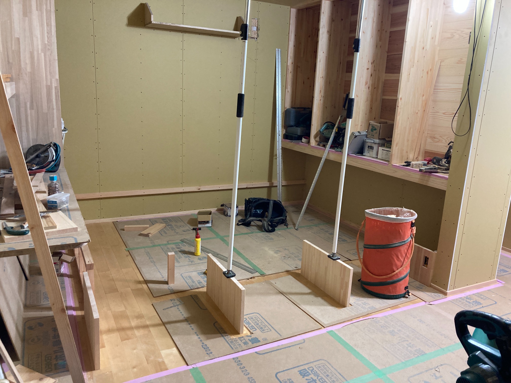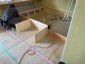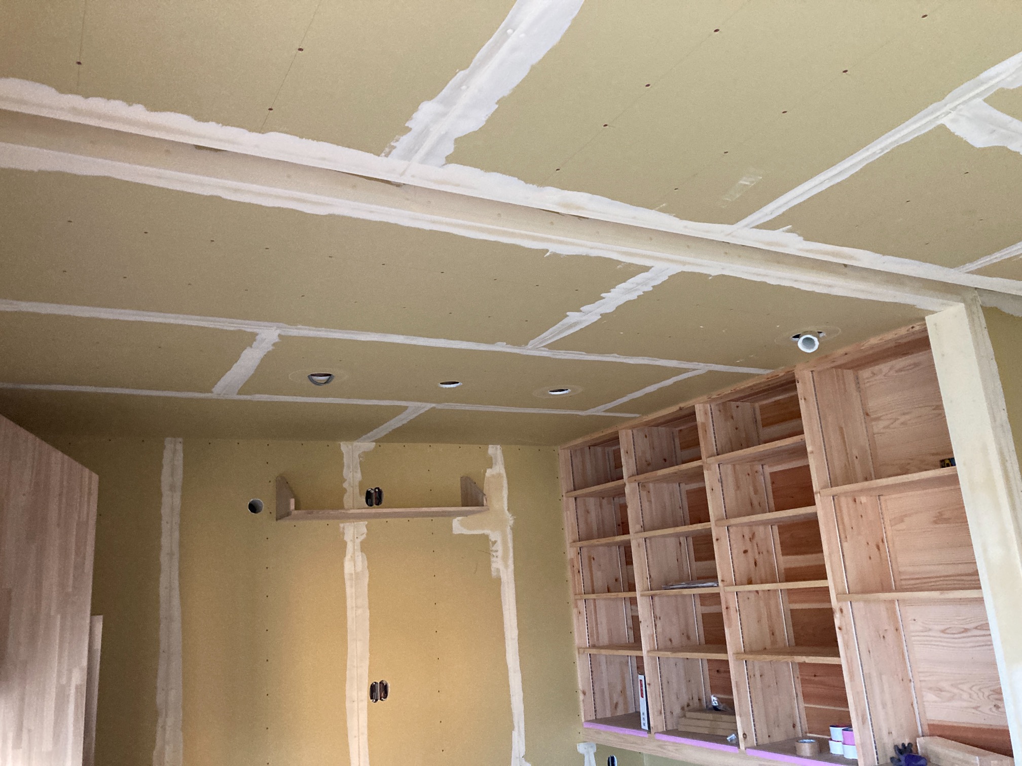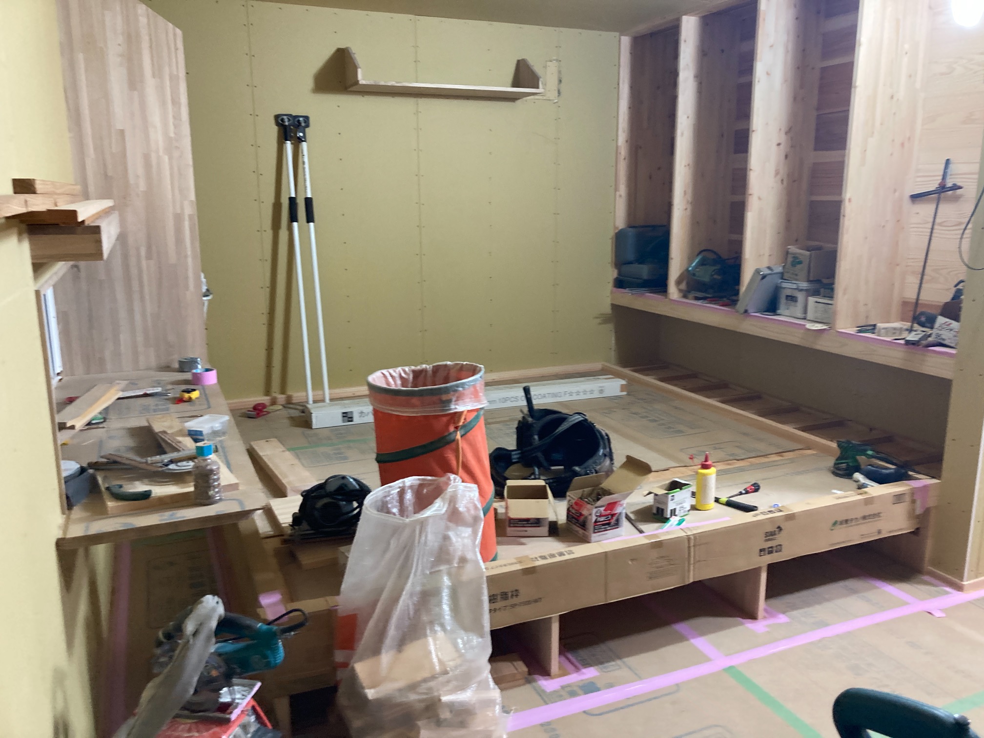 1階の壁・天井のプラスターボード張りを完了し、w邉棟梁は小上がりのタタミコーナー下地を造作中です。手前のダイニング側はオープンスペースとし、収納も兼ねています。