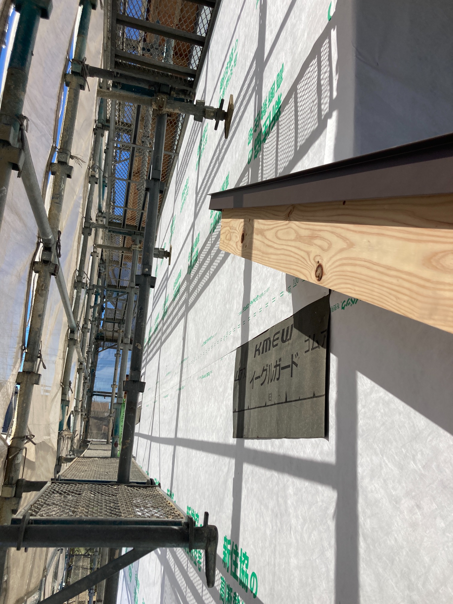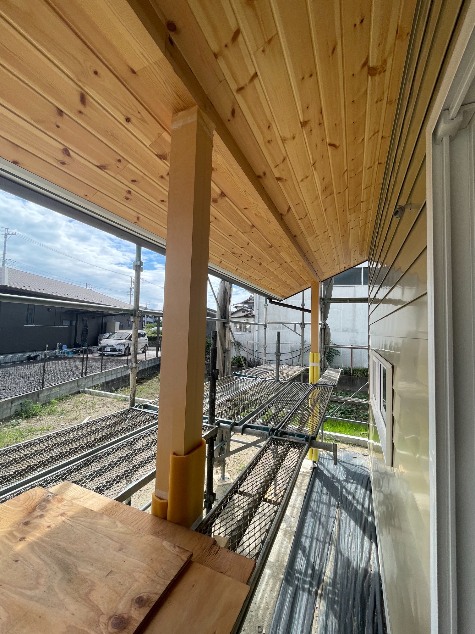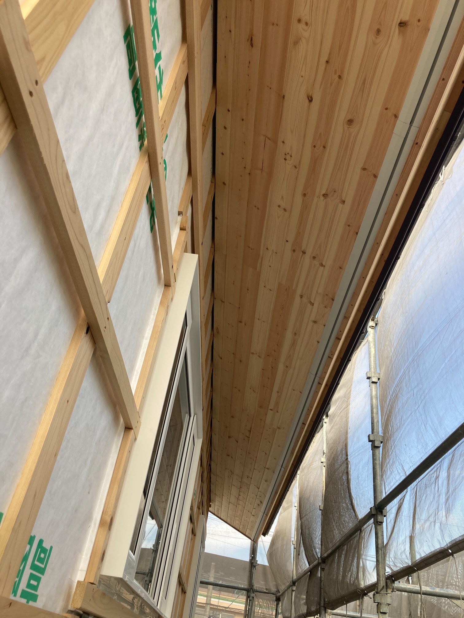 外壁には通気胴縁、下地胴縁が取り付けられ、この上からガルバリウム鋼板が施工されます。軒裏は2階フローリングを同じくパイン材が張られました。