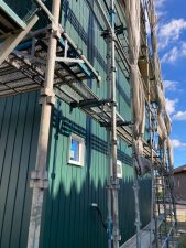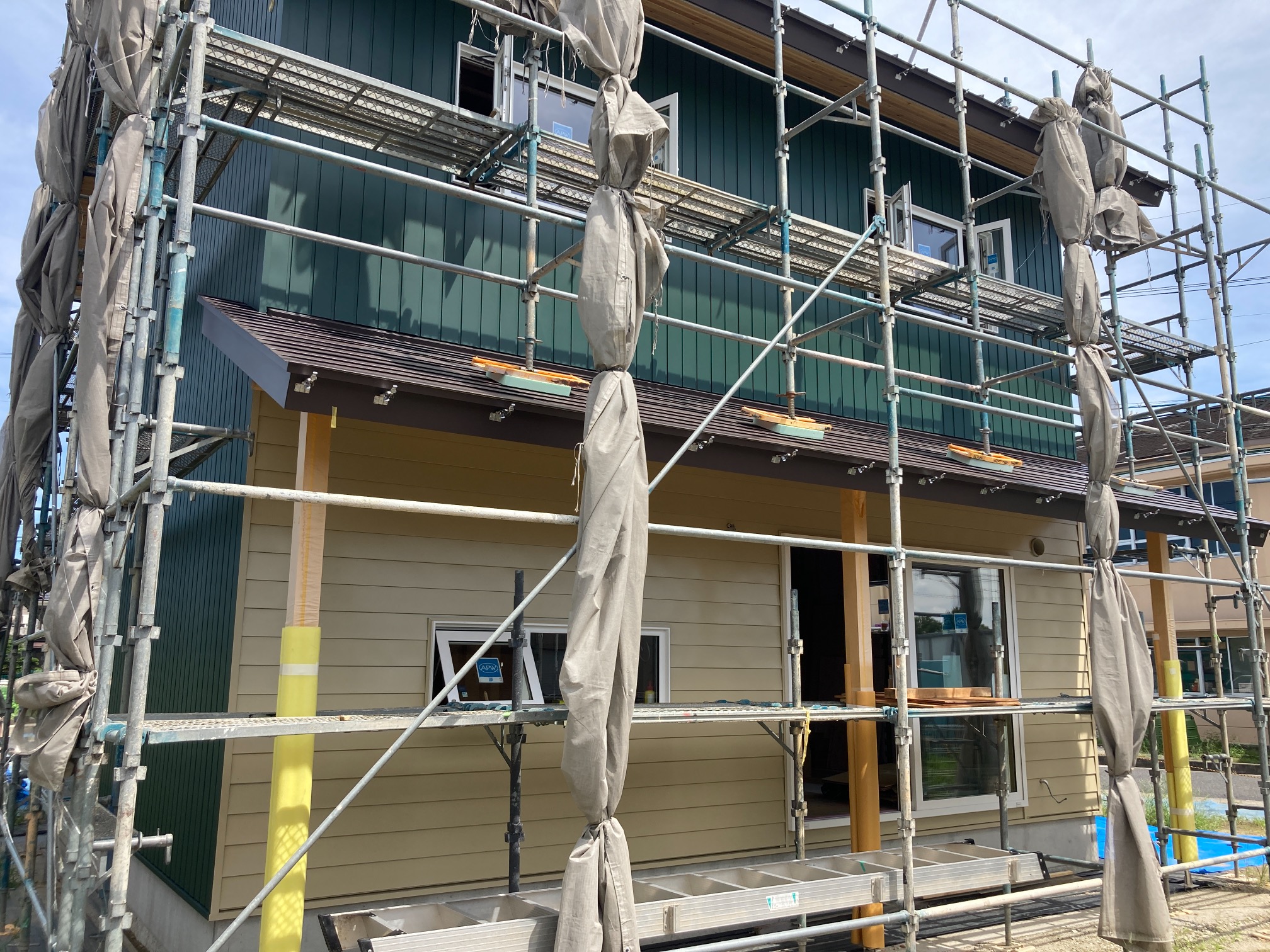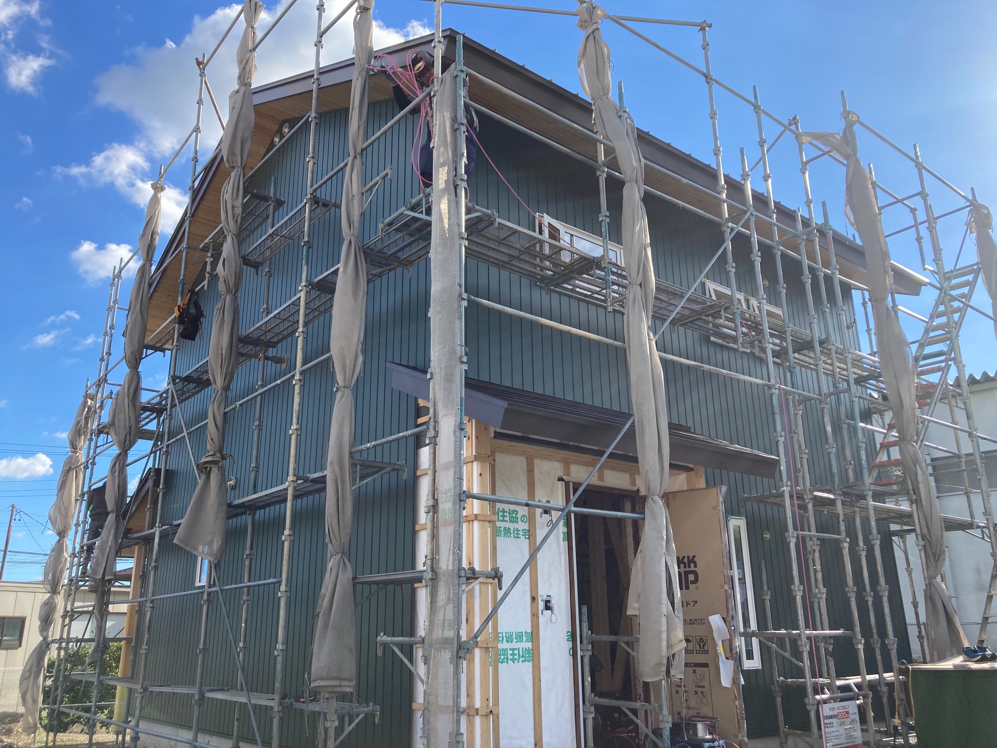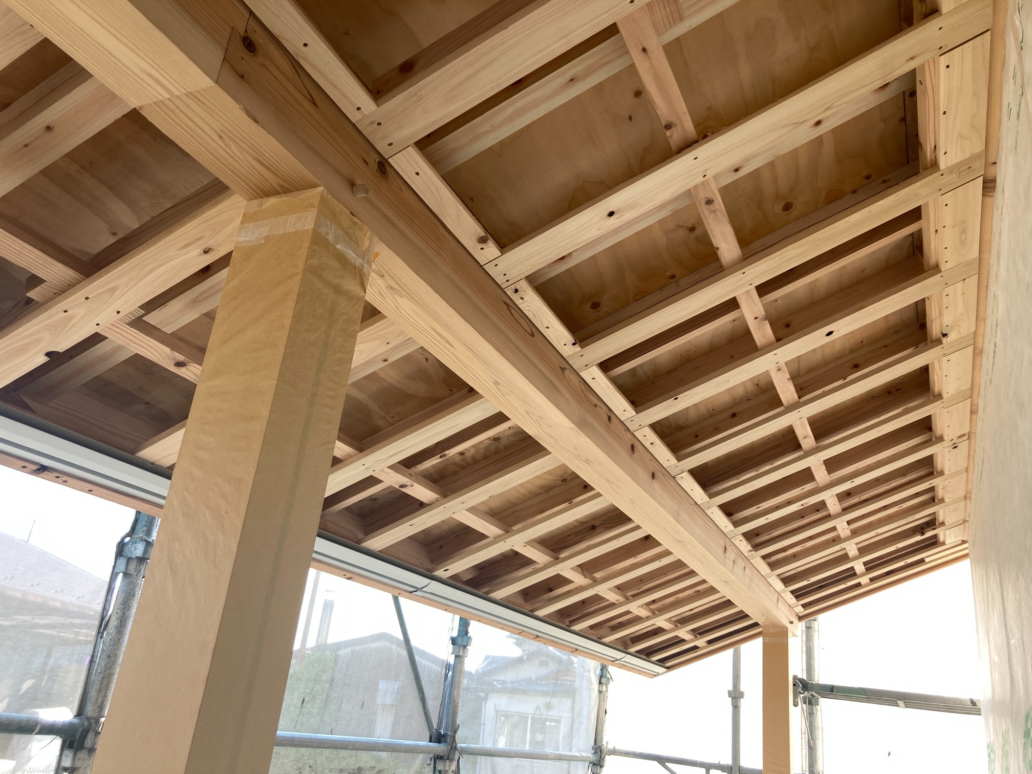 外壁には通気胴縁、下地胴縁が取り付けられ、この上からガルバリウム鋼板が施工されます。軒裏は2階フローリングを同じくパイン材が張られました。