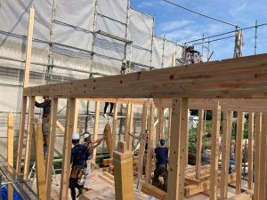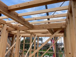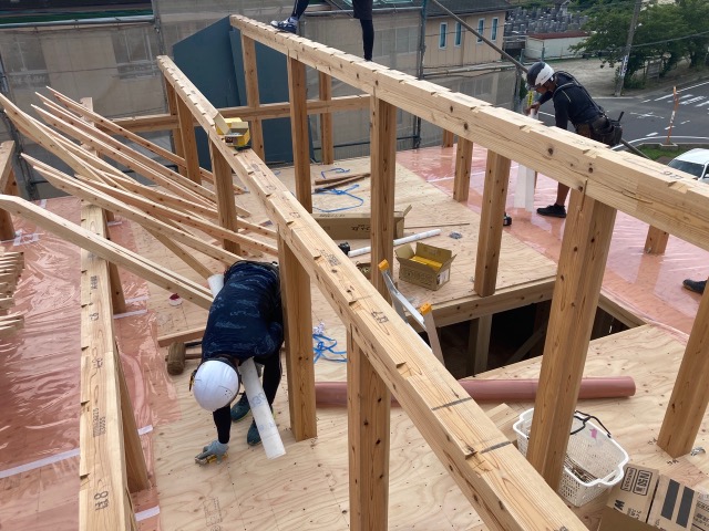 上棟日は気温も35度近く上がり、大工さんは空調服を着るなど対策して作業を進めます。