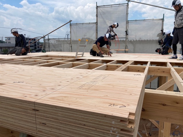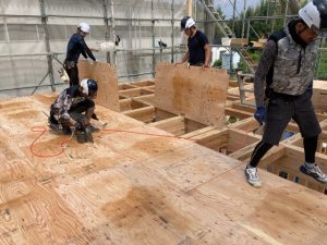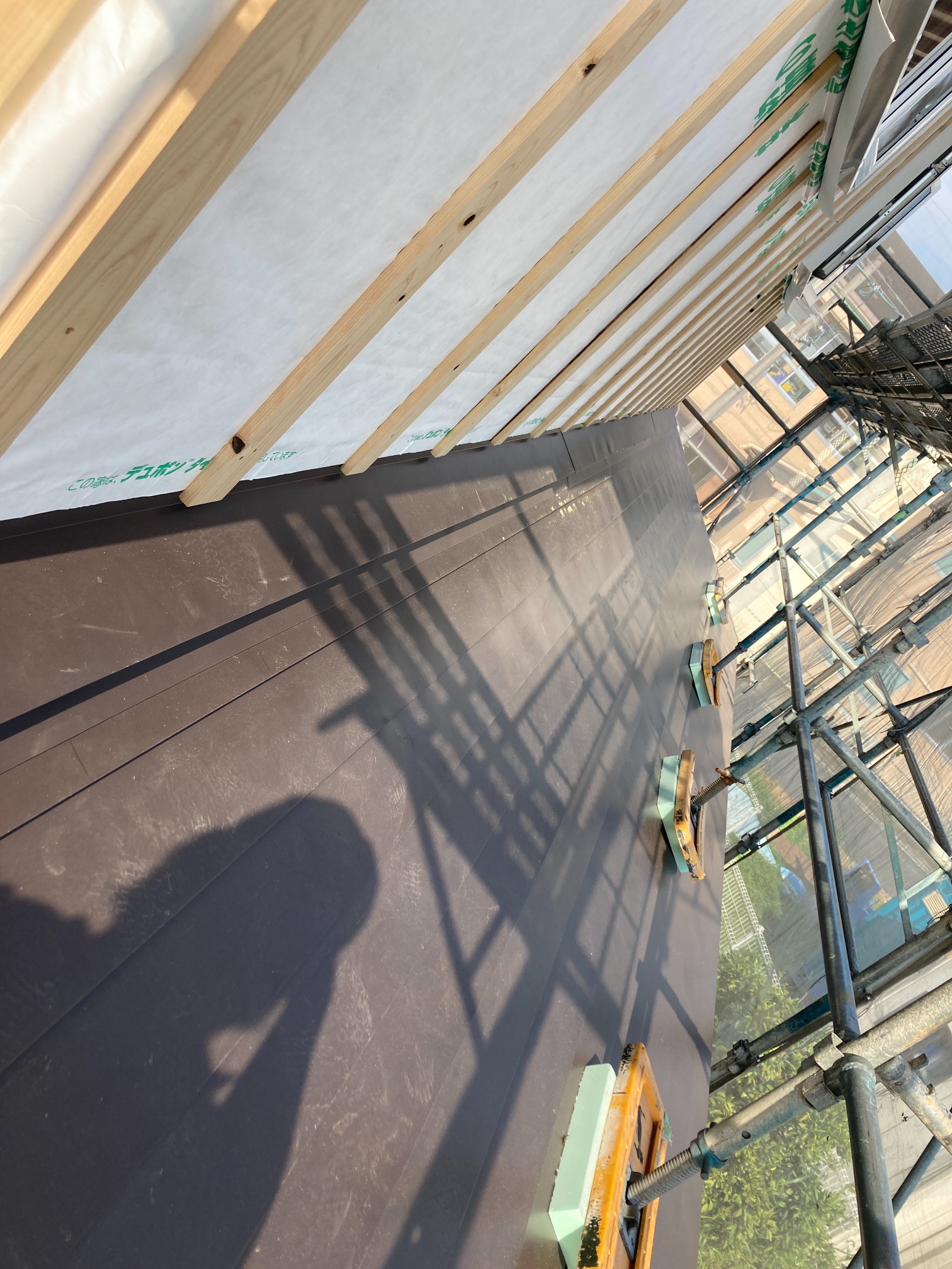 午後から少しの時間雨に降られましたが無事屋根のルーフィングまで仕上げることができました。この後の連日の猛暑ですっかり水気も飛んでくれそうです。