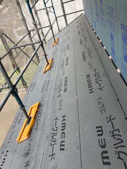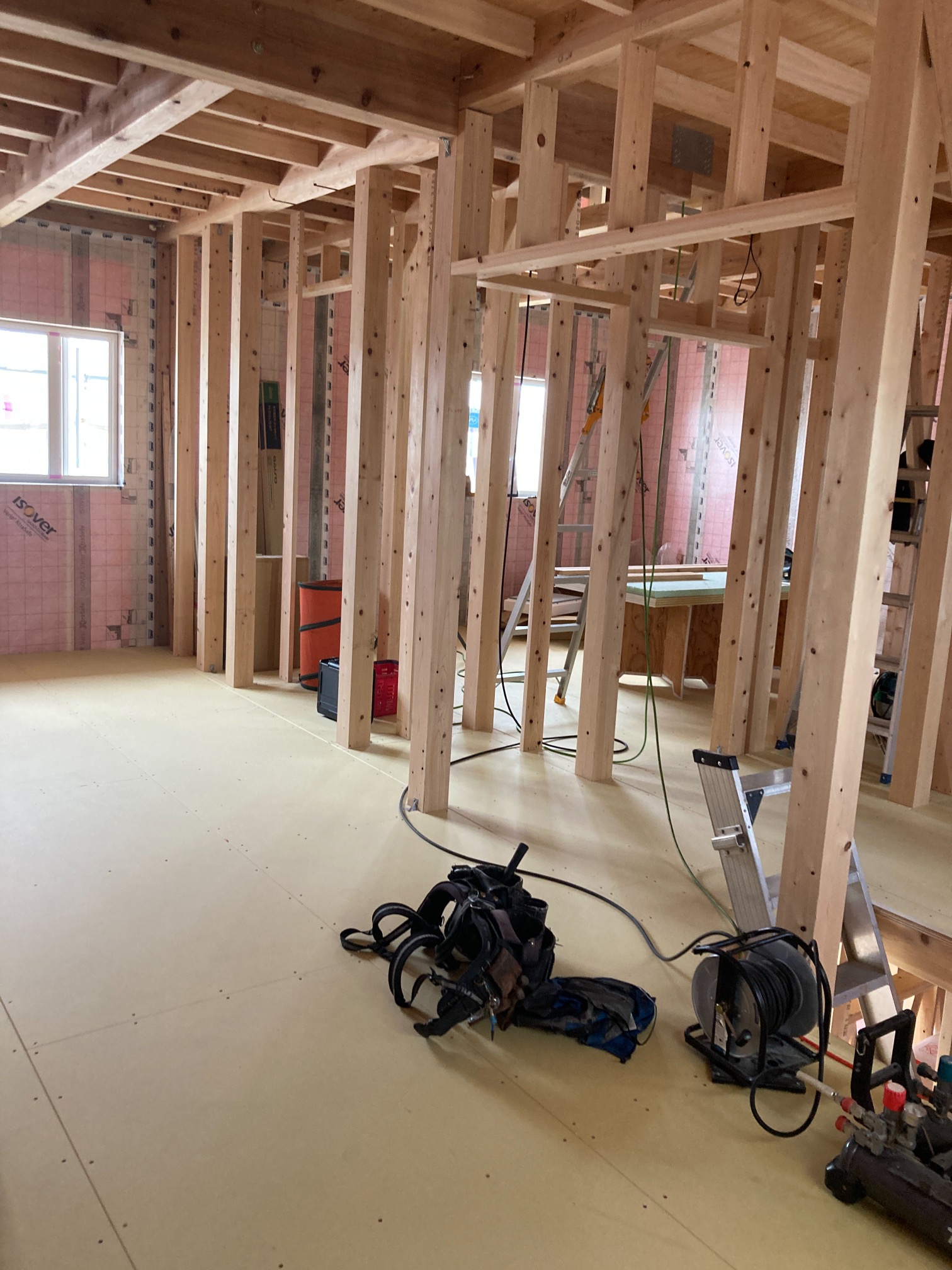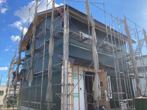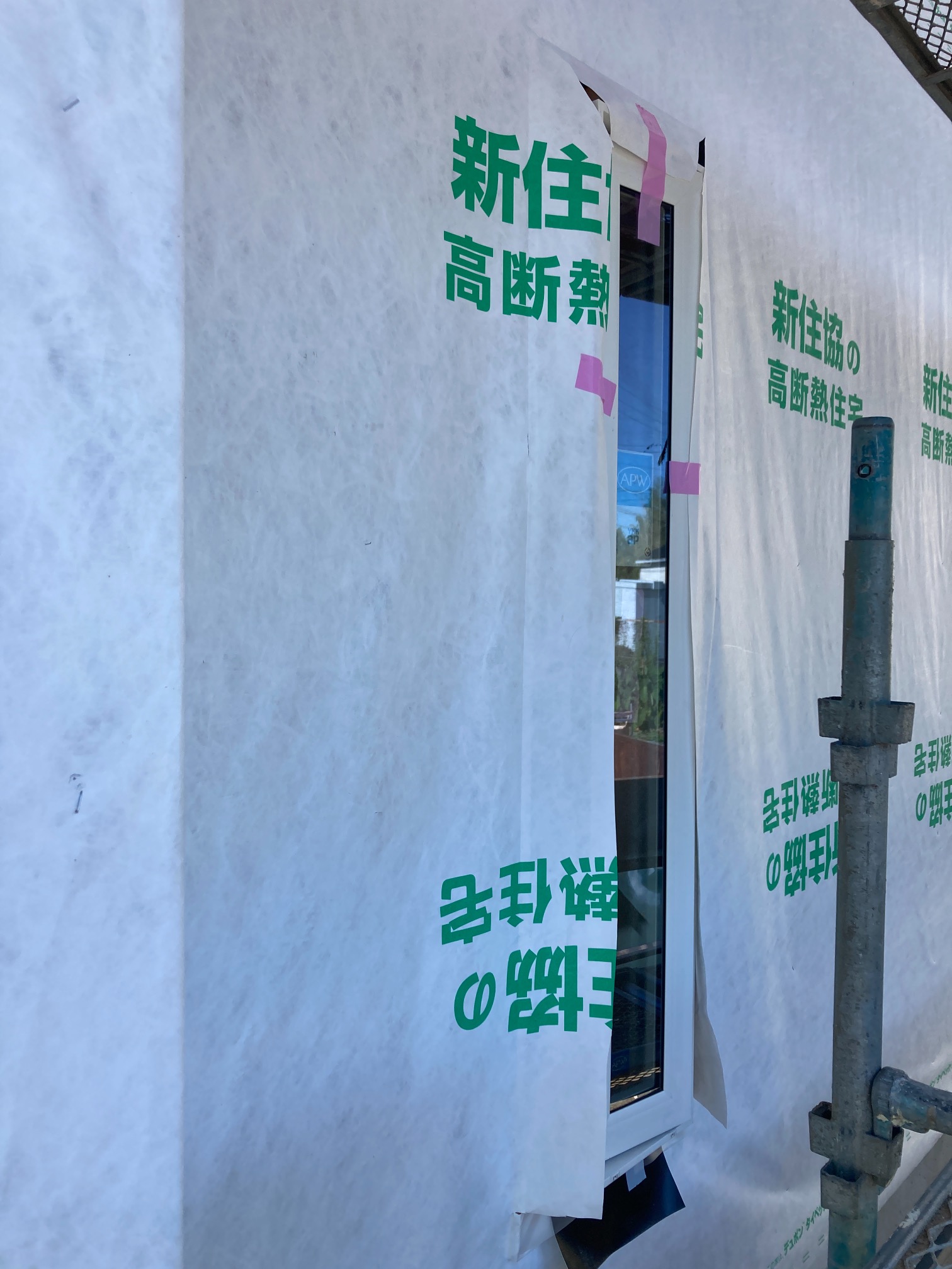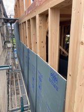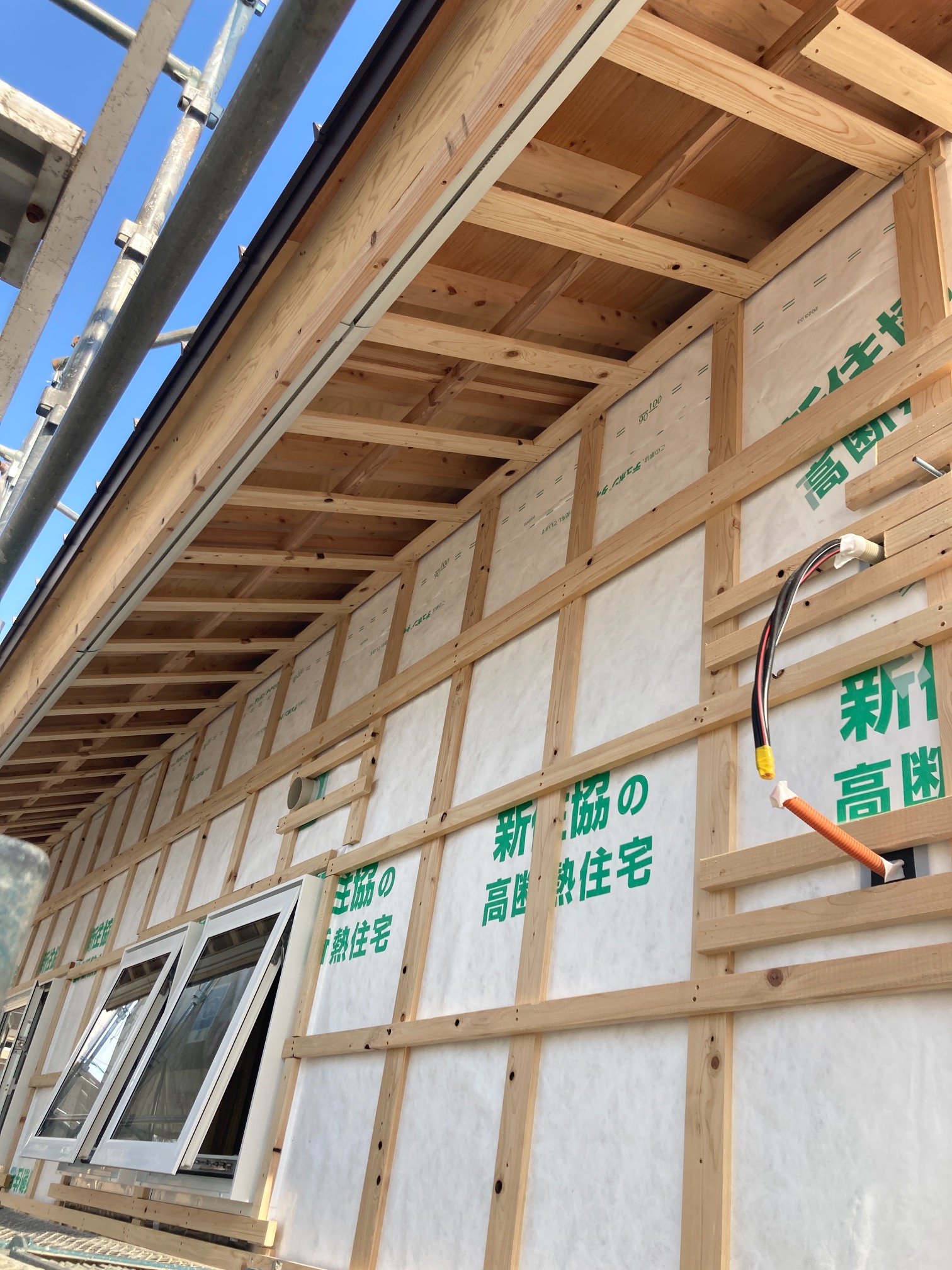 中間検査も無事に終わり、外部は体力面材の上から透湿防水シートが貼られました。