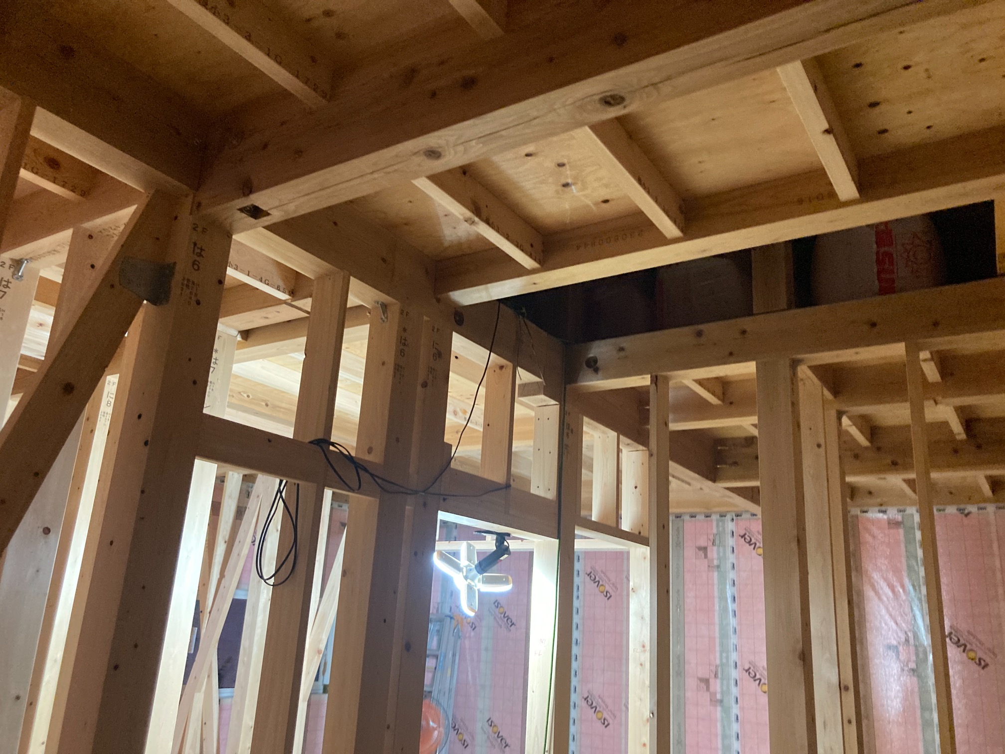 後日金物も取付けられ、建物が完成すると確認できなくなる基礎・壁や筋かい・接合金物・屋組みなどが正しく施工されているかチェックする中間検査を行いました。