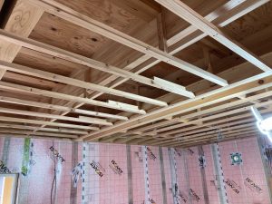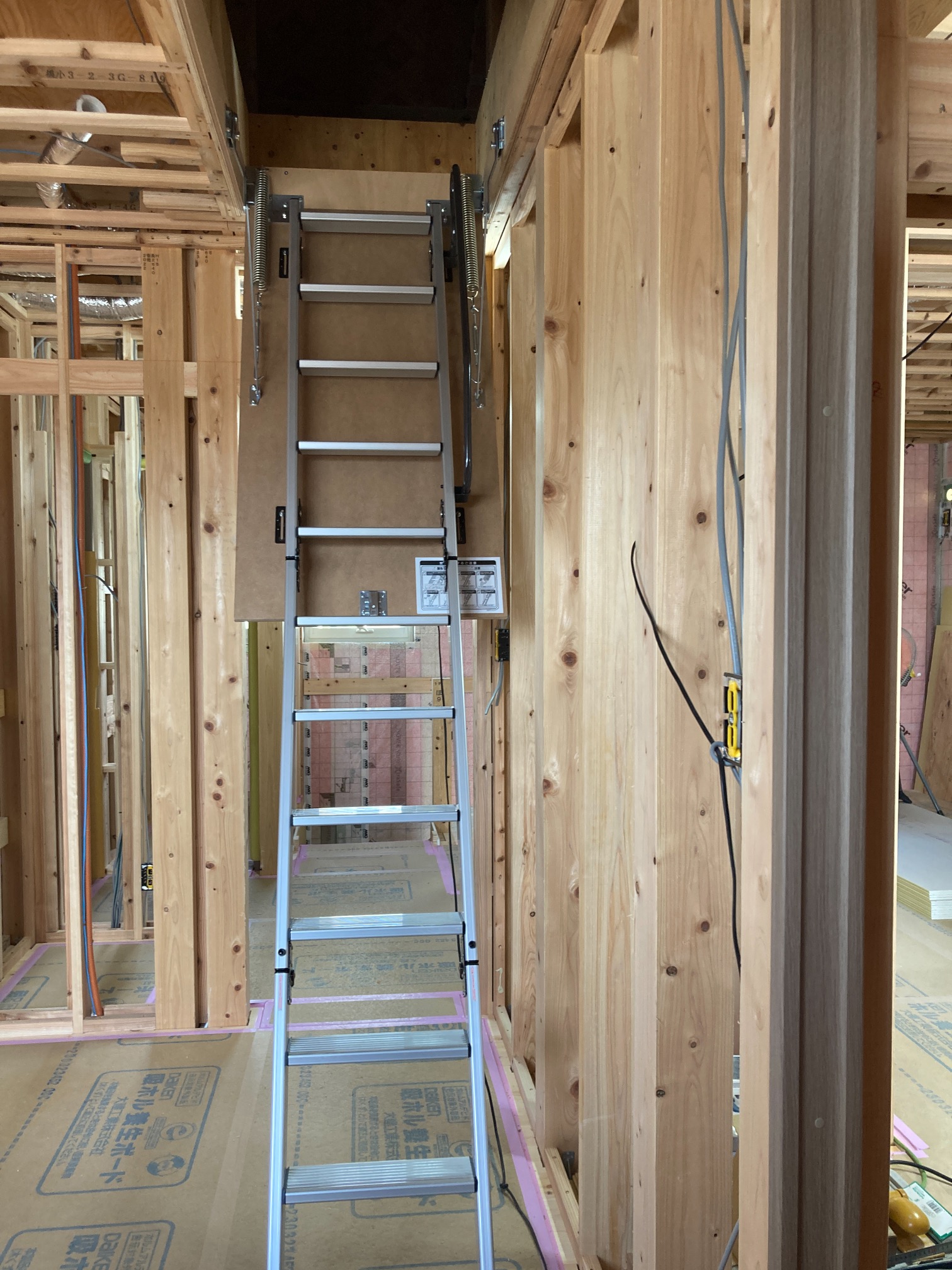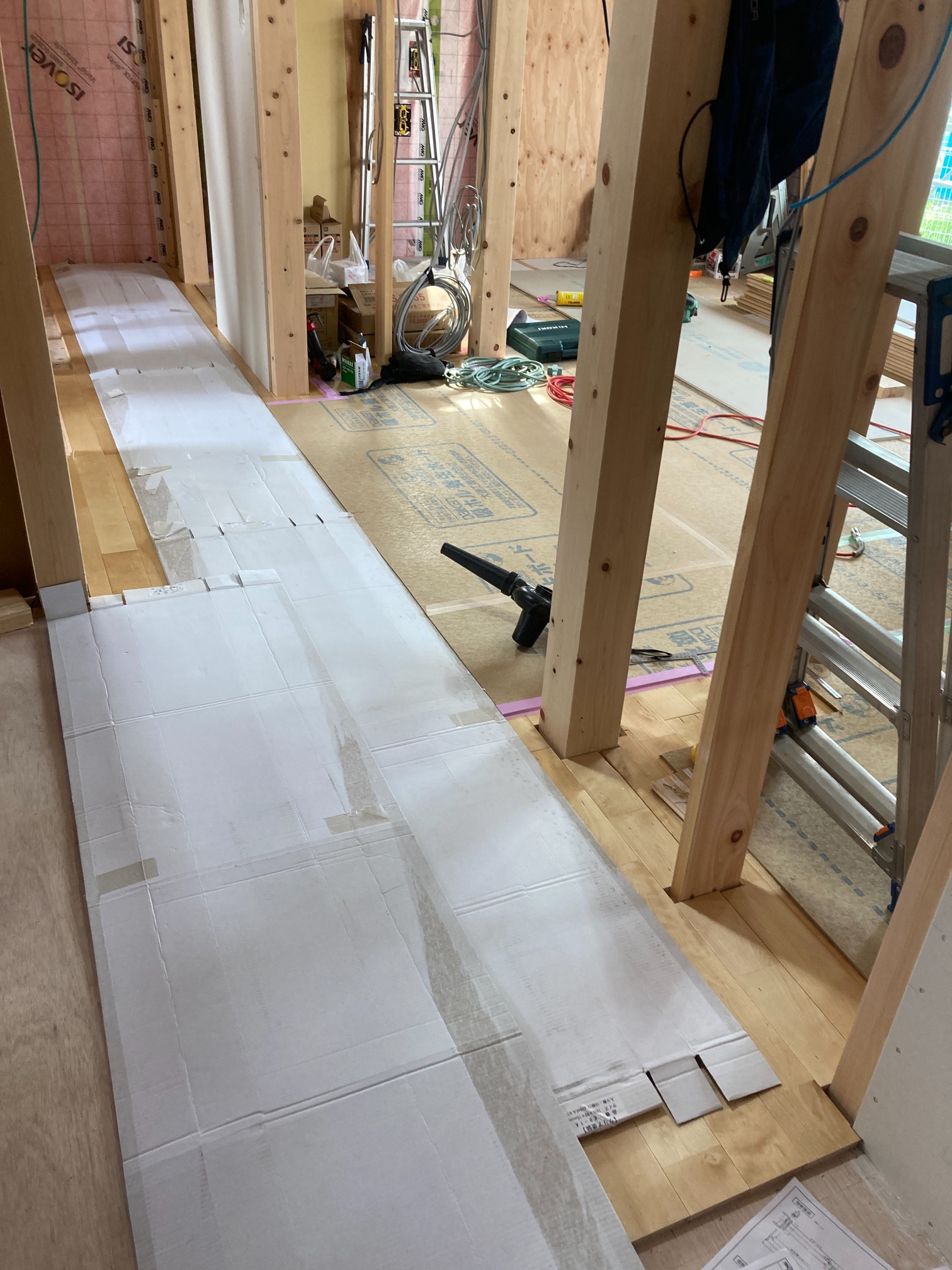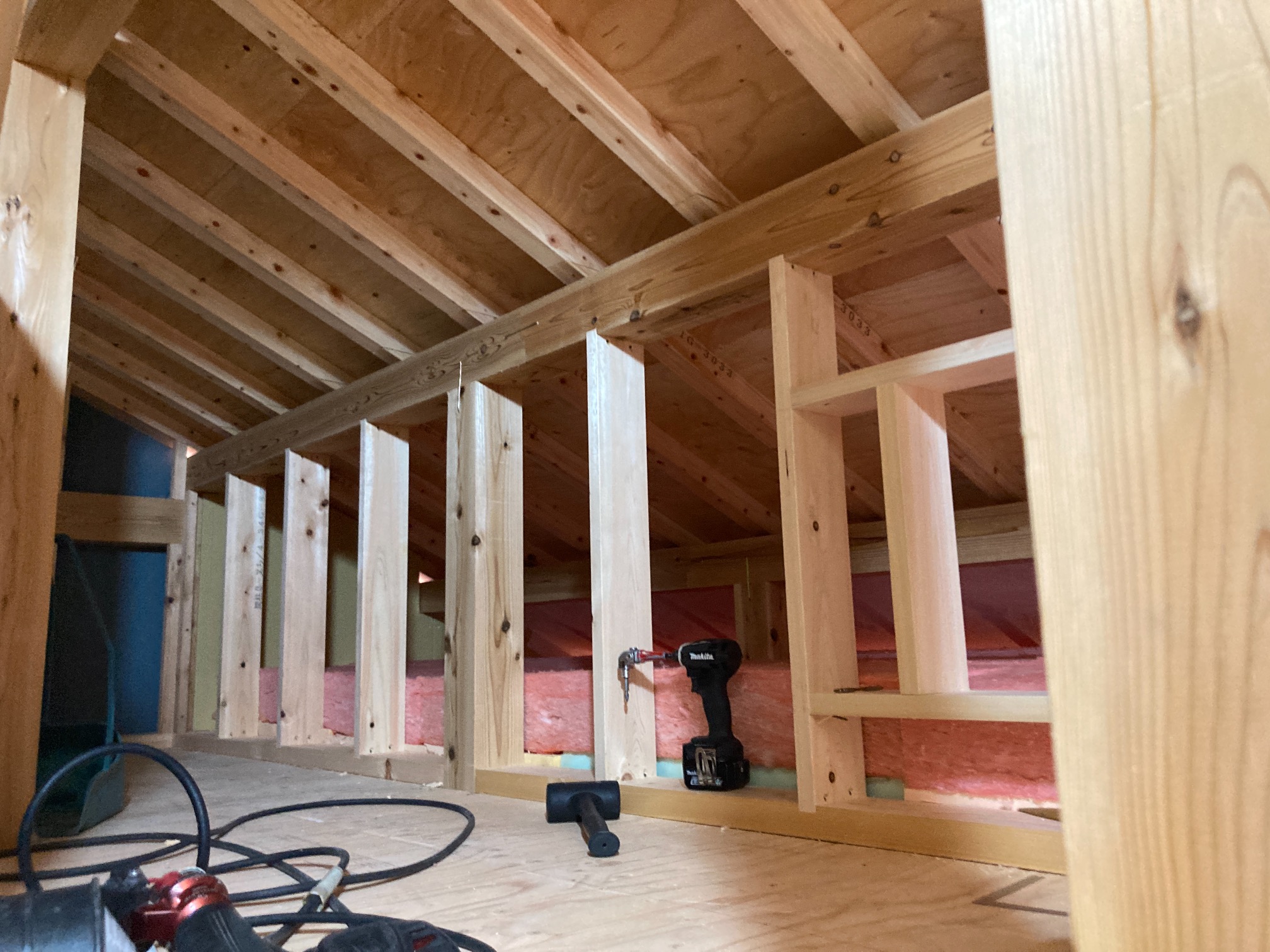 室内は2階天井と小屋裏の間に断熱材が敷かれました。小屋裏収納部分は室内と同じ環境にするため屋根・壁を断熱材でぐるっと包み込みます。2階は床プラスターボードが敷かれ、この上にパイン材のフローリングが張られていきます。