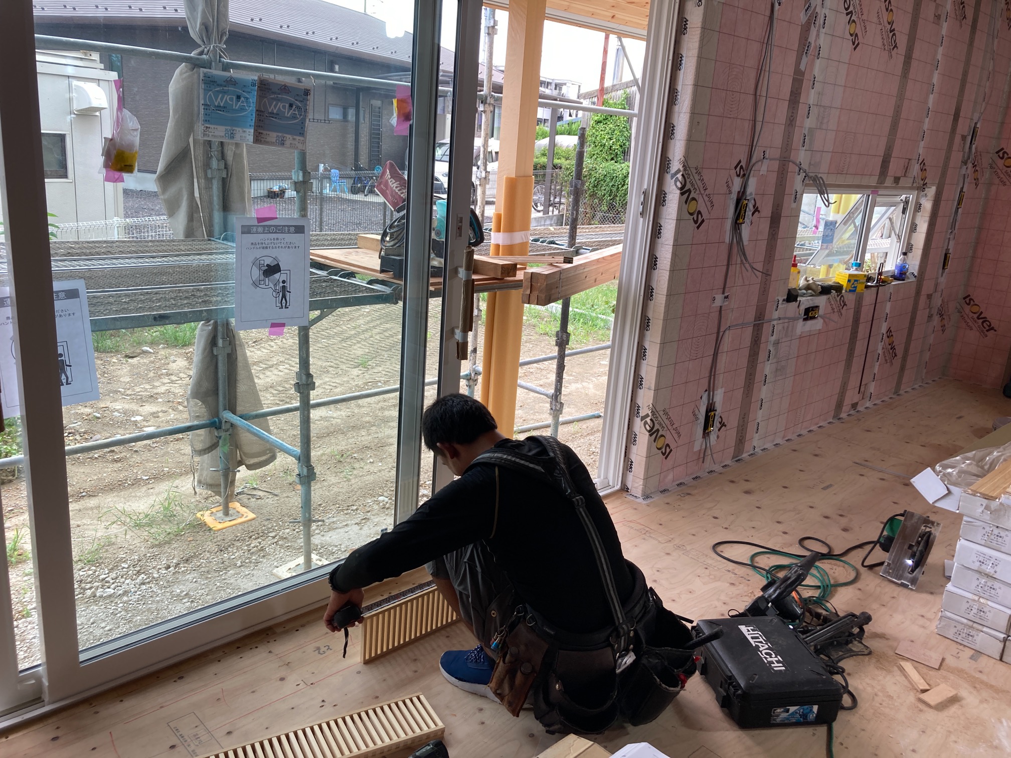 w棟梁が寸法を測っているのは床に取り付ける通気ガラリです。