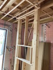 クロス工事後に取り付けられるタオル掛けやペーパーホルダー、エアコン取付壁にはもしっかり下地が入れられています。