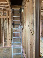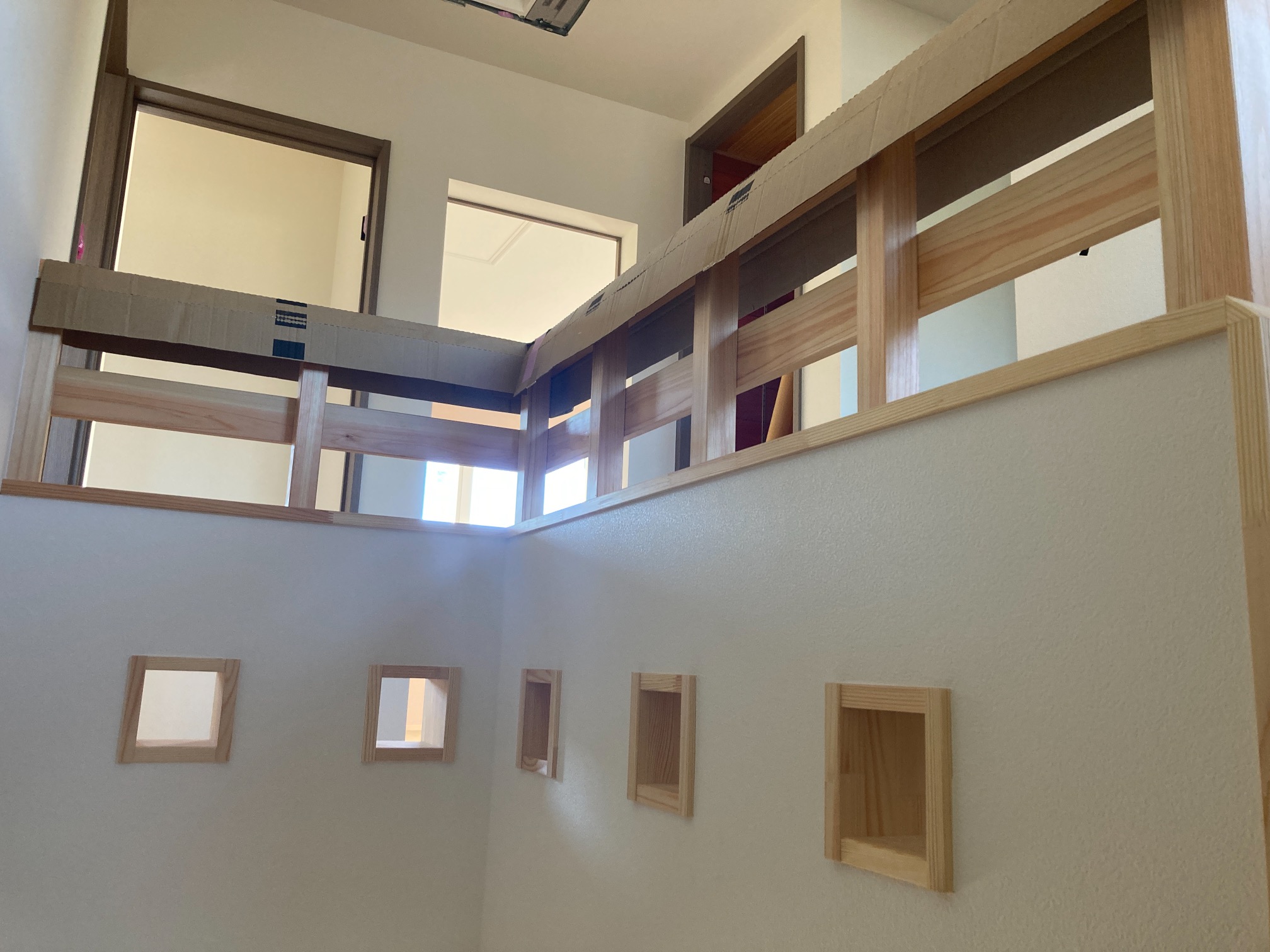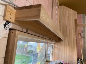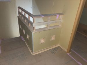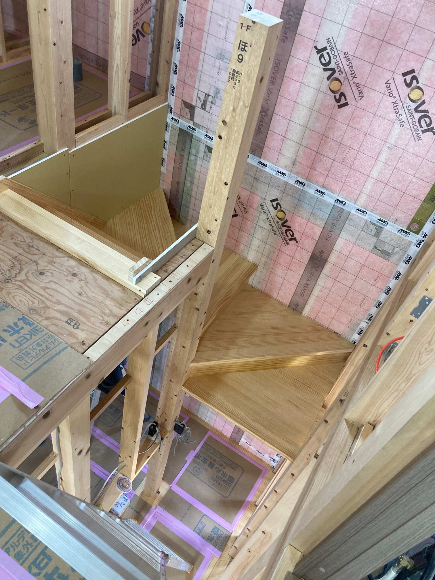 w邉棟梁は棚や手摺などの造作が終わり、2階のプラスターボード張りを進めています。