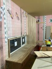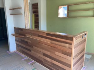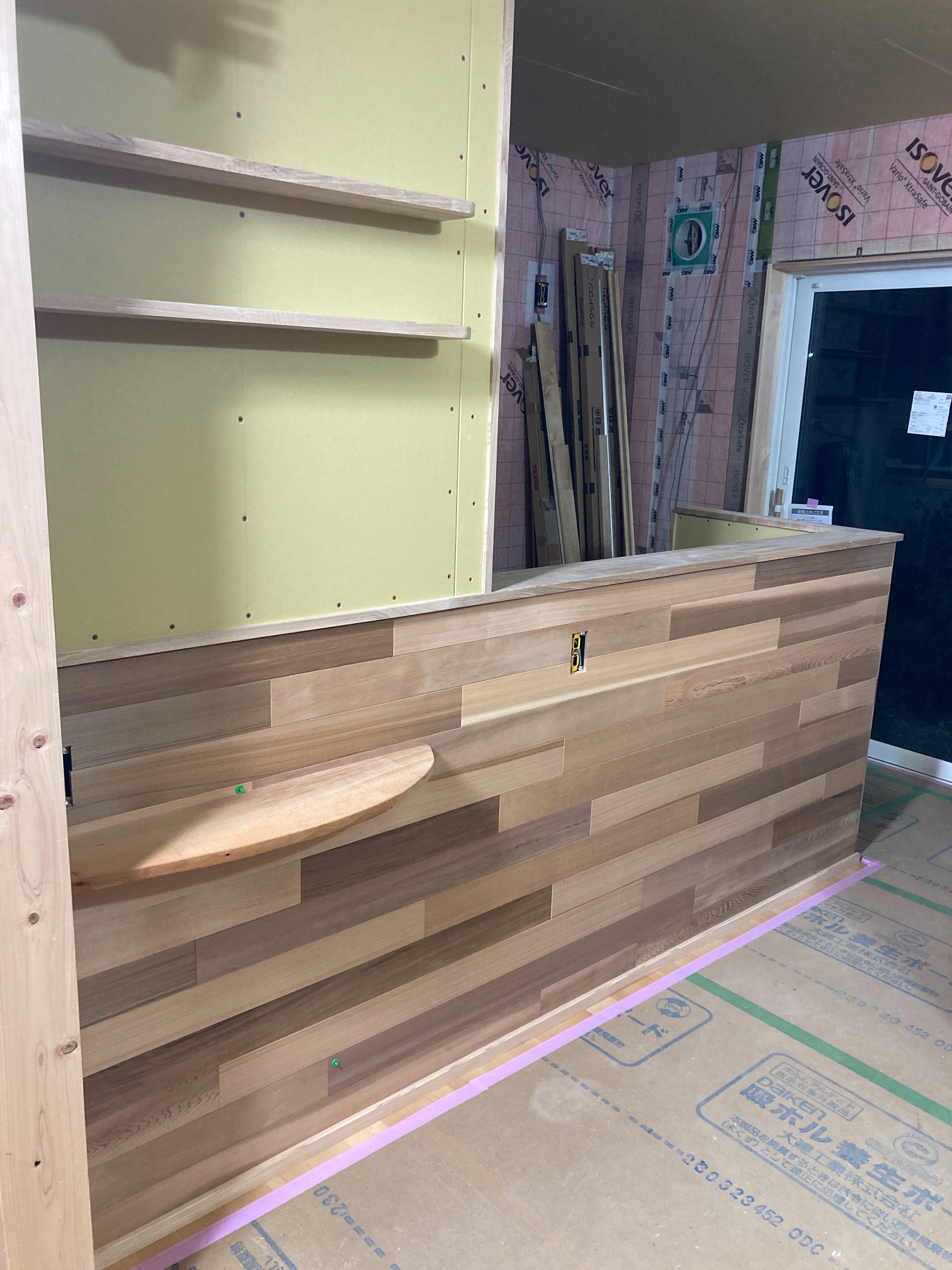 キッチン裏側のレッドシダーが張られました。同じ樹種ですが色味が様々なので他所の木材とも合わせやすく、アクセントになります。