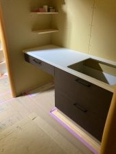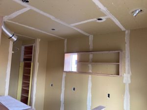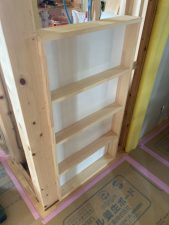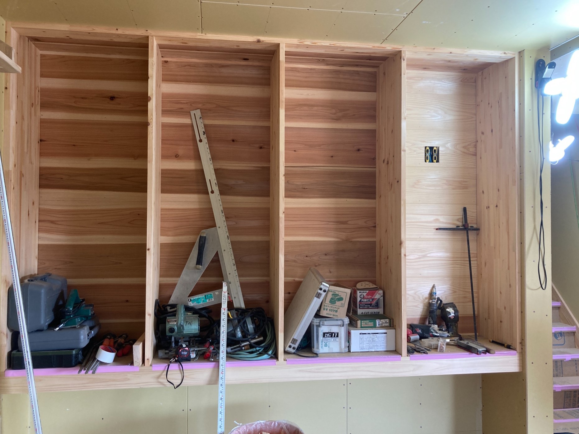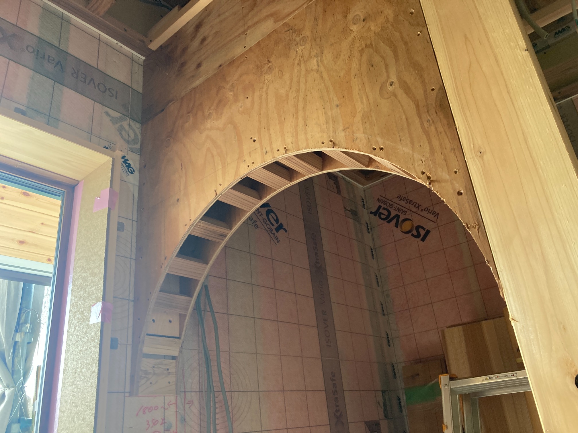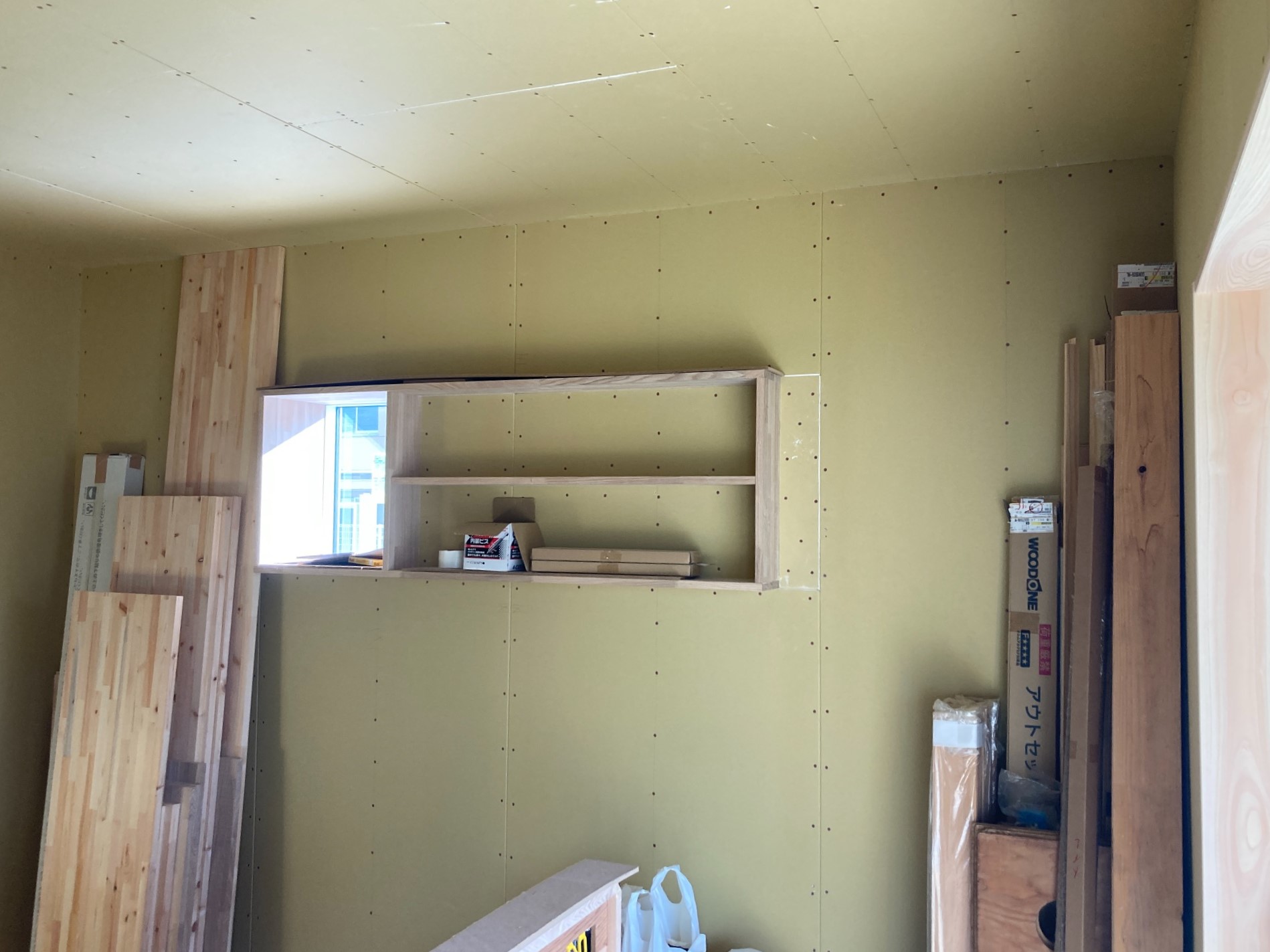 土間収納への入り口はきれいなR垂れ壁の形が造られました。o本監督のこだわりが随所にみられるニッチや収納などの造作が進み、山積みだったプラスターボードが天井・壁に張られどんどん捌かれていきます。