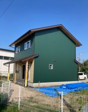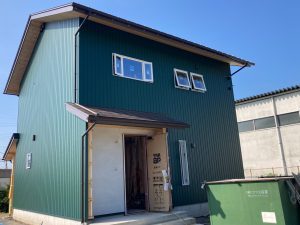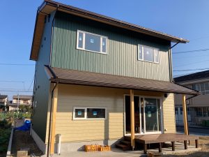 外壁は明るめのモスグリーンを基調とし、南側一部に横葺きのベージュ系のガルバリウム鋼板張り分けされています。