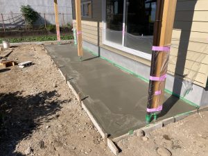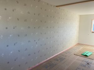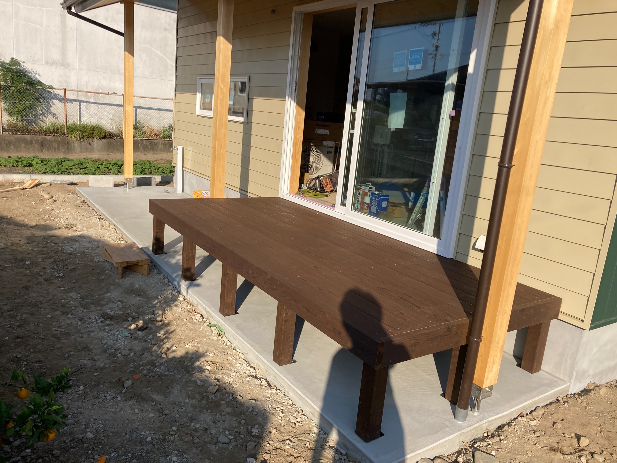 室内はパテ埋め処理をし、クロス貼り工事完了です。外部は土間コン施工後ウッドデッキが造られました。