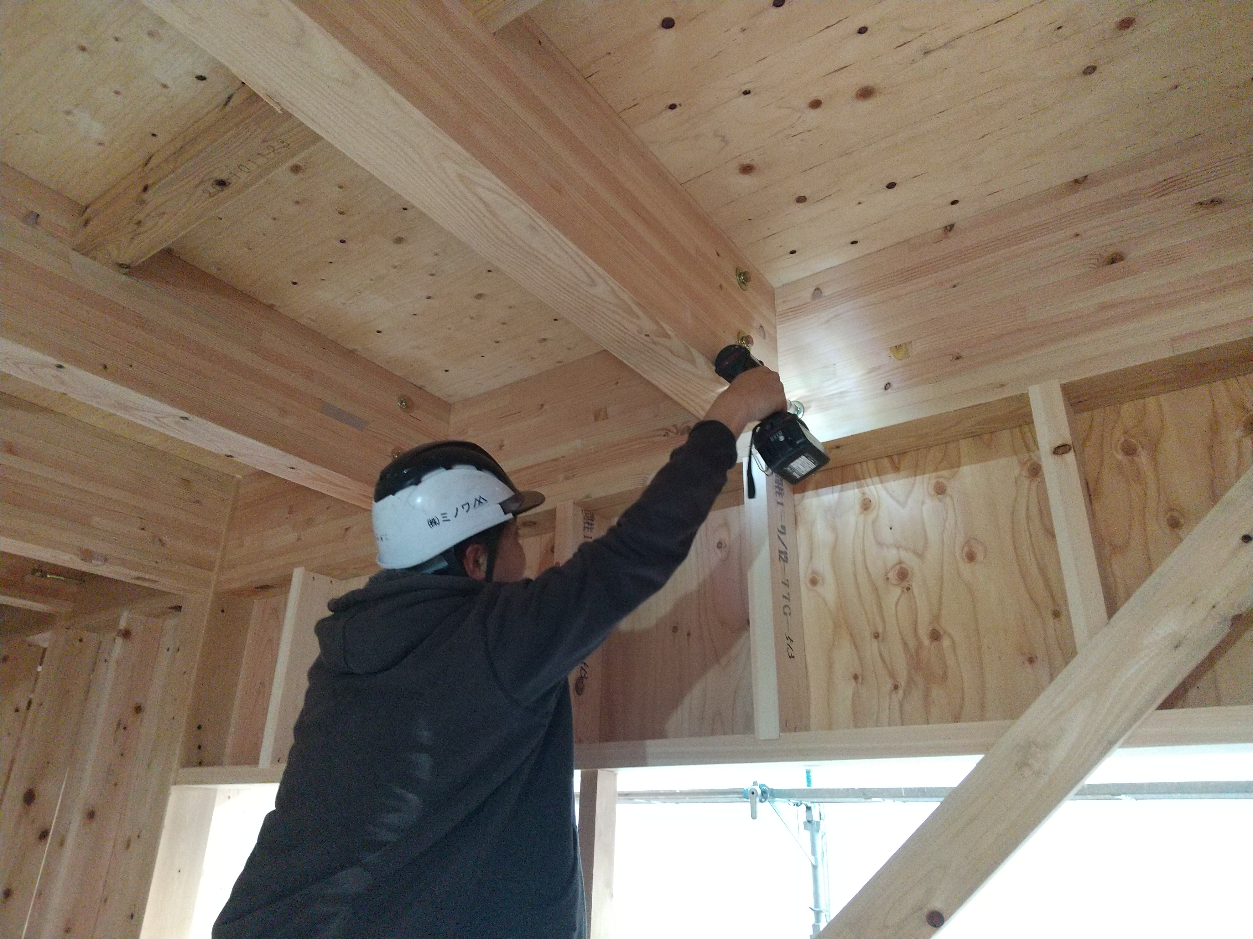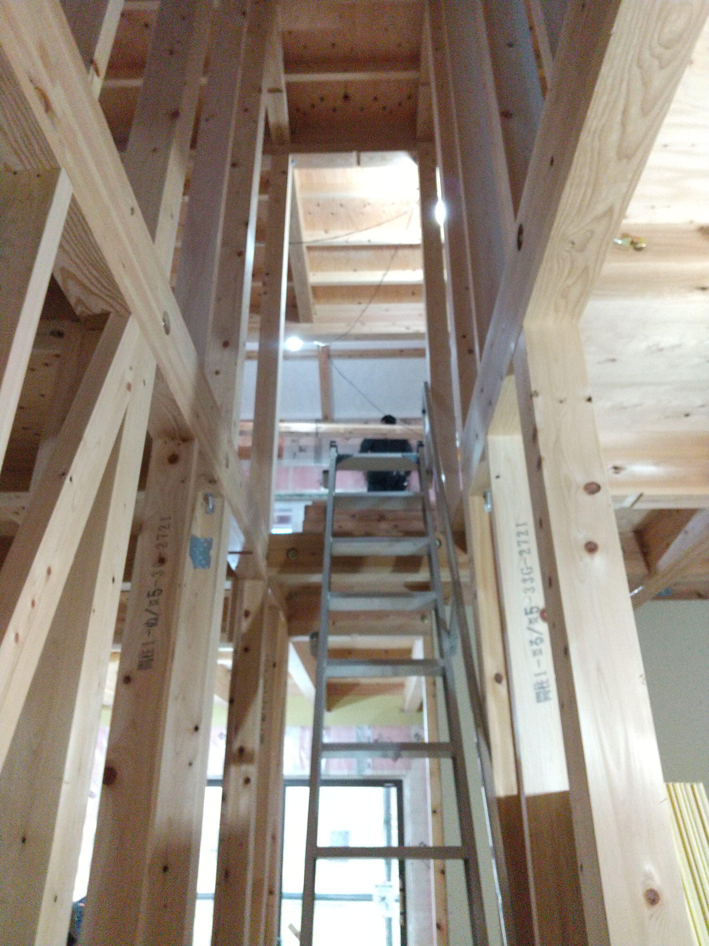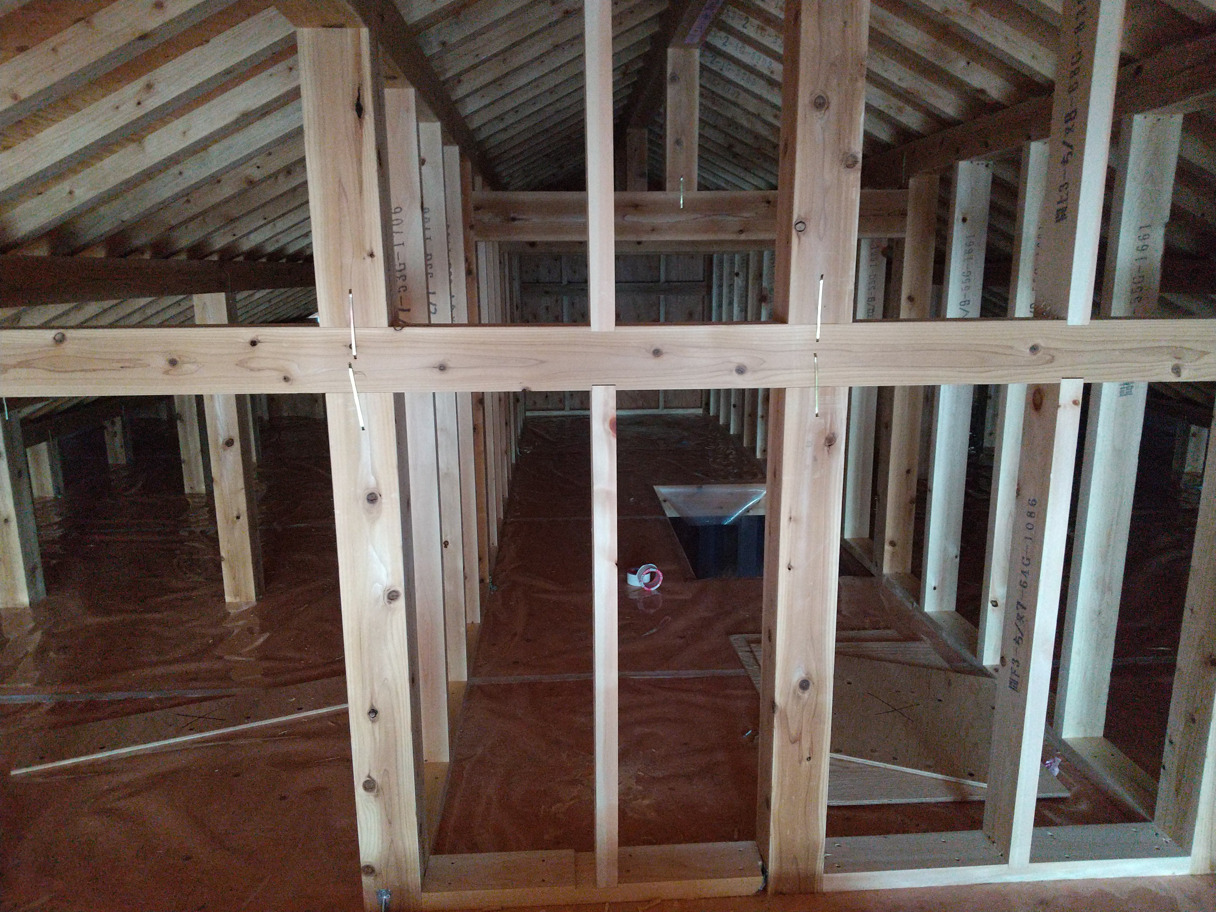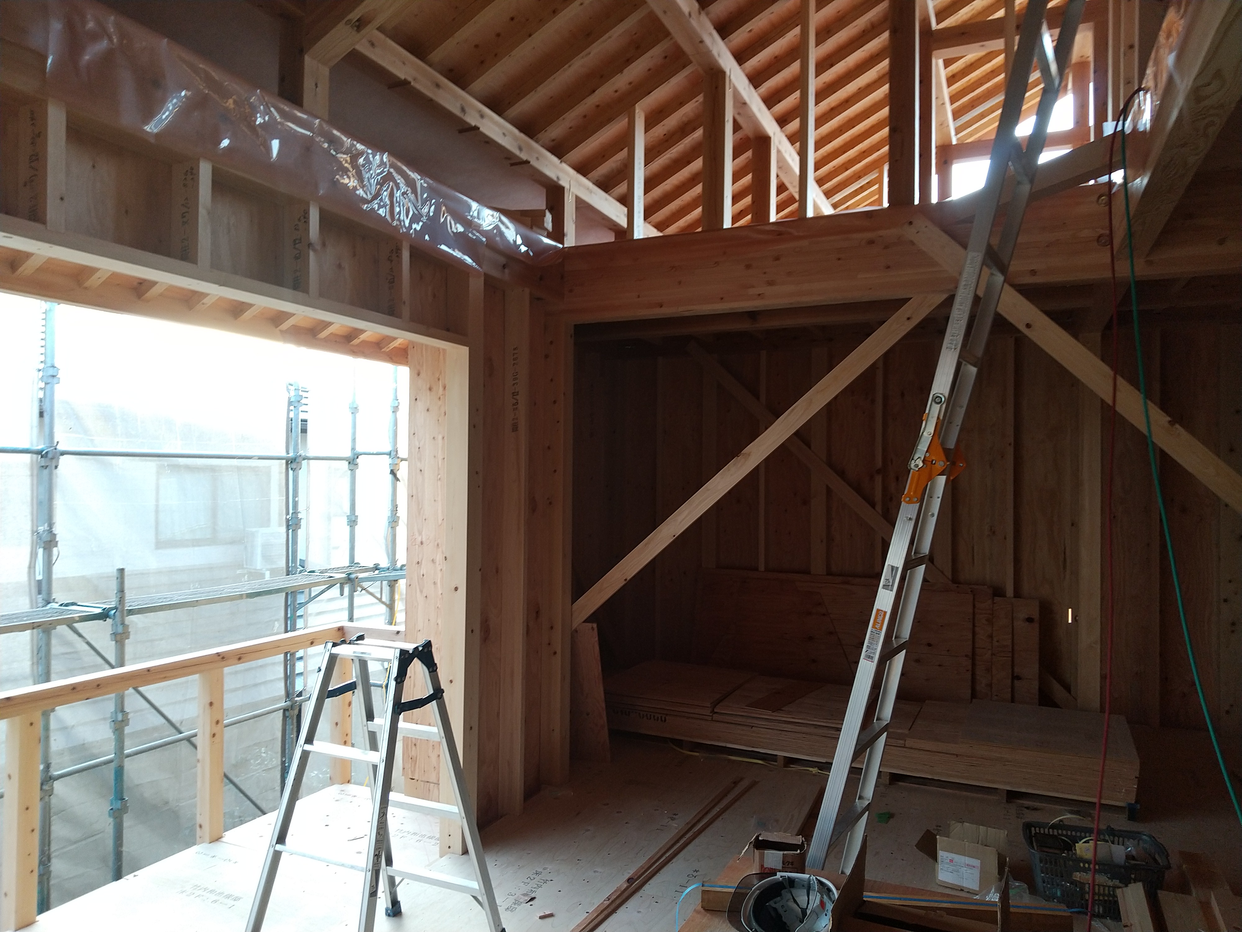 2階は、間仕切り下地が組み終わり、天井下地を組んでいます。なんとなく、部屋の広さがわかるようになってきました。k也さんが「付けたい!」とy香さんにおねだりしていました火打ちもどこにあるか分かり易くなりました。