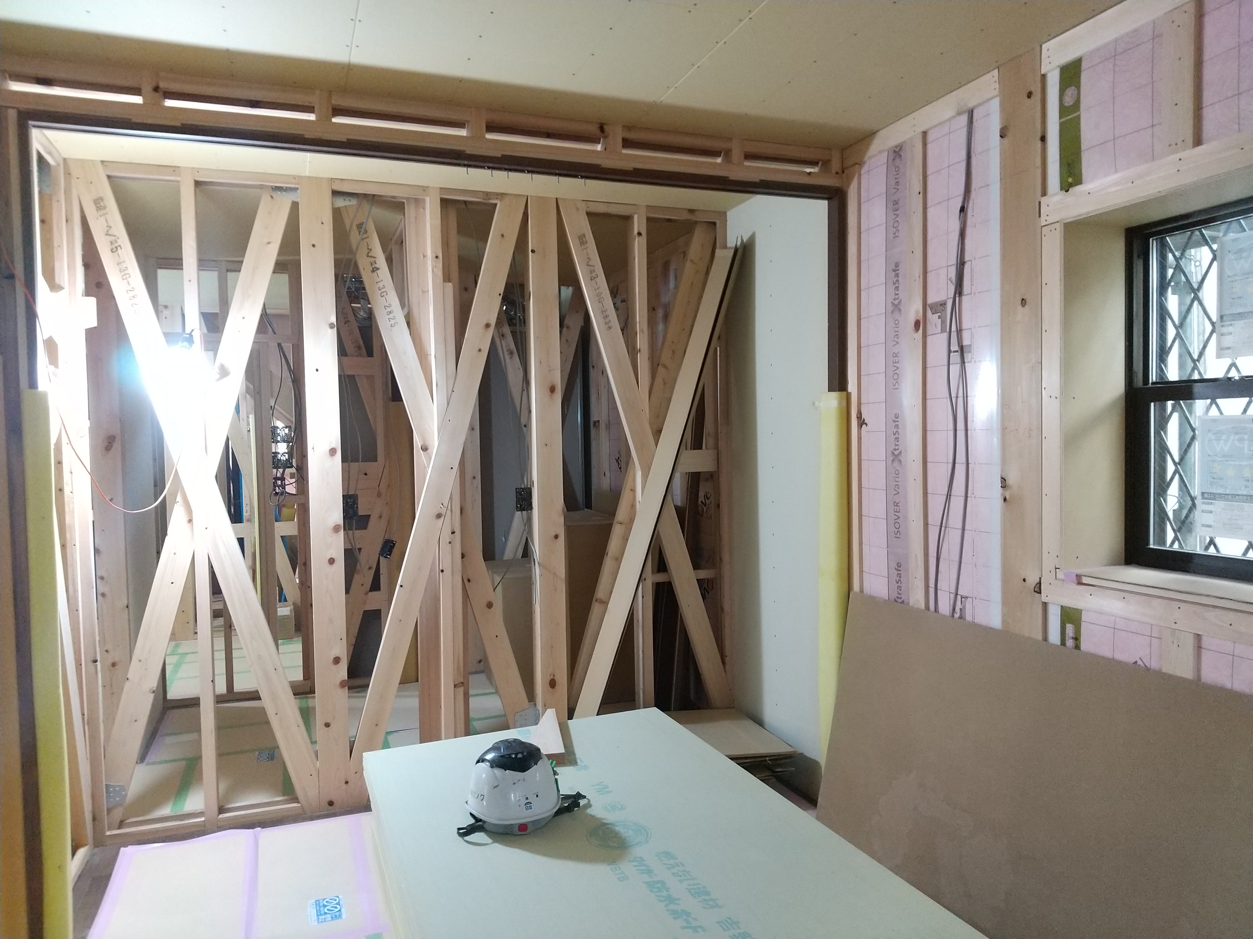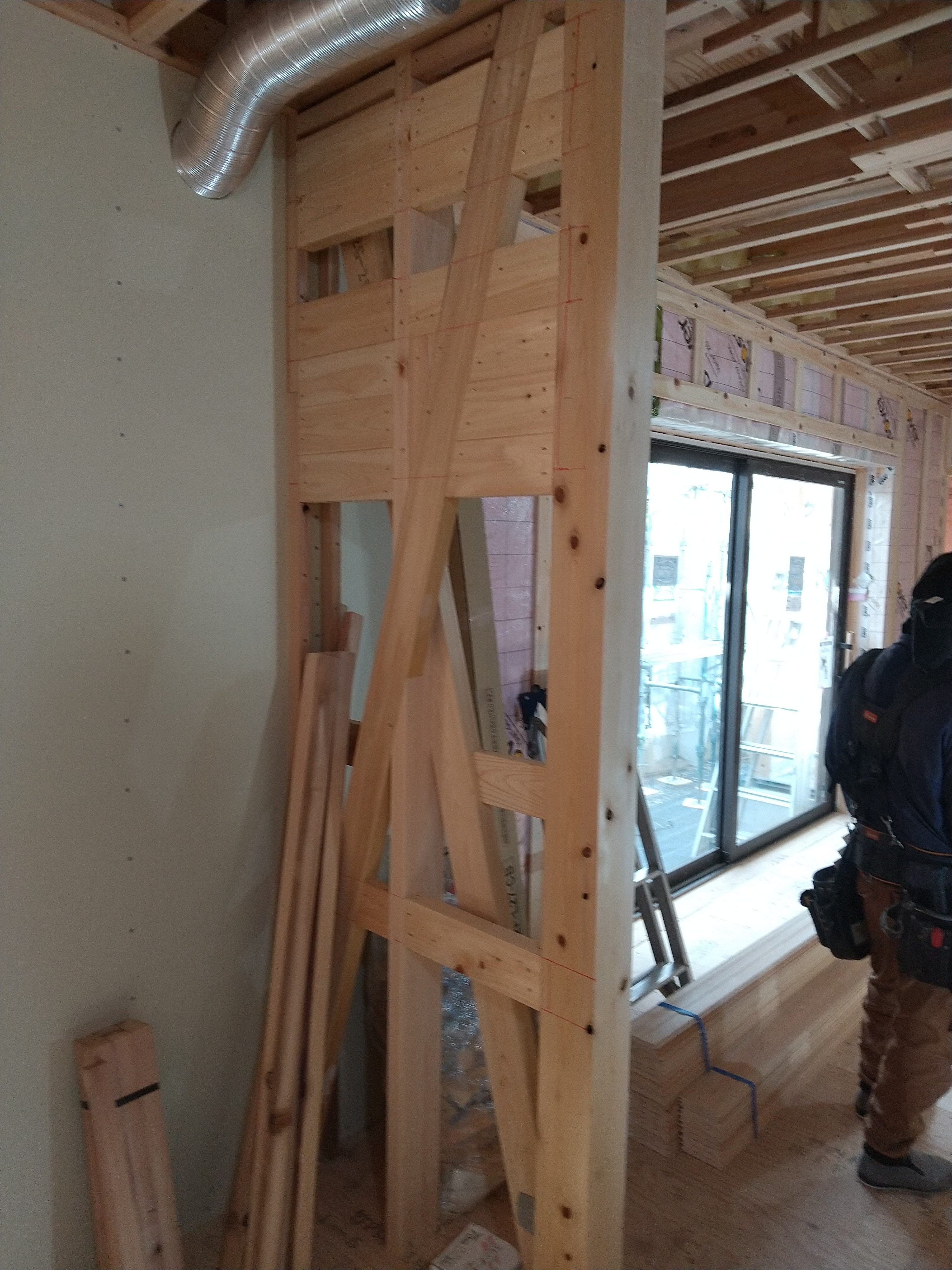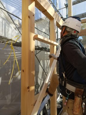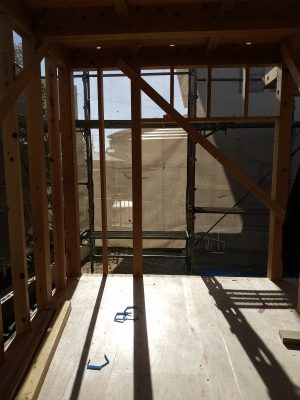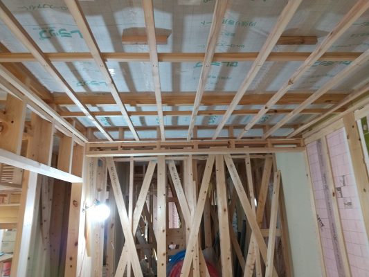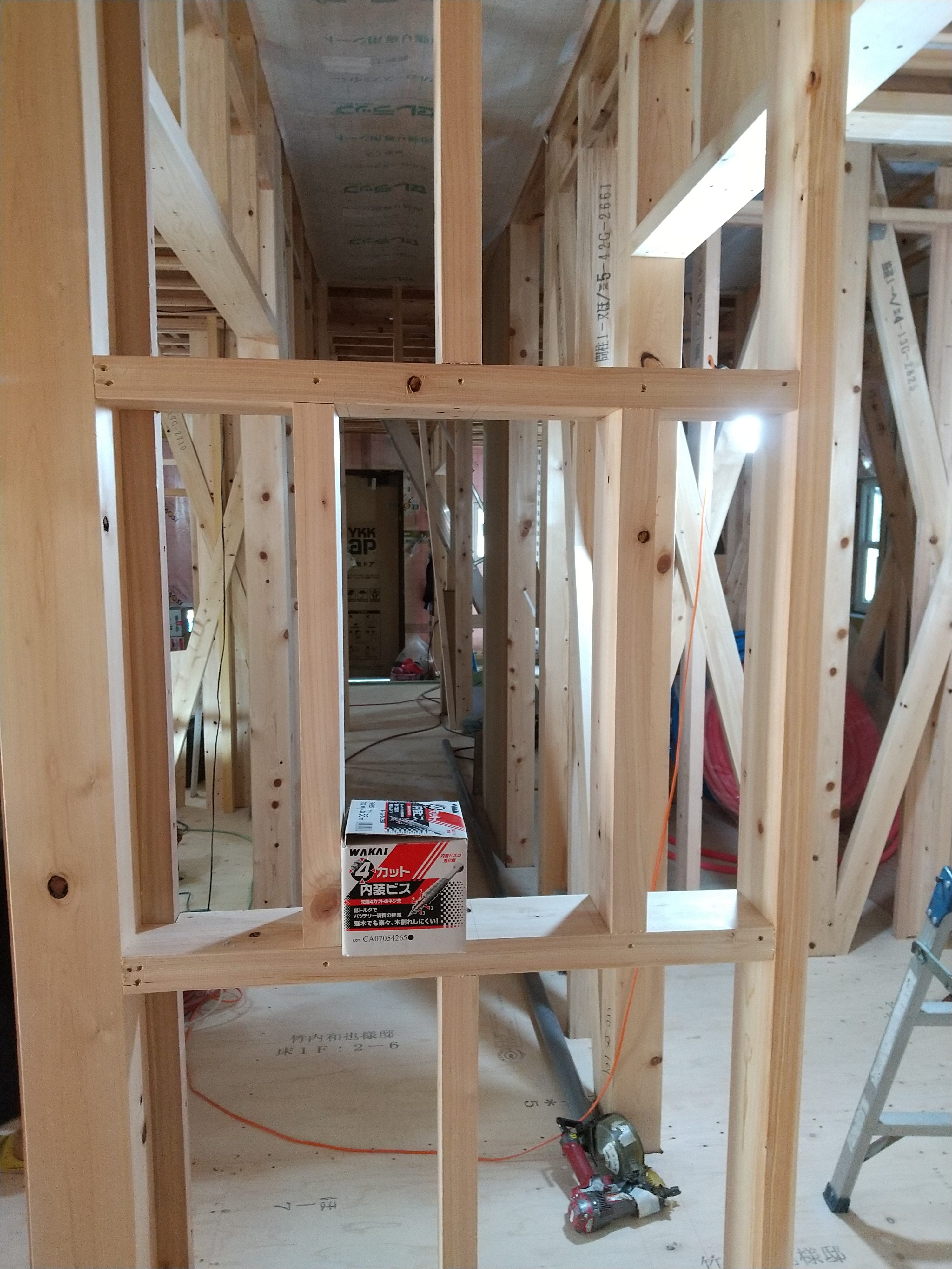 2階は、間仕切り下地が組み終わり、天井下地を組んでいます。なんとなく、部屋の広さがわかるようになってきました。k也さんが「付けたい!」とy香さんにおねだりしていました火打ちもどこにあるか分かり易くなりました。