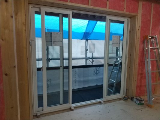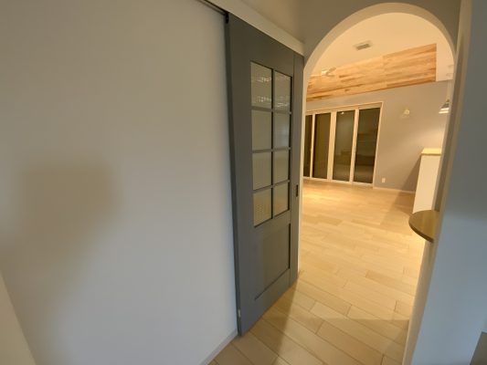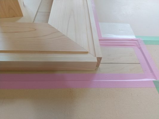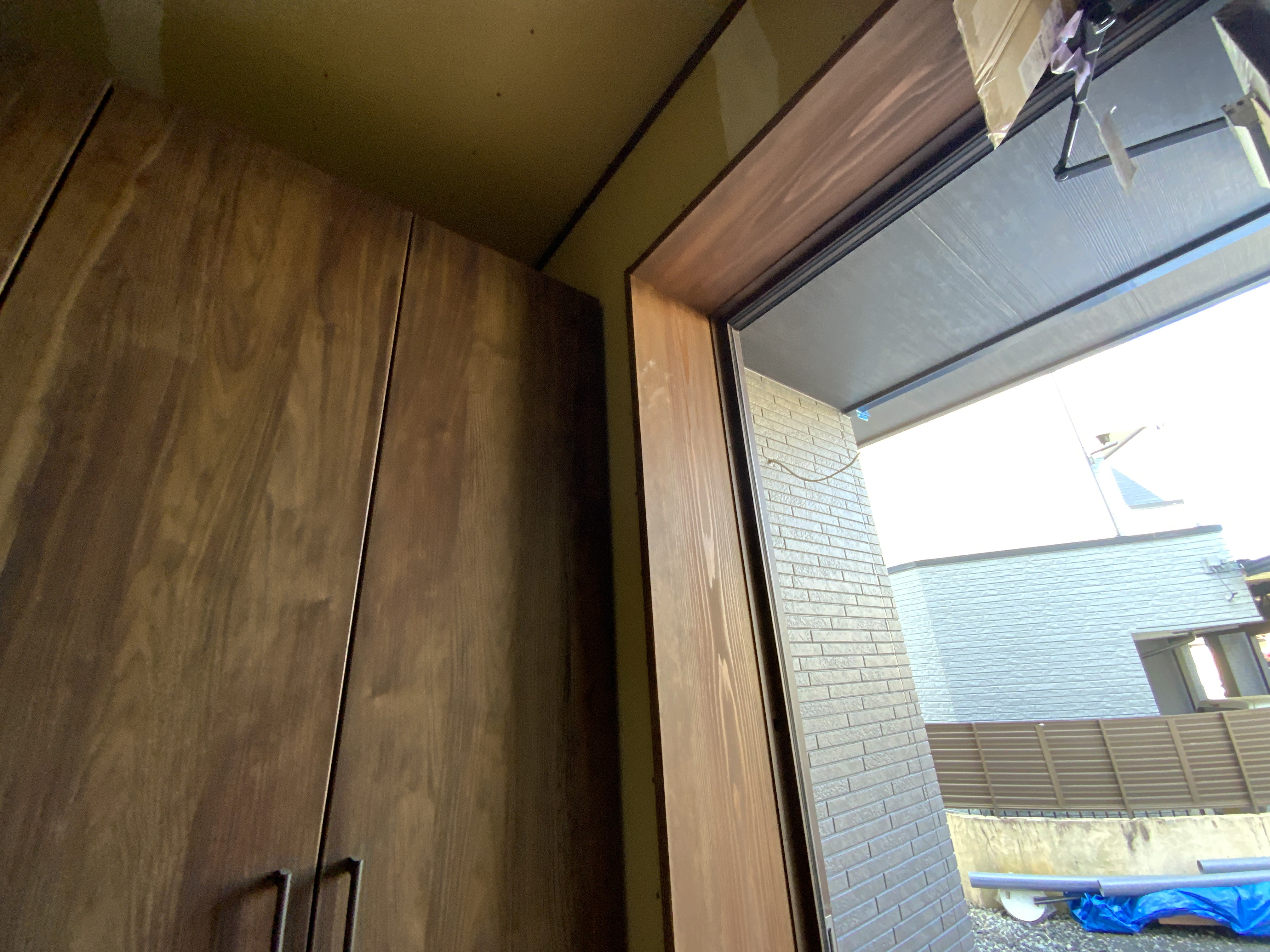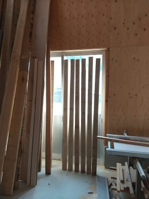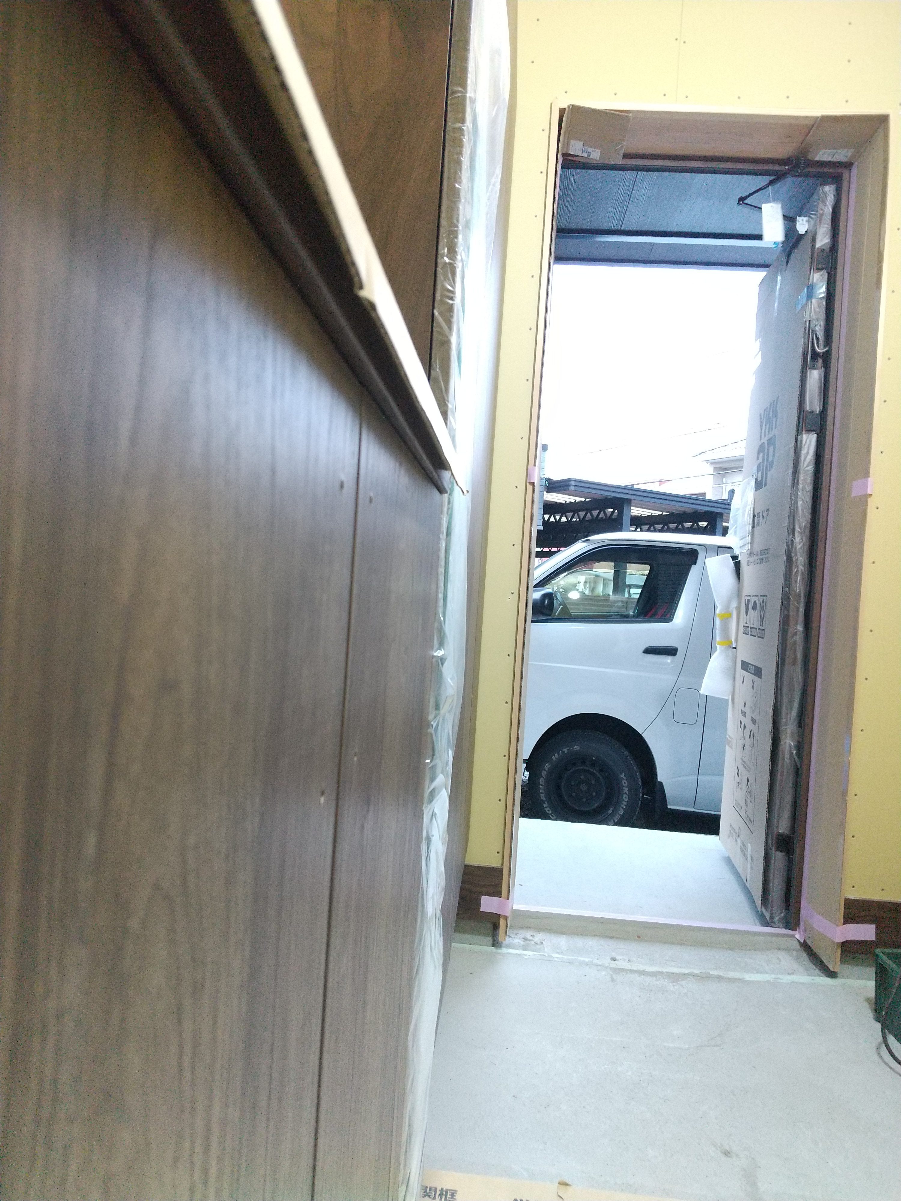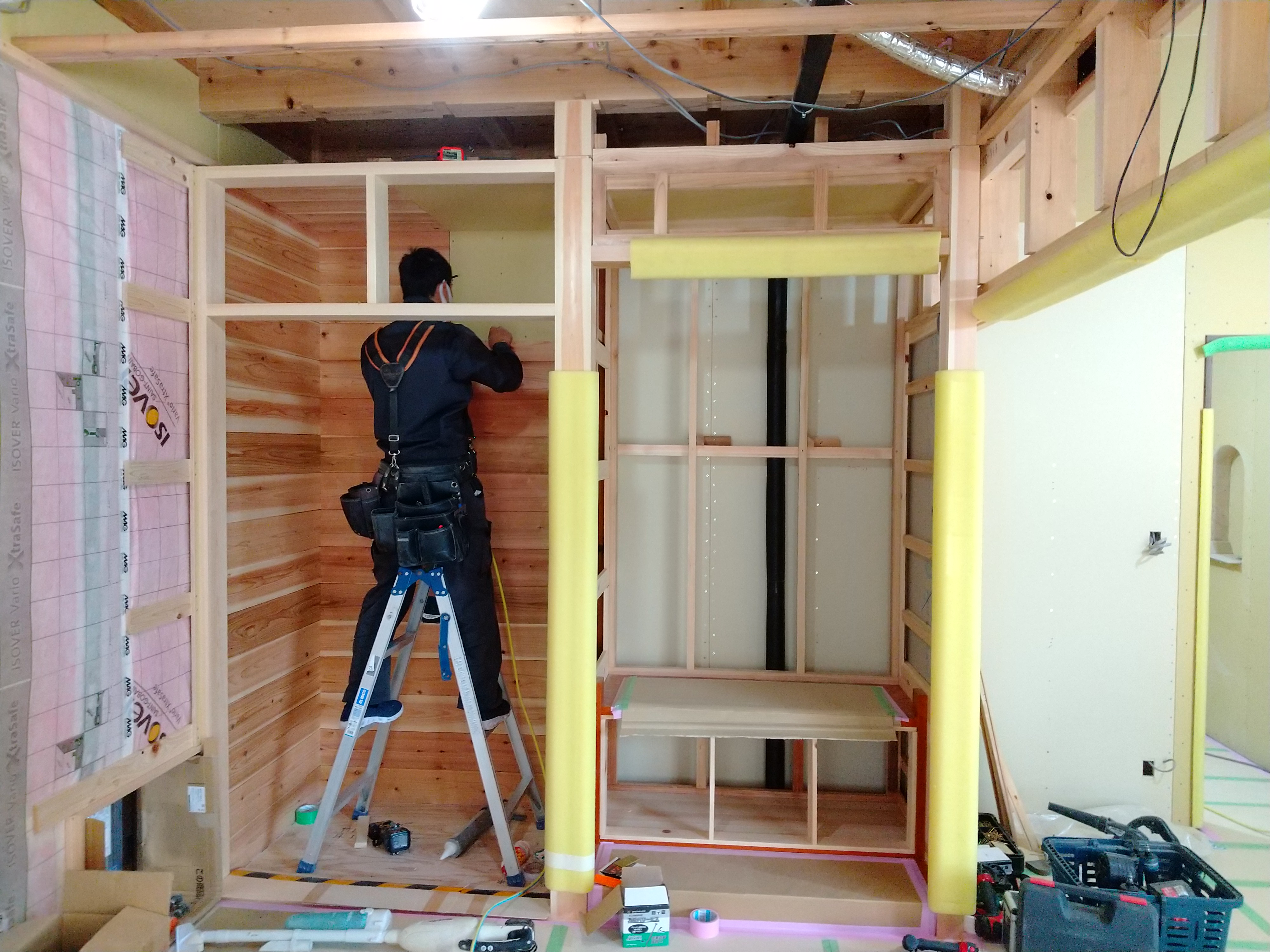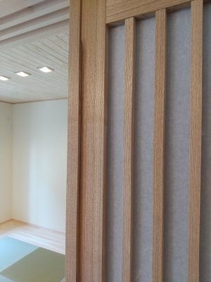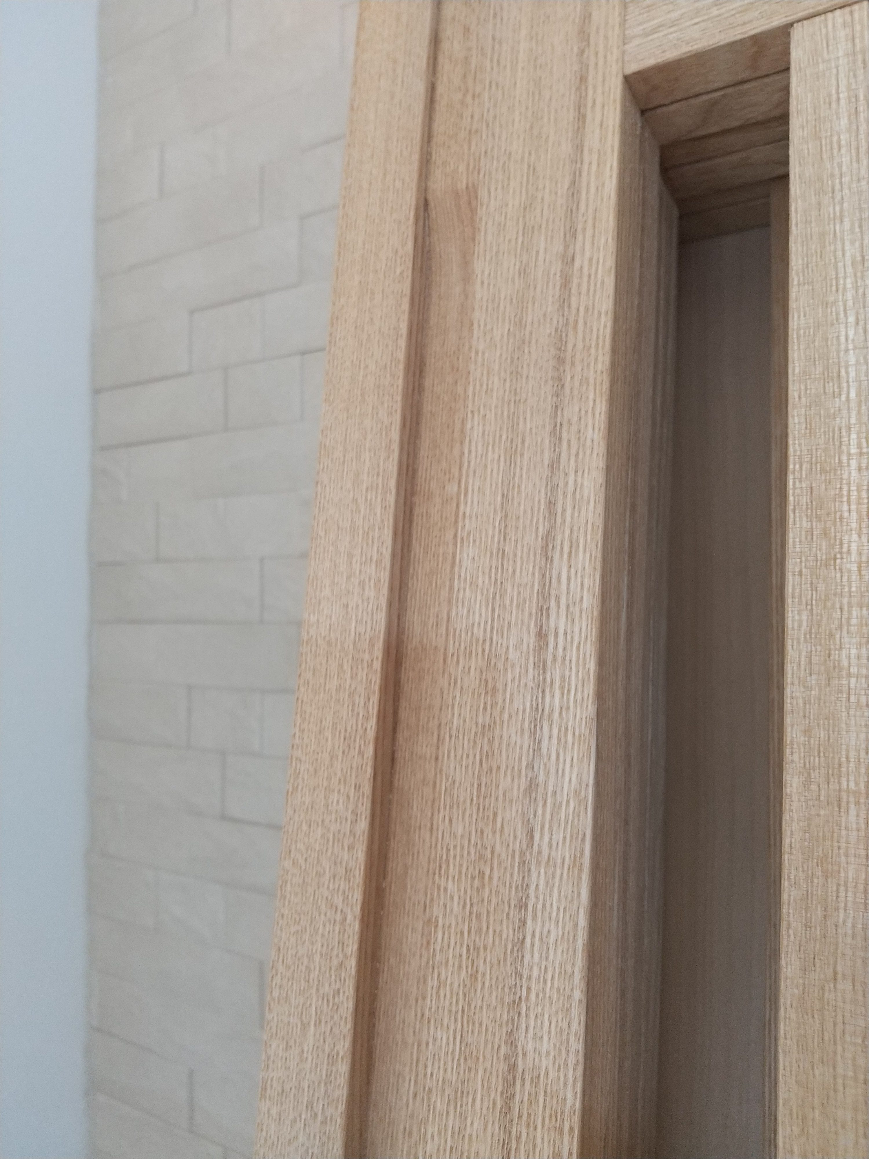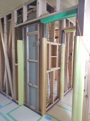 今回はミノワでは珍しくほとんど既製品の建具です。既製品の建具は枠もセットの為、木工事(大工工事)の際にこの様に枠が必要になりますので、t様には各設備をご検討いただく段階で、建具も一緒にショールームでご検討いただきました。1階はウォールナット柄、2階はホワイトアッシュ柄。製作建具では高くて手が出せない材料や塗装を施さなくてはいけない色柄を楽しめる事や、シートなので汚れを拭きやすいところ等がメリットだと思います。