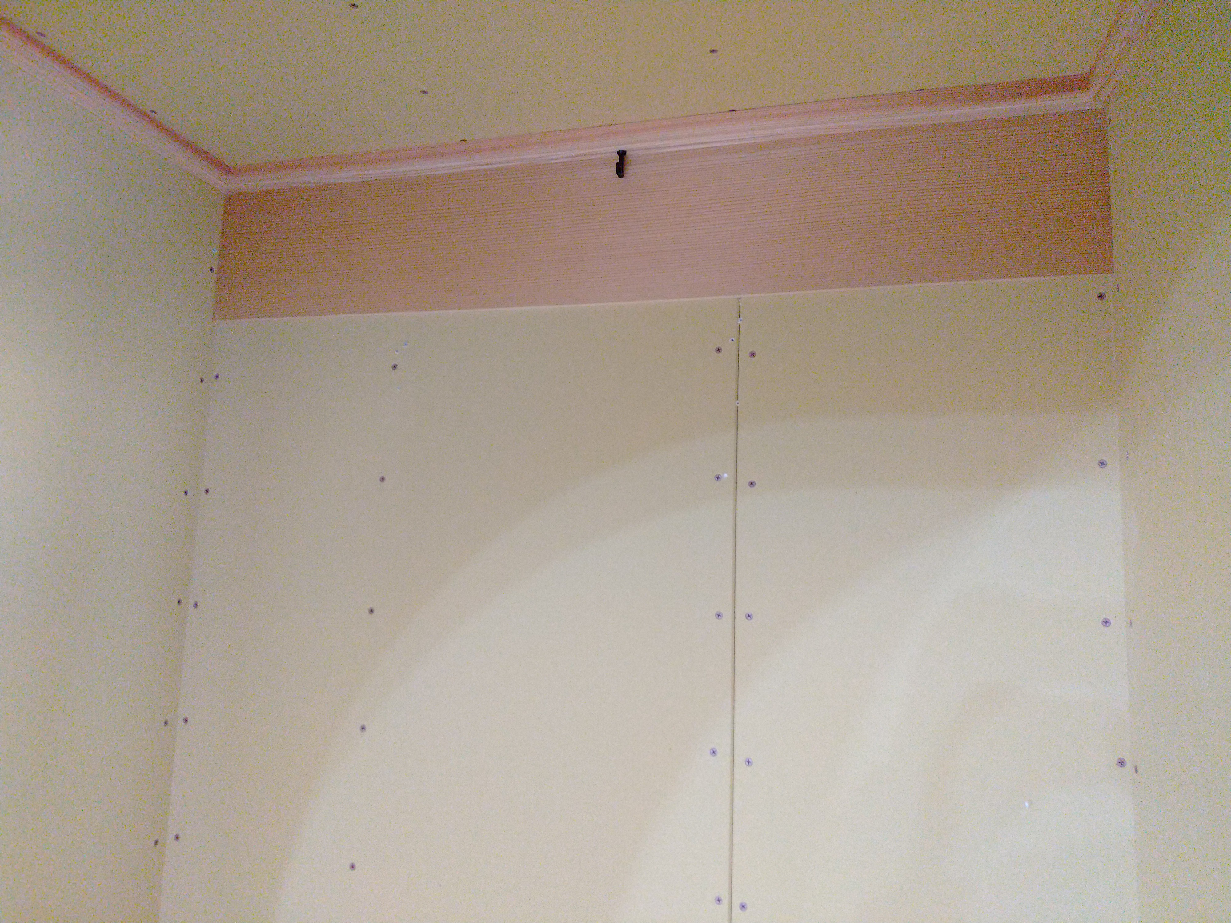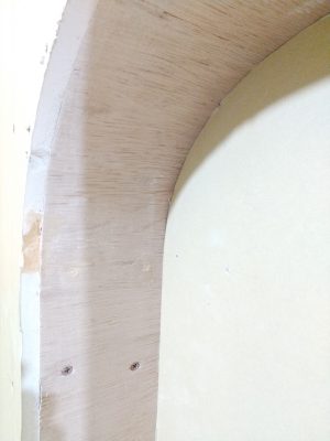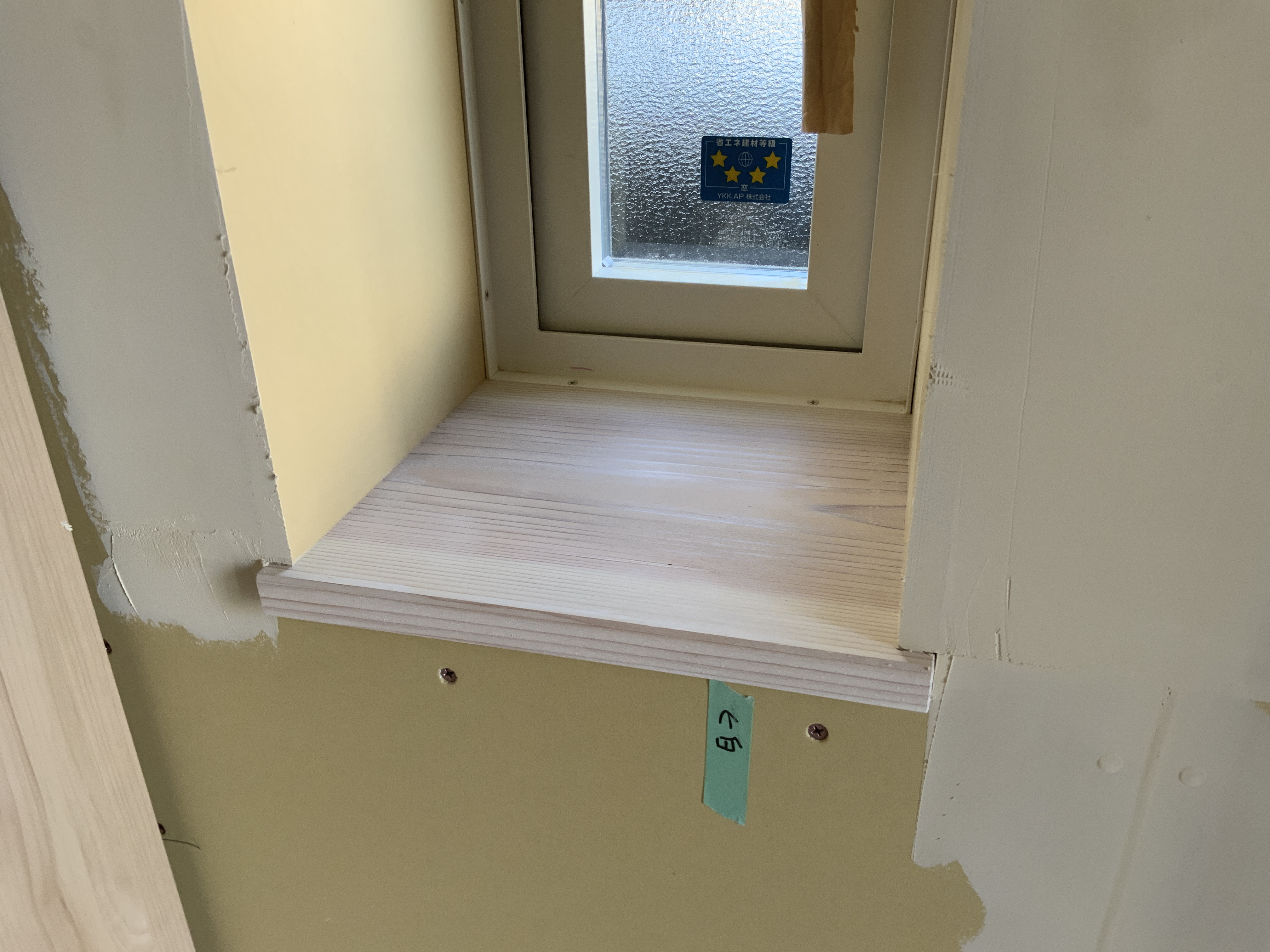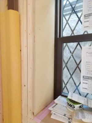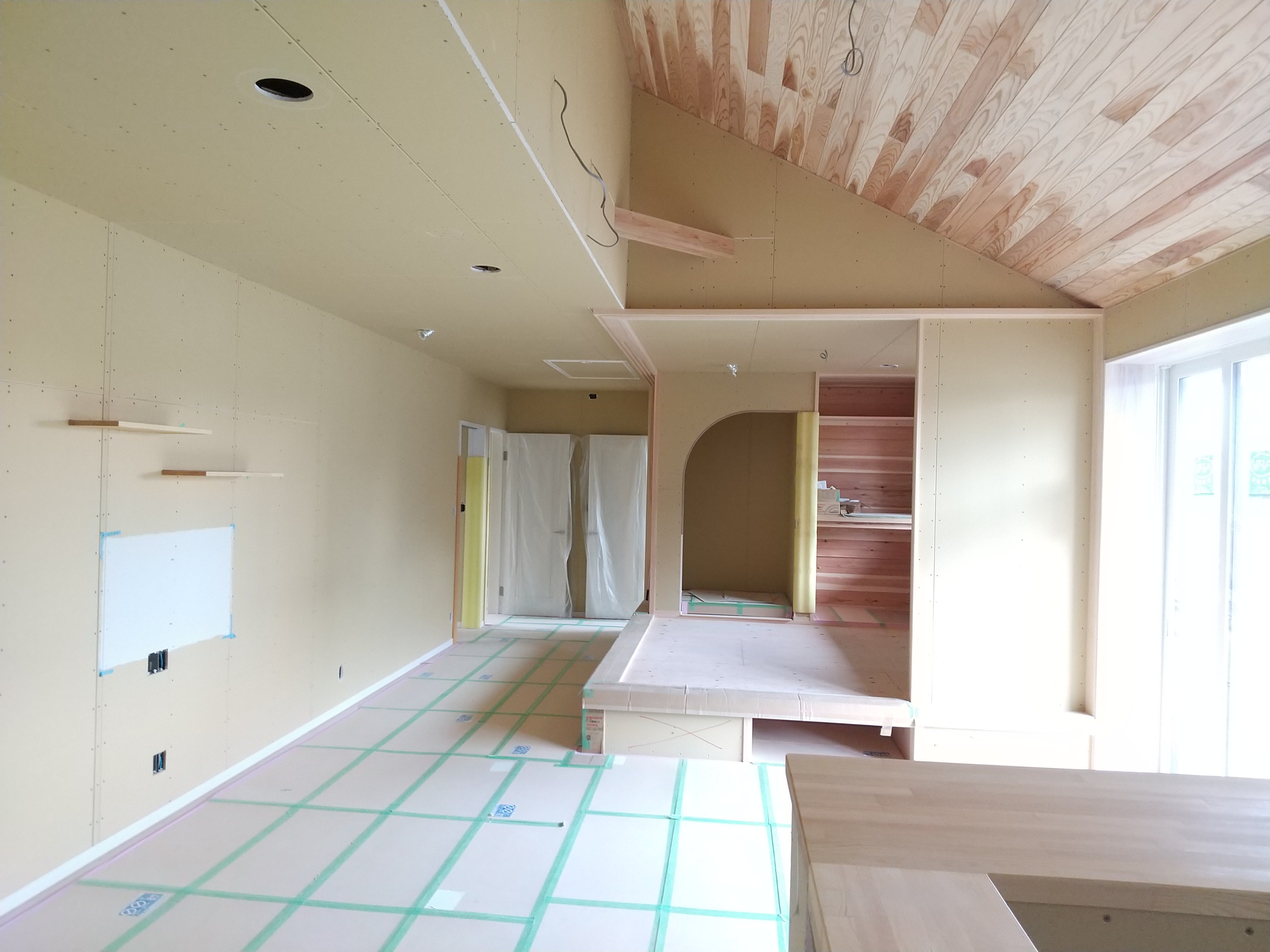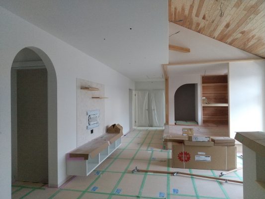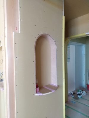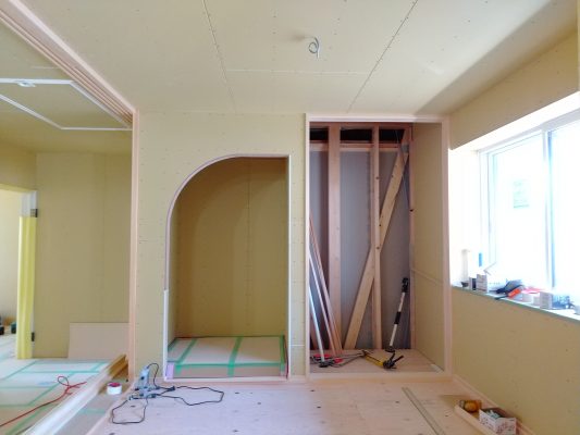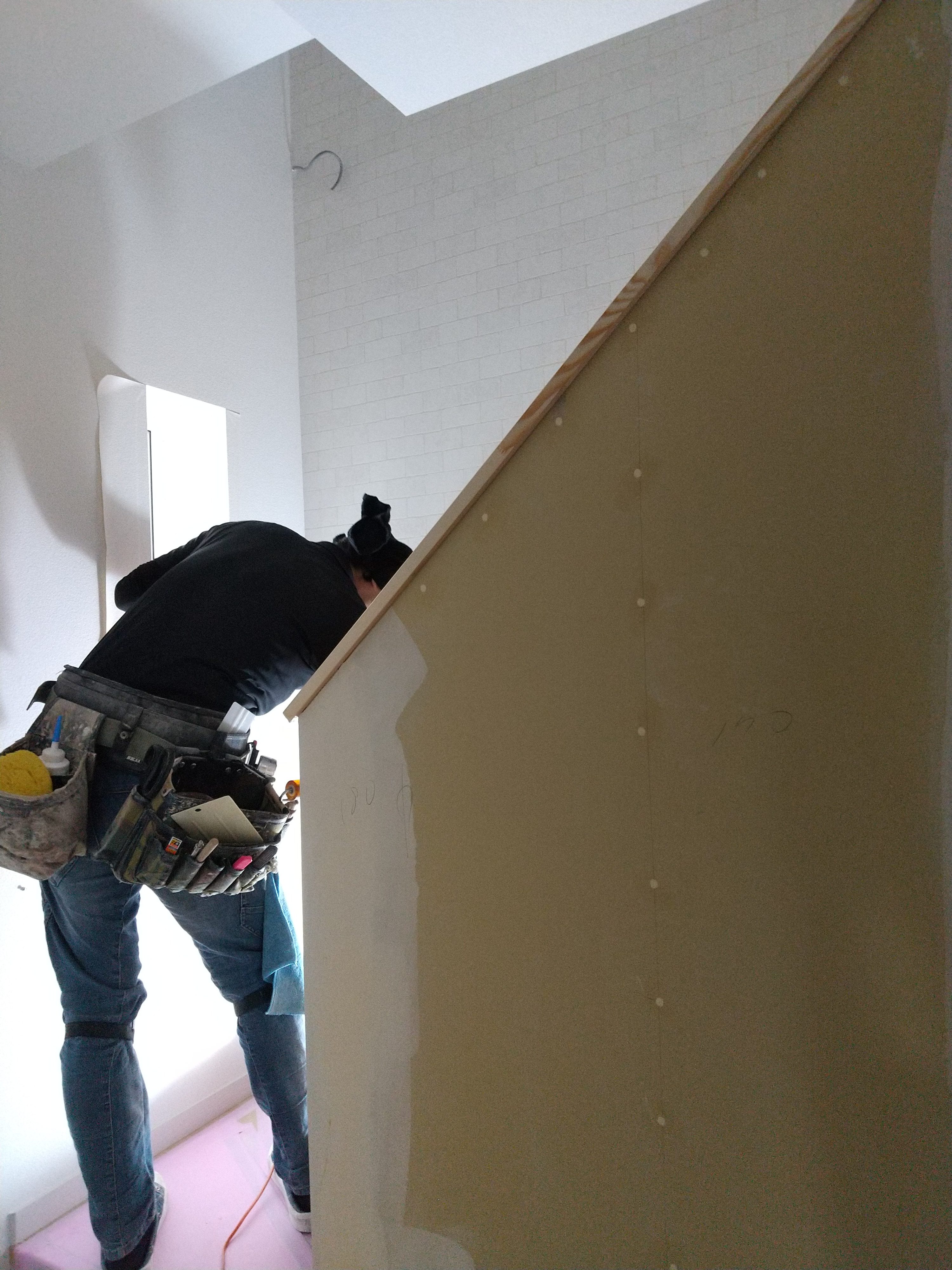 2階は、k池巨匠が黙々とプラスターボードを張り始めています。y香さんのご要望のアールのニッチや窓枠部分も出来上がっています。