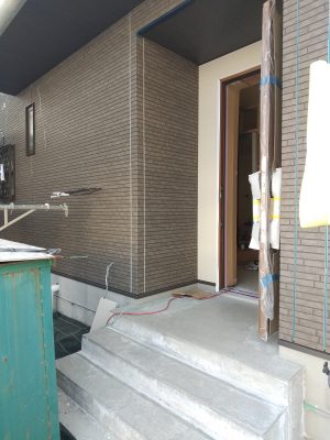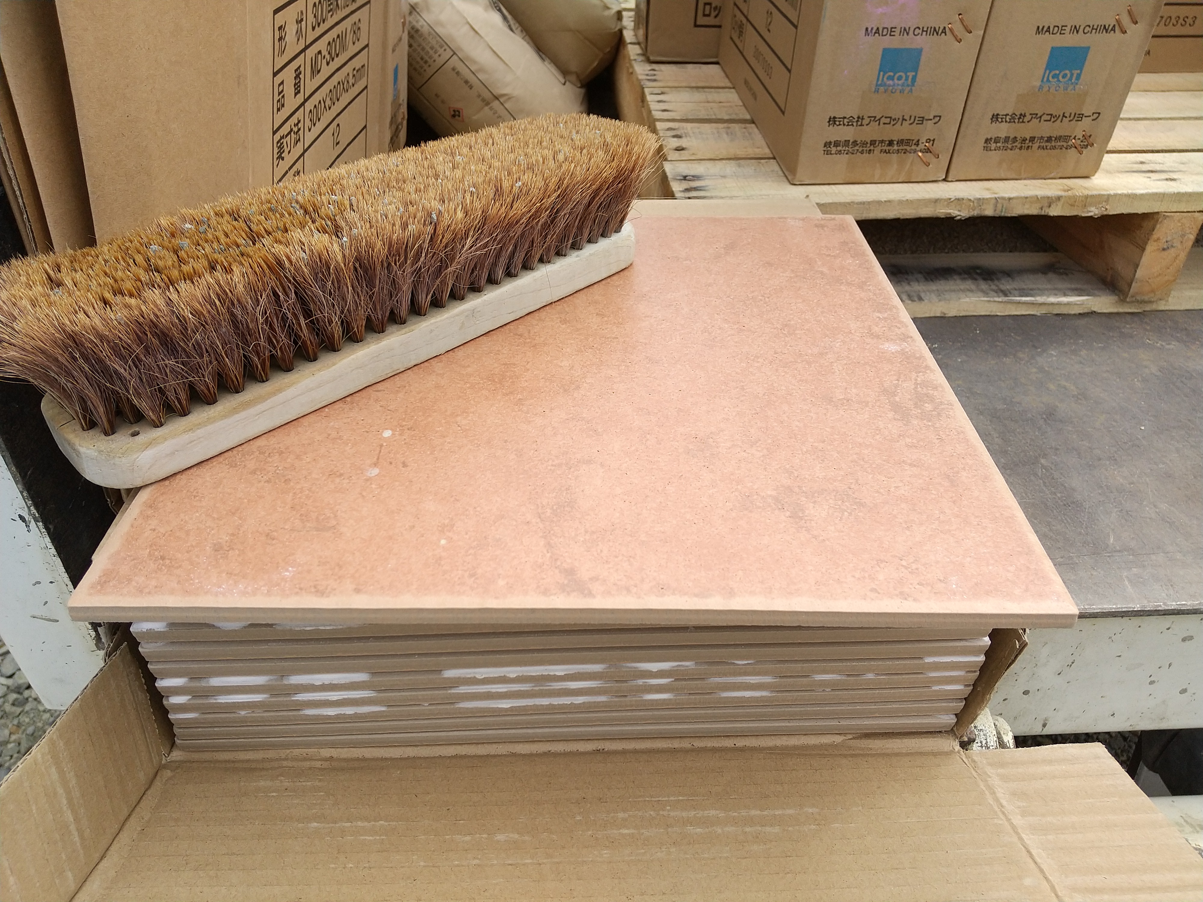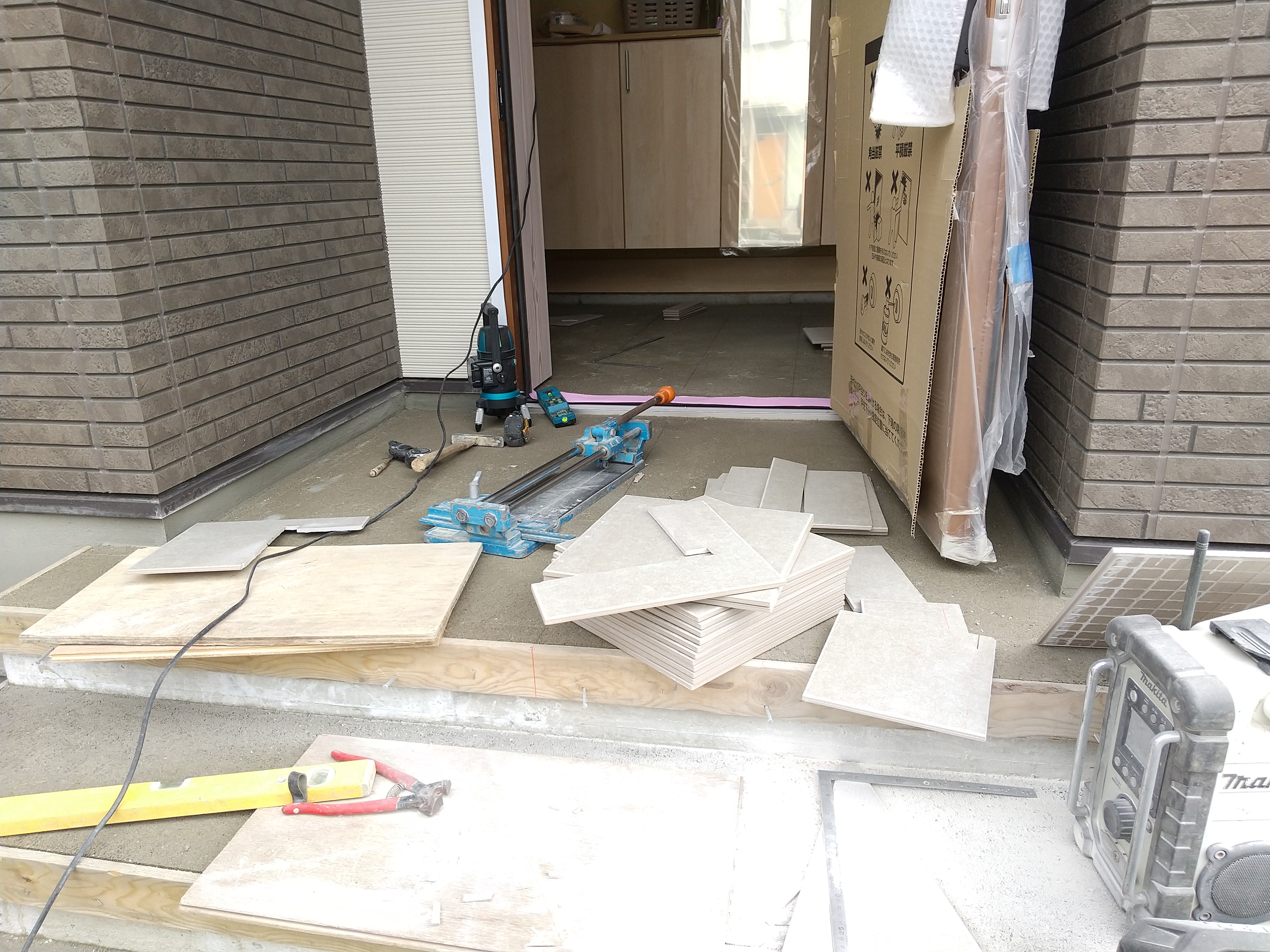 今日は玄関、ポーチのタイルを張りに、y本左官さんも来ています。k也さん、y香さん世帯は明るめのグレーのタイル。角度によってはベージュの様な明るい色に見える不思議なタイル柄です。1階のお母様世帯は、懐かしいテラコッタ風のオレンジのタイルです。今回はちょこちょこと他にもタイルを貼る計画ですので、y本左官さん、よろしくお願いいたします。