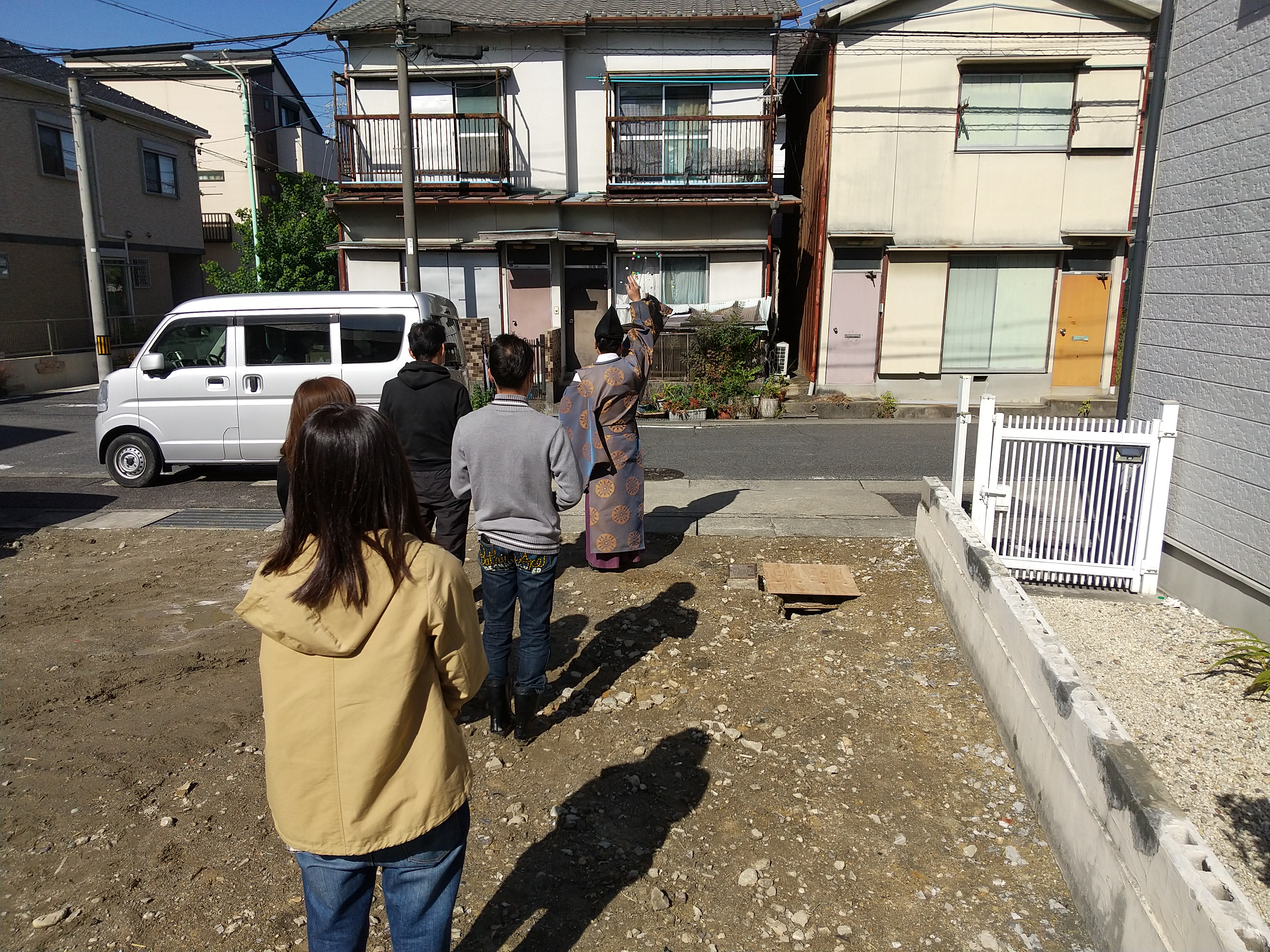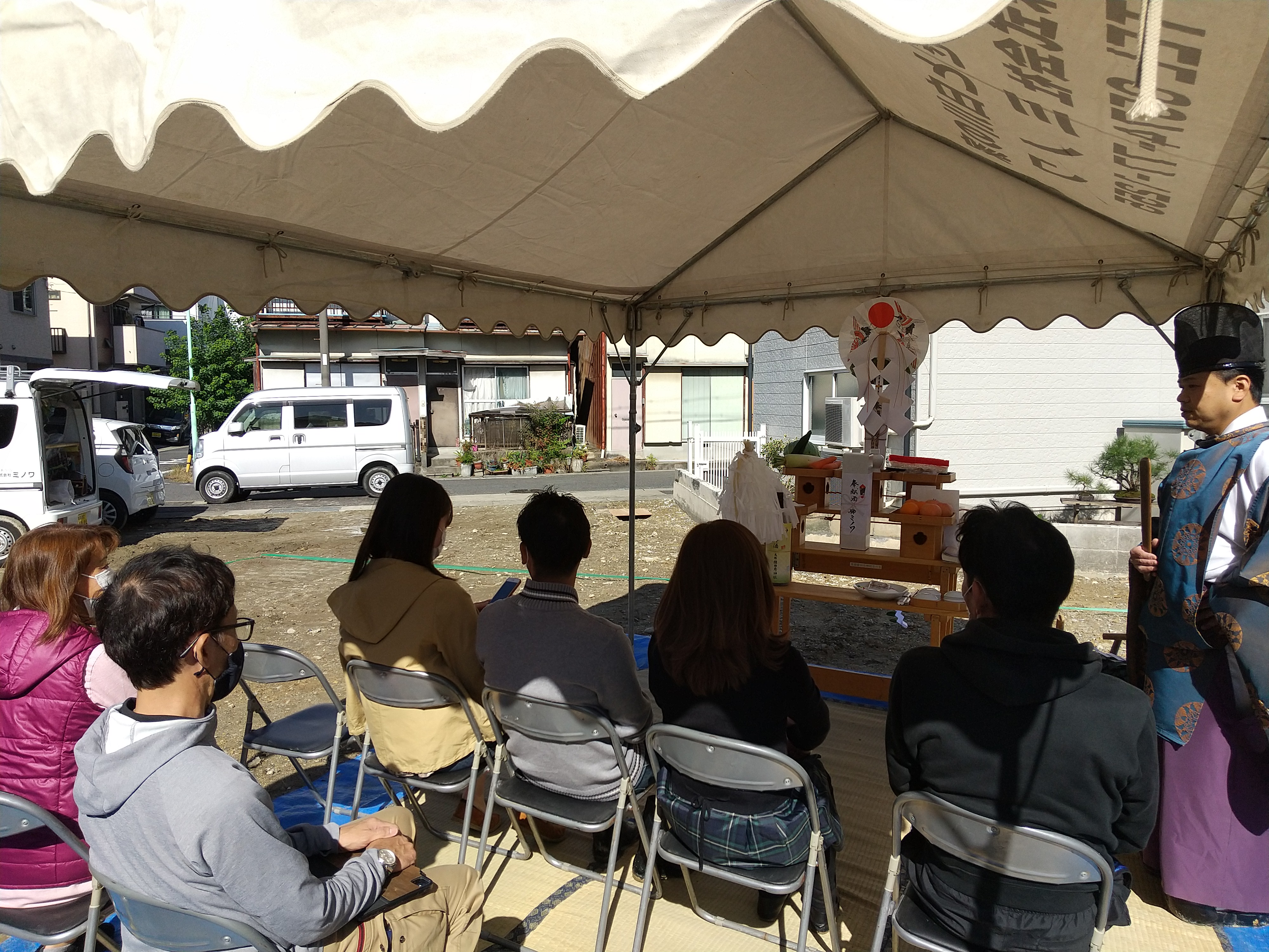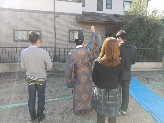 解体祭にお越しいただいた神主様が来てくださり、2回目にお会いするという事もあり和やかに祭事が執り行われました。最後に神主様から、「笑う門には福来る」という言葉から、笑顔でいる事、「ありがとう」と言う感謝の言葉や「おはよう」などの挨拶を気持ち良くする事が、相手を思いやる事に繋がり、よい家庭を築く事になるとのお話がありました。t様のご家族は、お母様が明るくかわいらしい方なのでいつも笑顔が絶えません。そんなt様ご一家が、新しい家でも笑顔で過ごせるよう、最後までお手伝いしていきたいと思います。