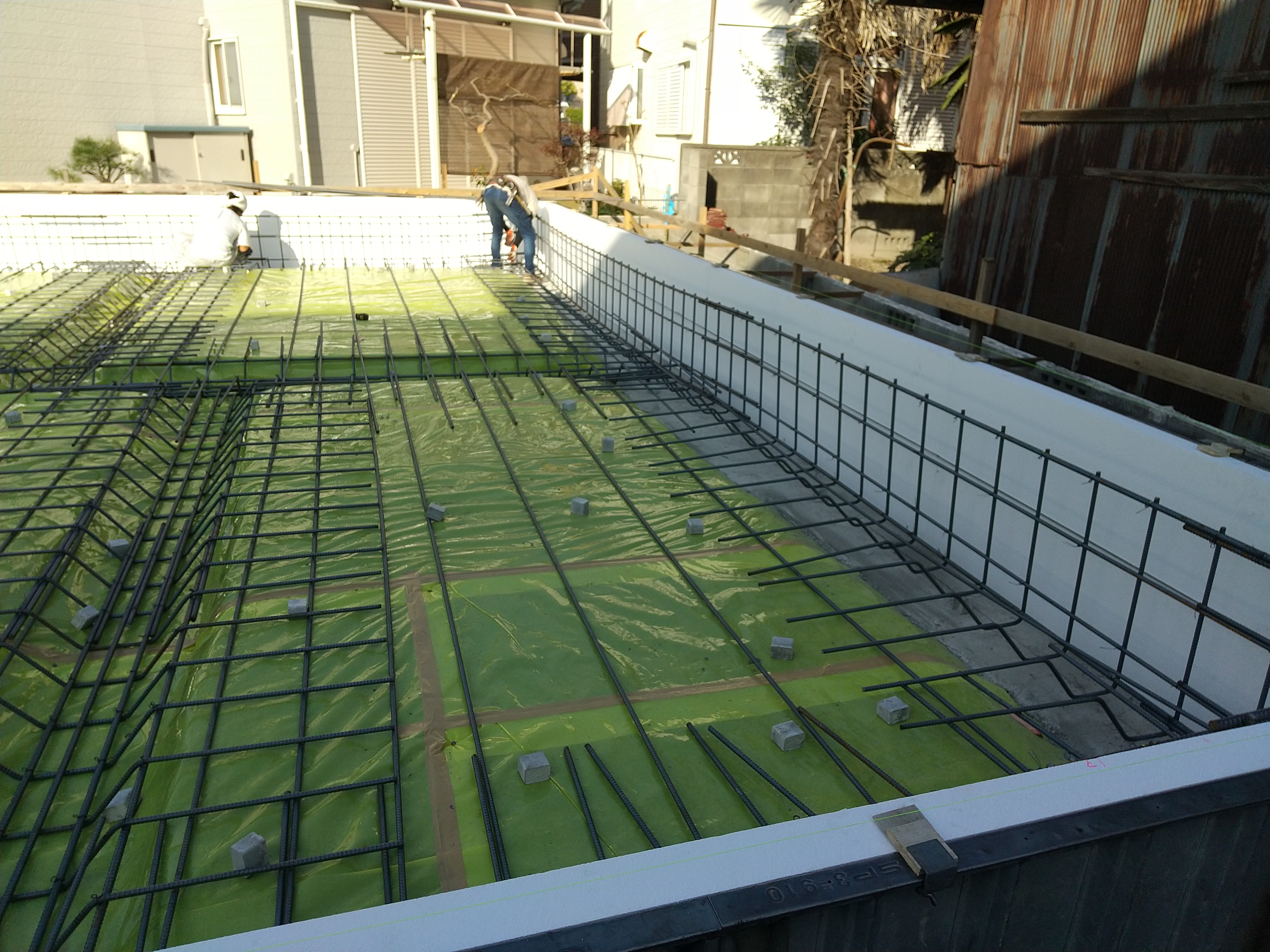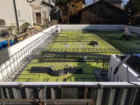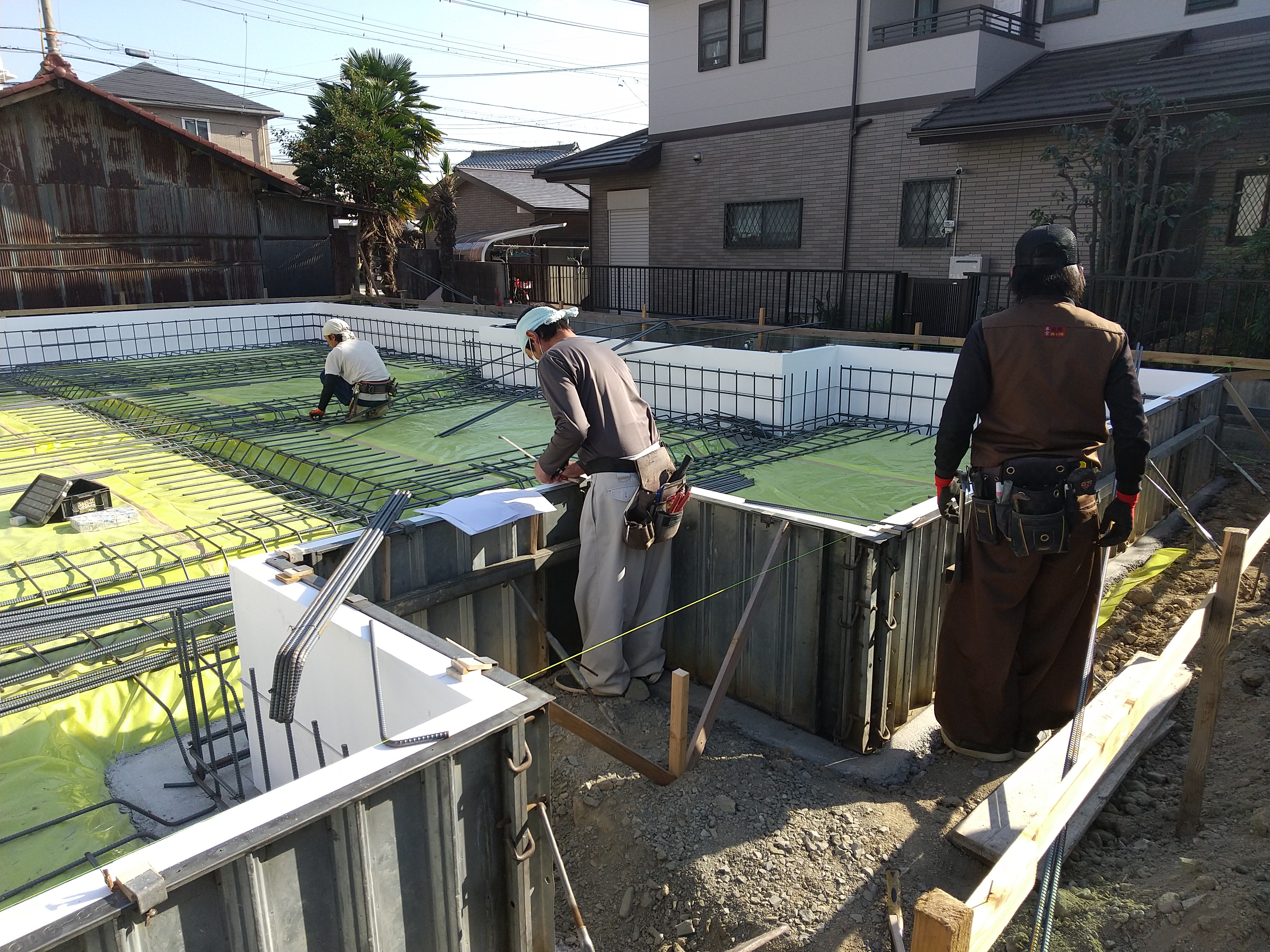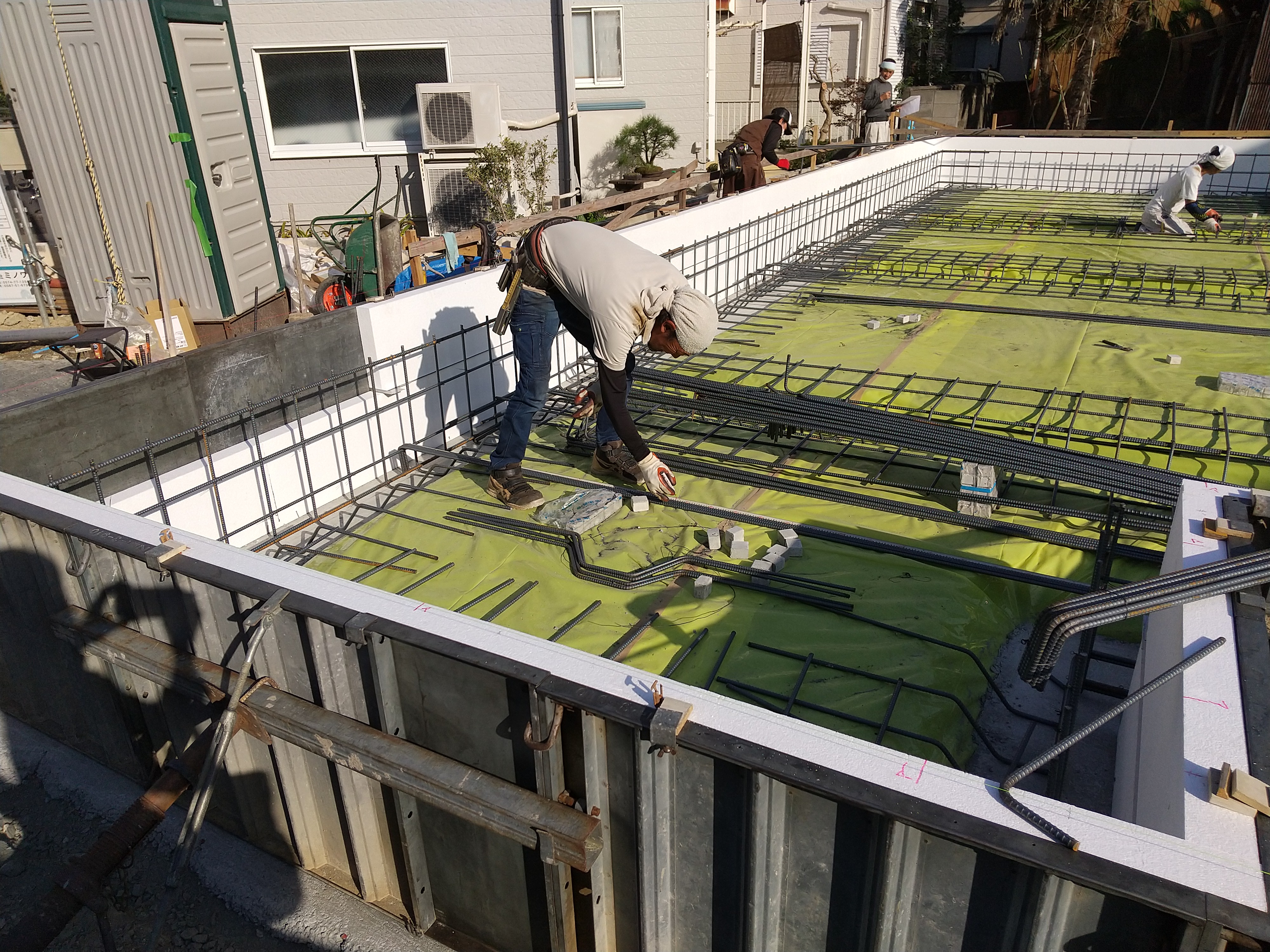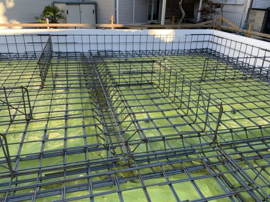 掘削工事、防水シート敷き、ベースコンクリート打設に外周部の型枠組みが完了し、今日は配筋工事です。