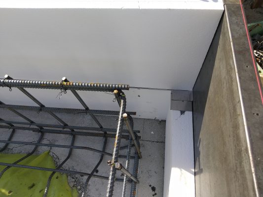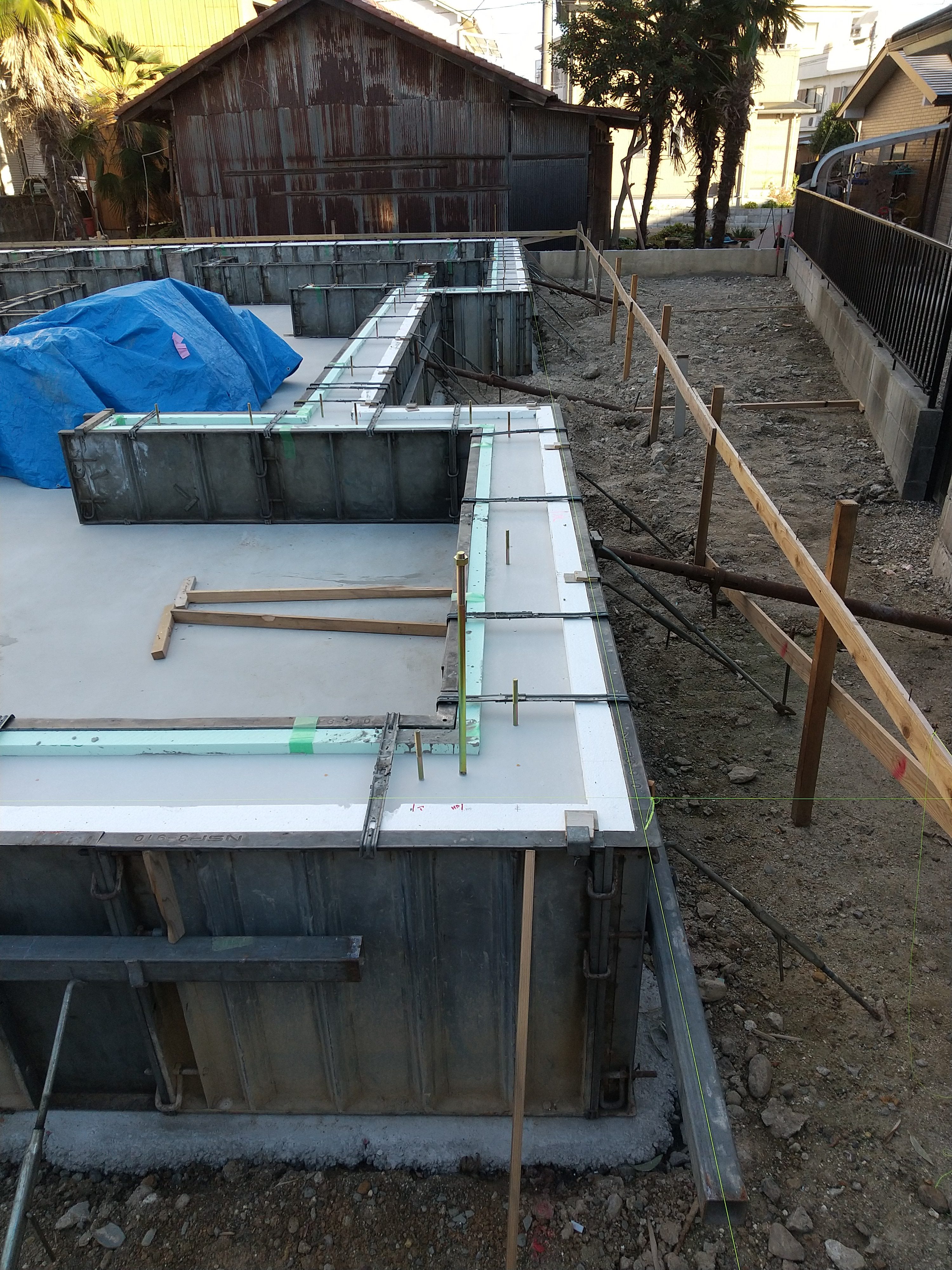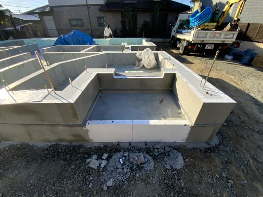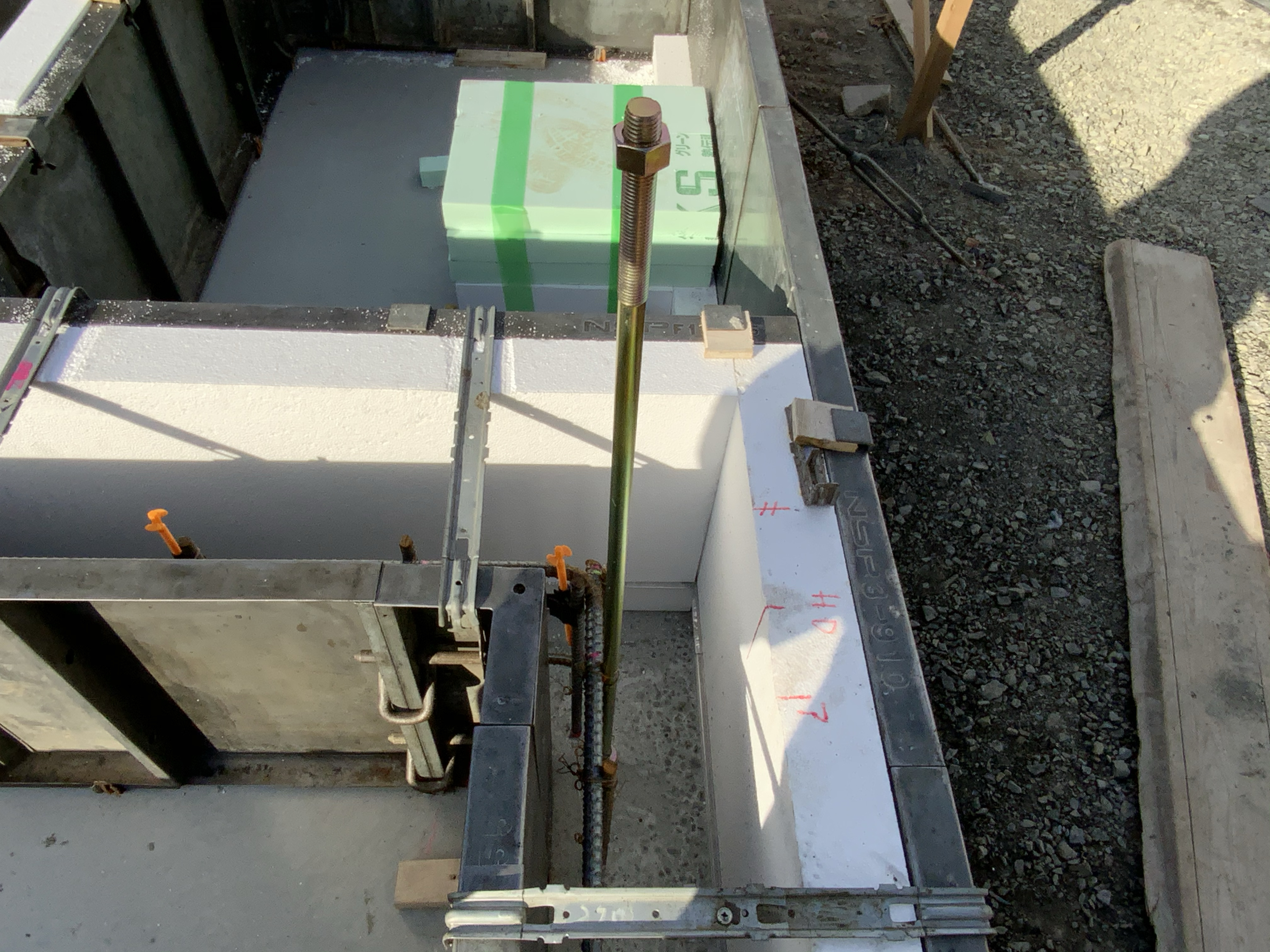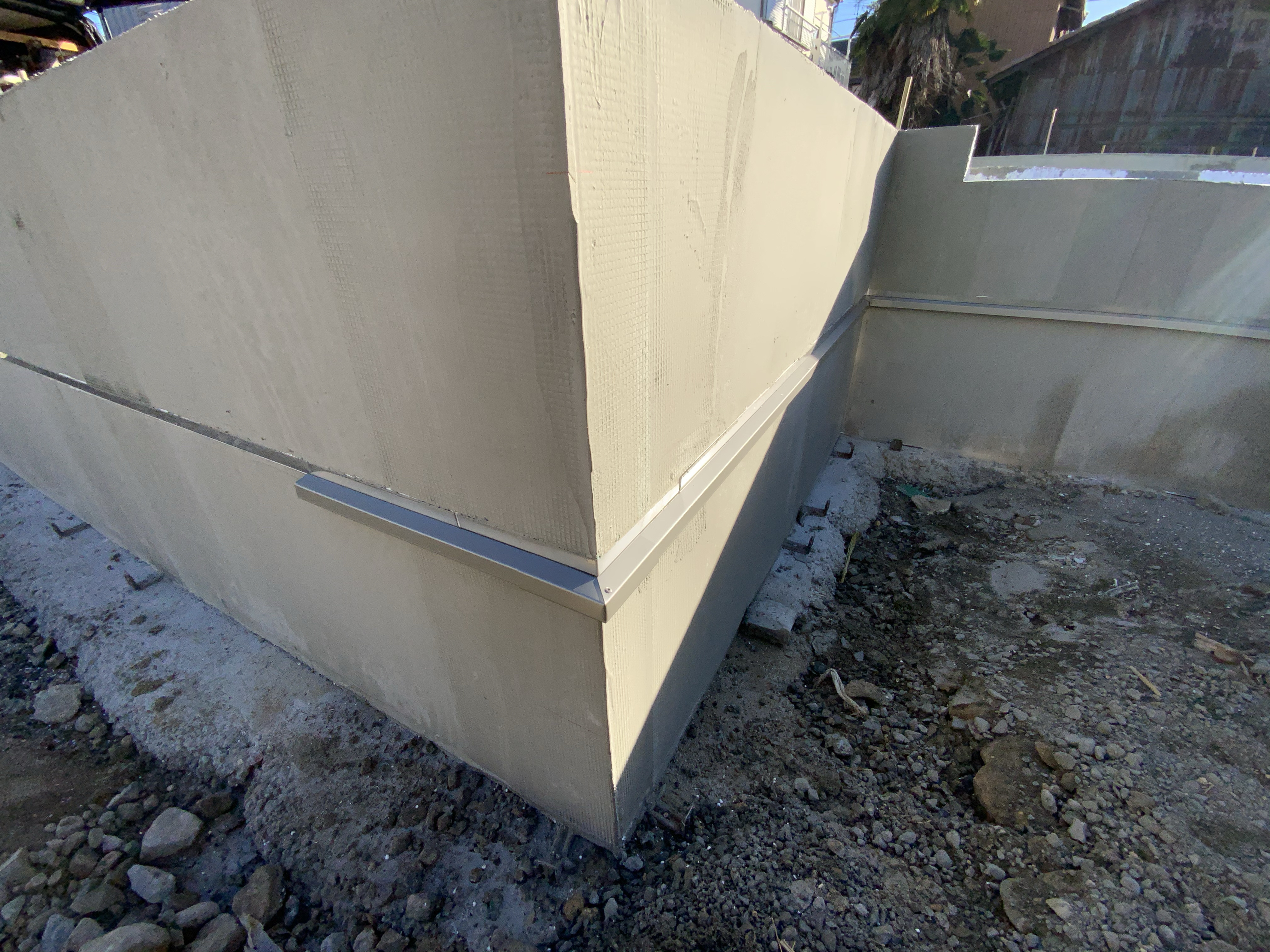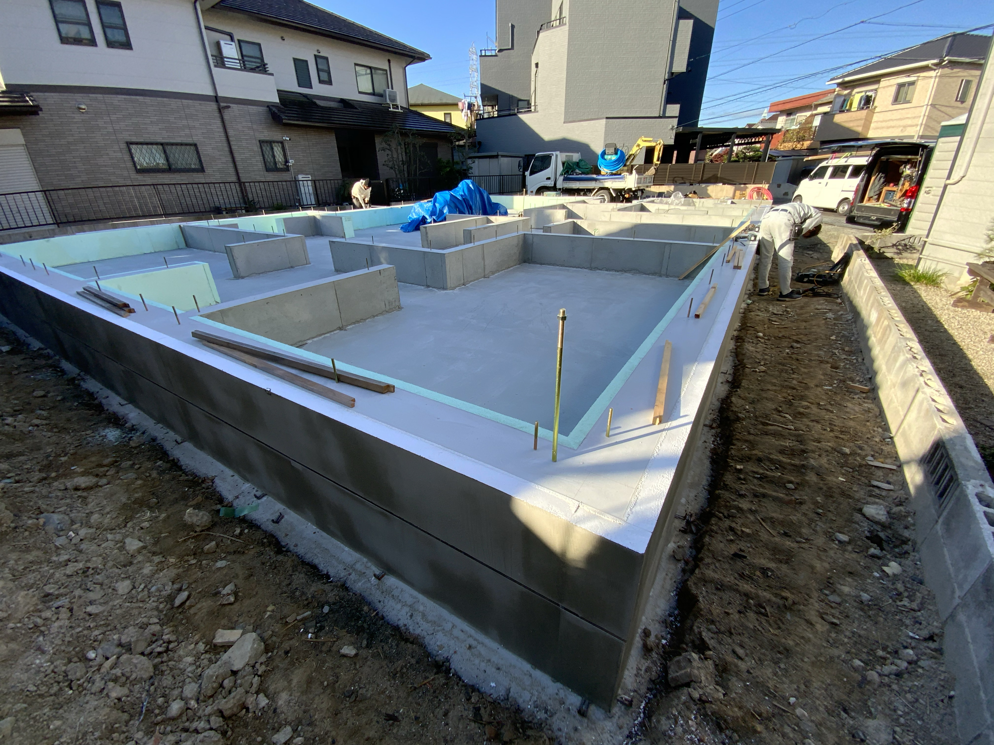 立上りの型枠が外され、基礎外断熱に樹脂モルタルを施工しています。