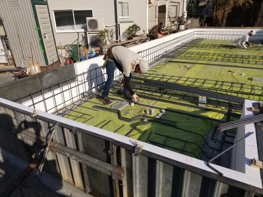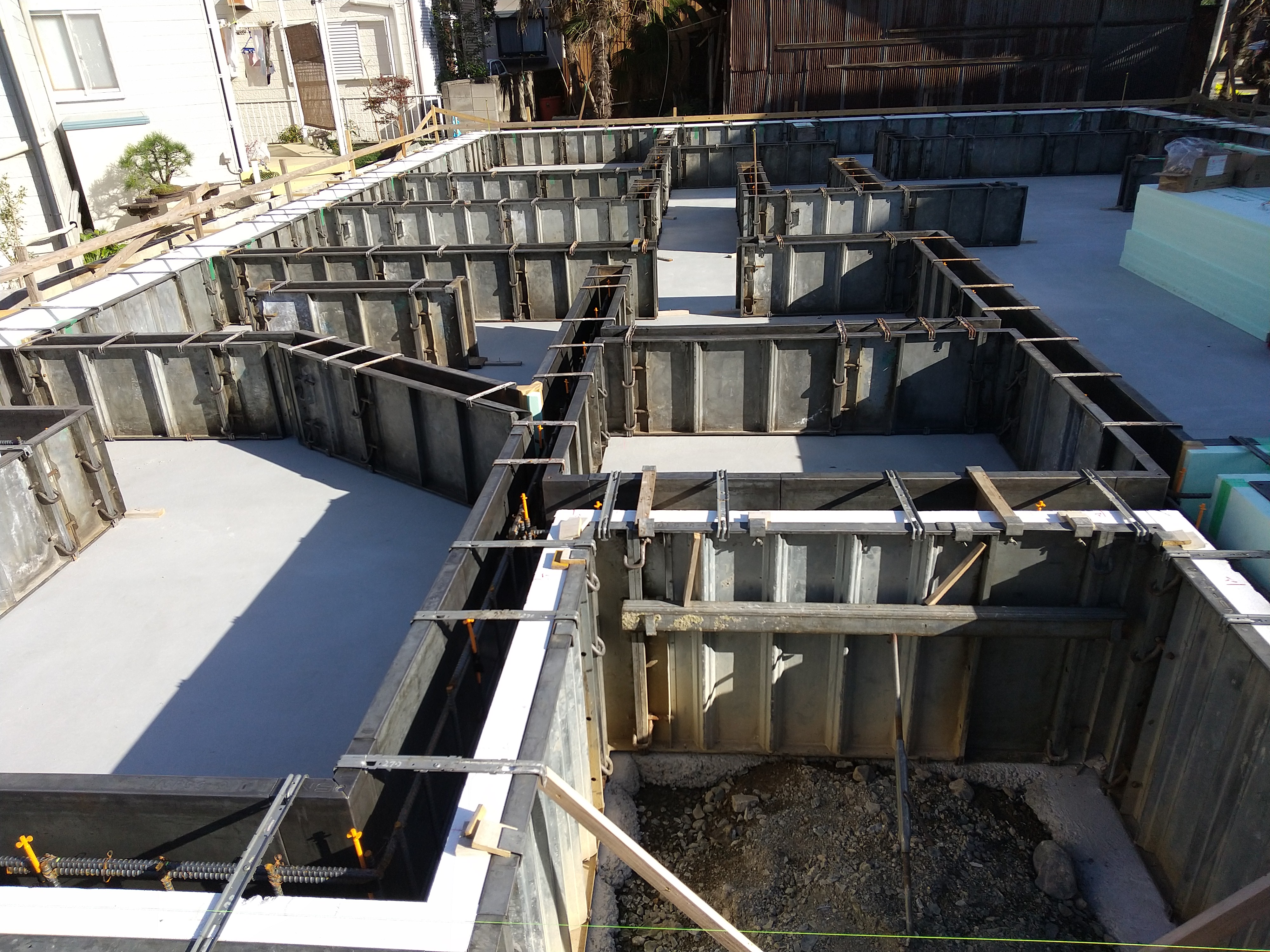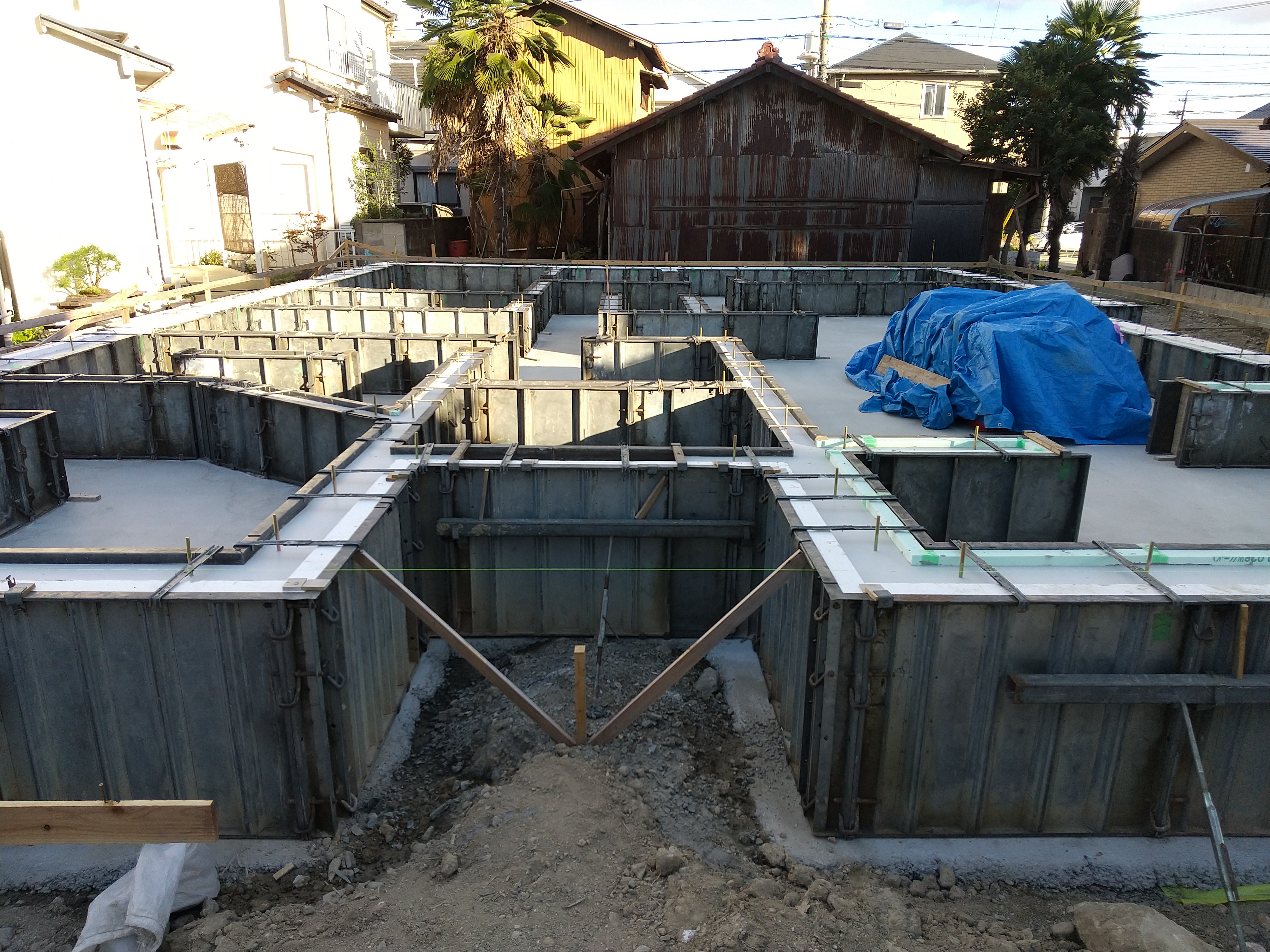 20日に配筋検査(JIO自主検査)をhさんに行ってもらい、コンクリートの打設をしました。人通口を設けたり、床下も床上と一緒に換気をするため内部の立ち上がりは梁として機能しないため、地中梁で強度を出しています。配筋はかなり複雑ですが、ご覧の通りきれいに配筋されています。コンクリートによって見えなくなってしまうのが勿体ないくらいです。