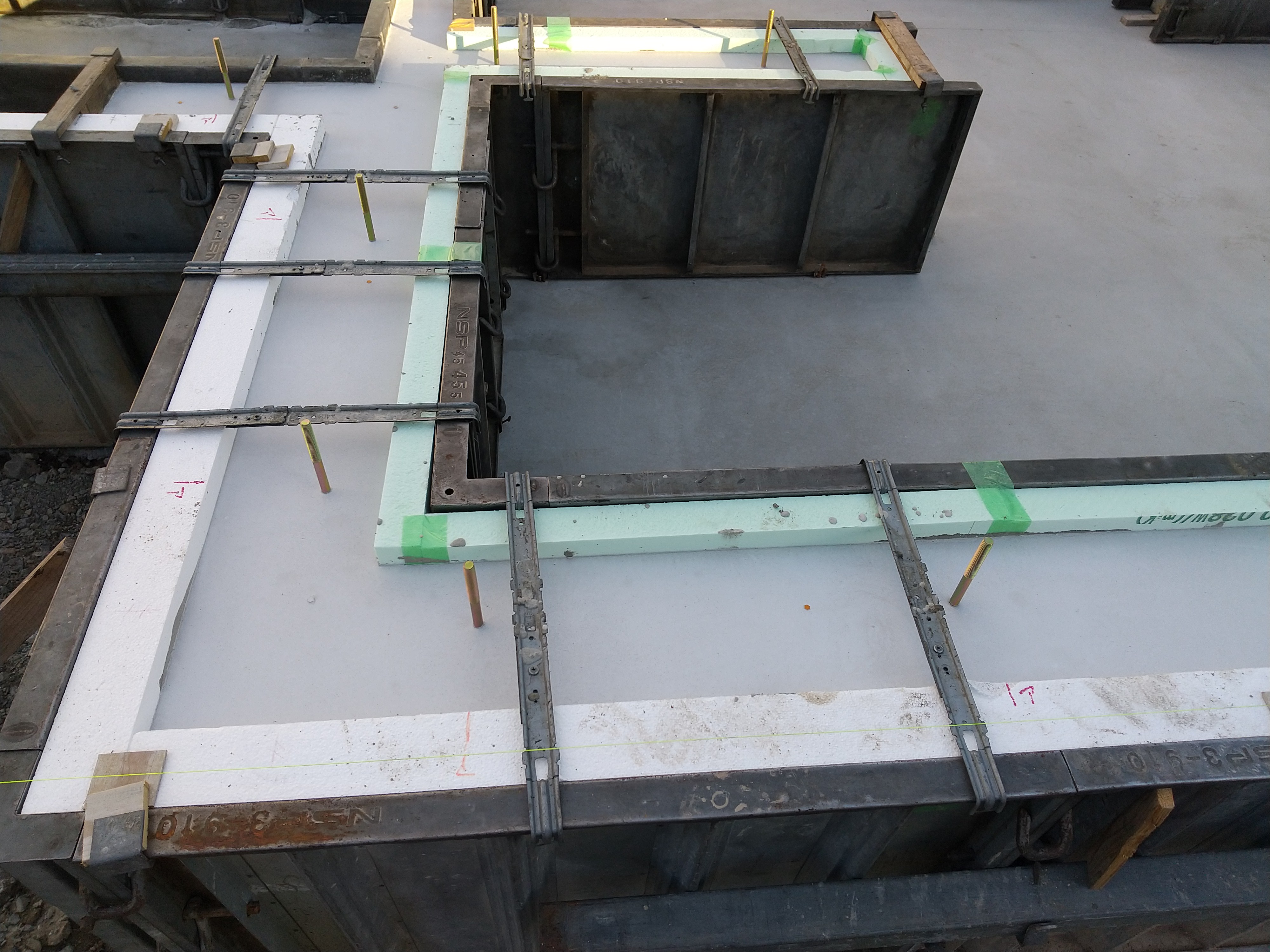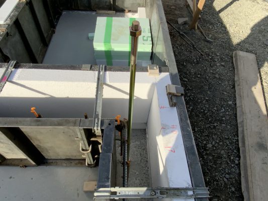 印を付けているところに、ホールダウン金物が設置されています。立上り内部の断熱材も施され、打設の準備万端です。