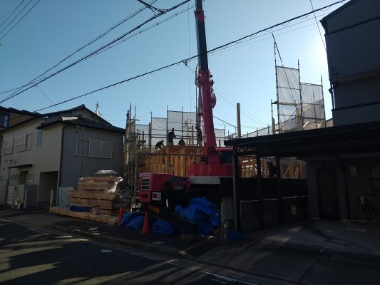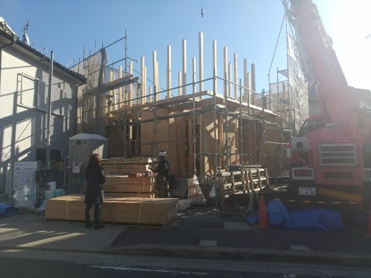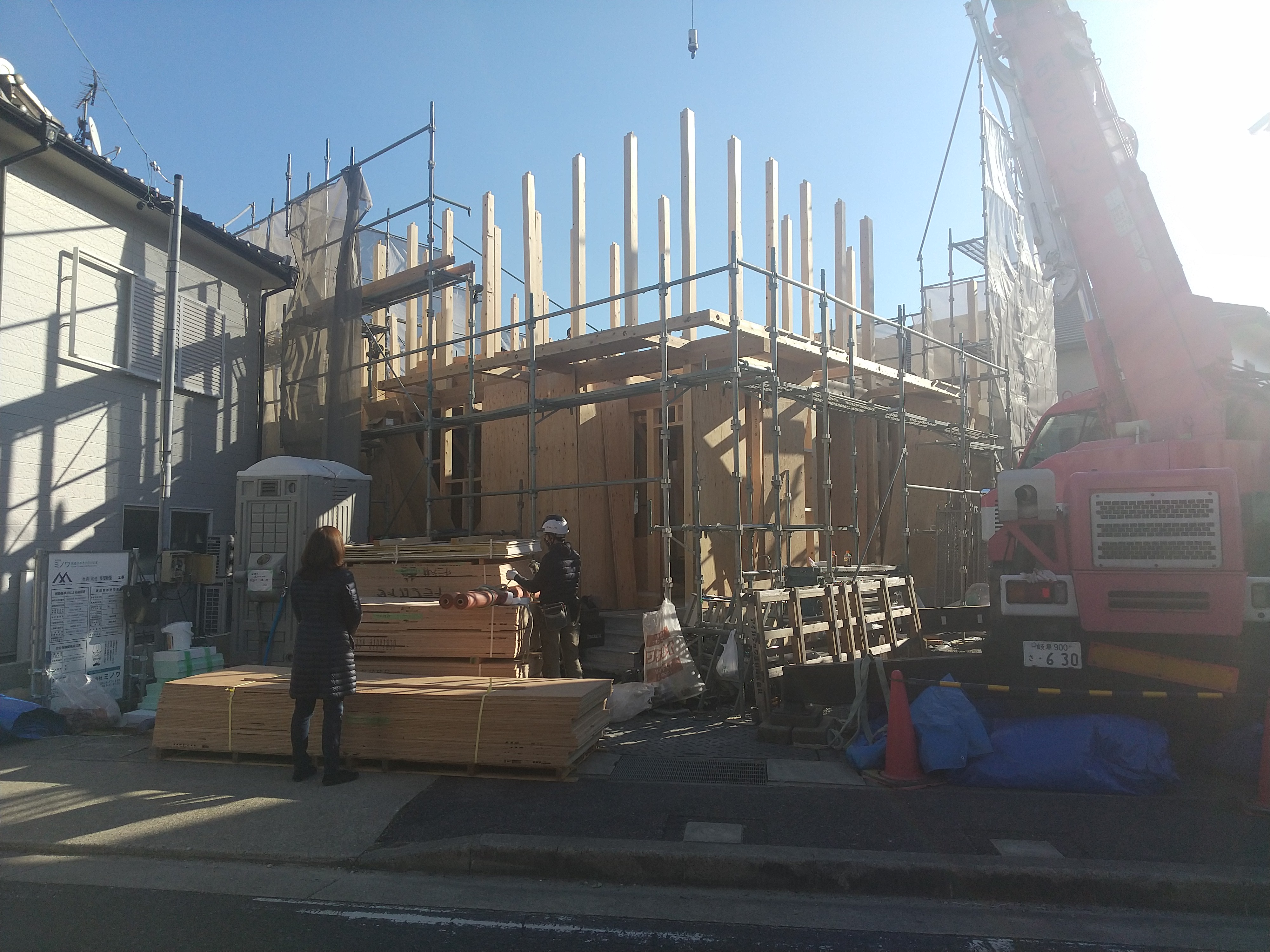 明日の日柄が良いので、今日、明日と2日間で上棟です。心配していました雪もどこへやら、大工さん達は上着を脱いで作業するくらい良いお天気に恵まれました。本日は大工さん8人とa監督、kちゃん、tレッカーさんの11人です。