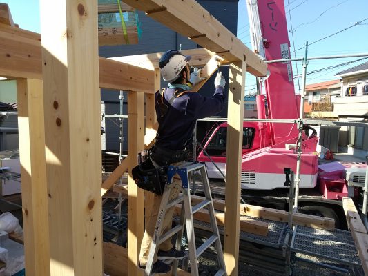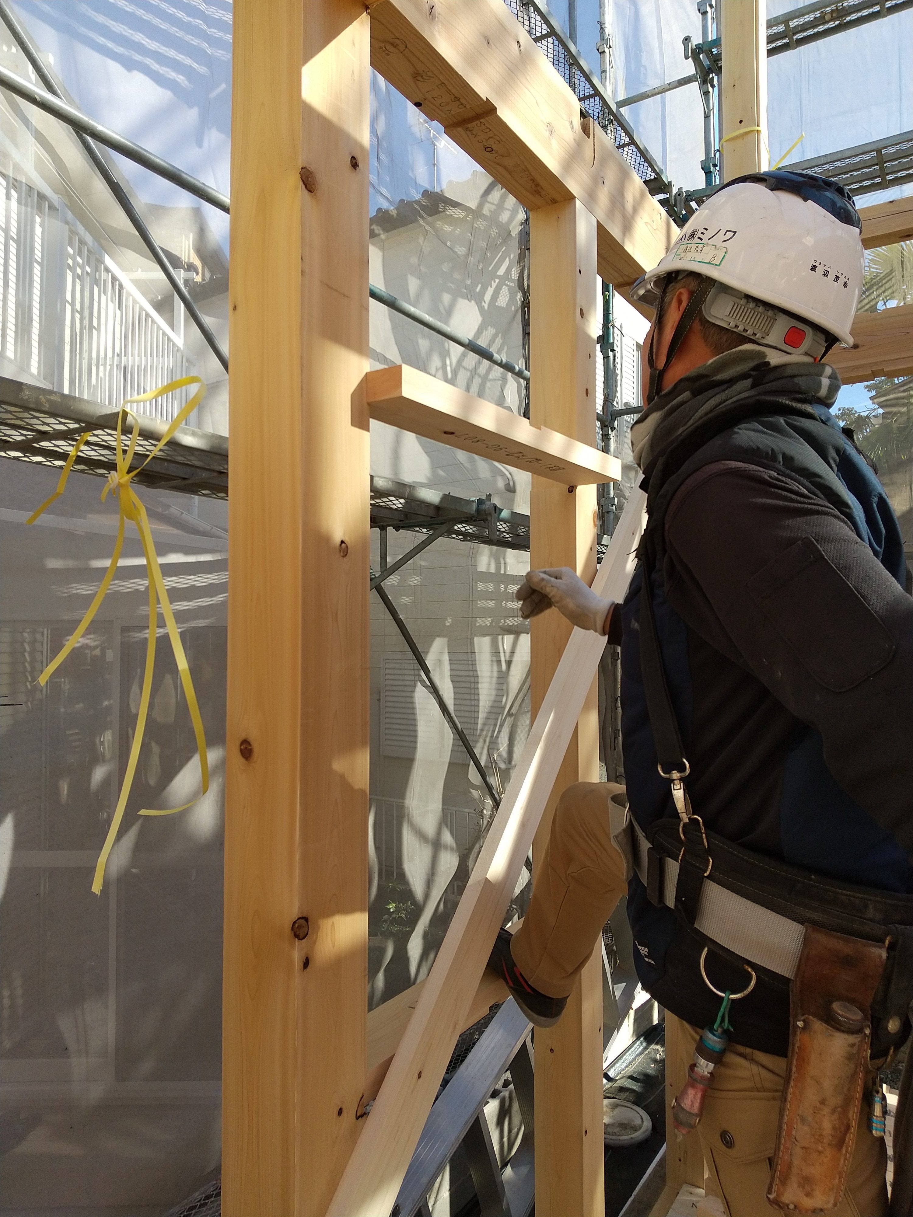w辺s幸大工さんの持ち場は、窓マグサ、間柱なんですね。ミノワ棟上げ立ち合い3回目、無言の役割分担が少しわかってきました。