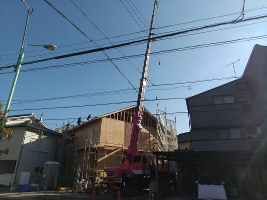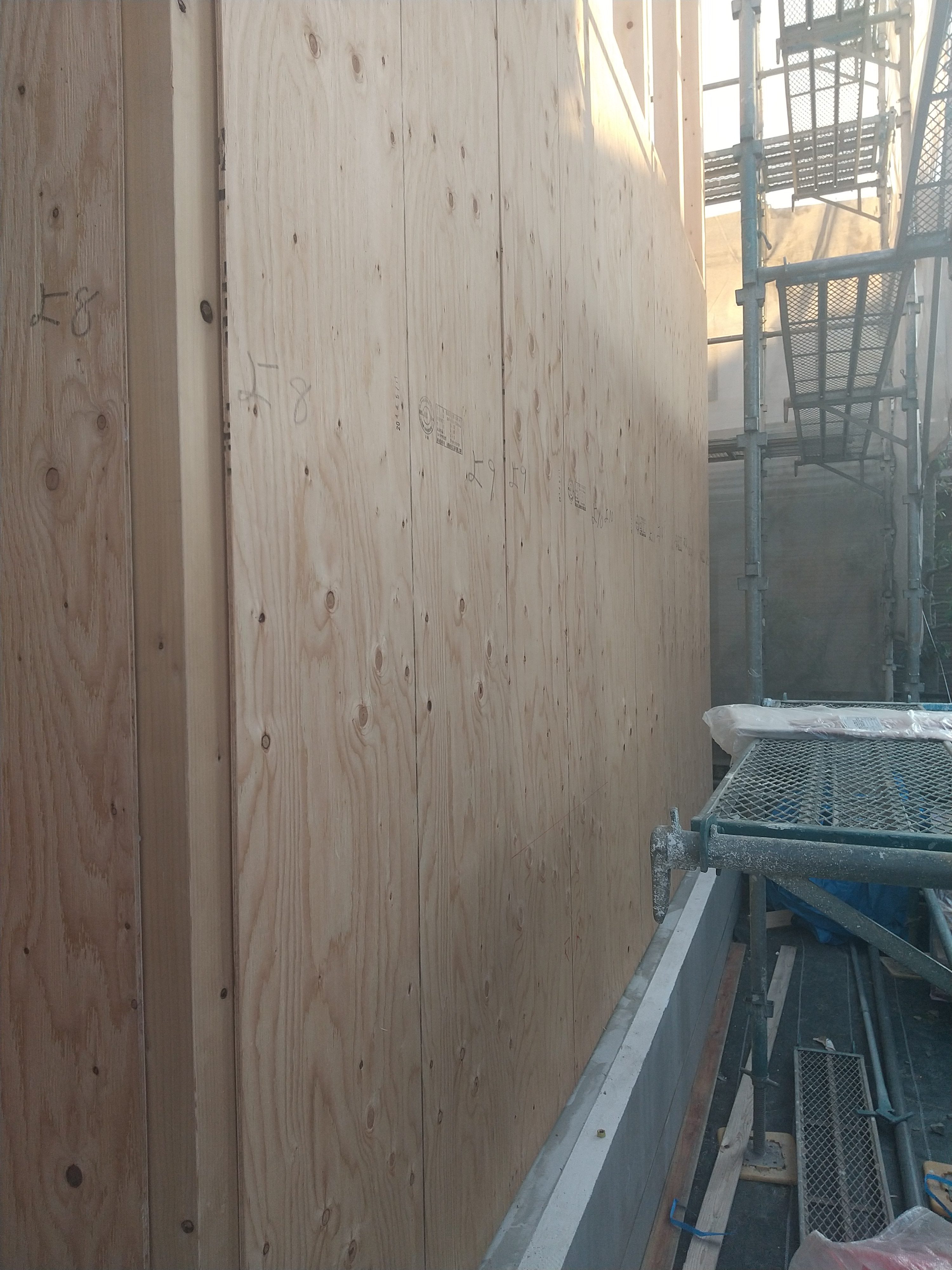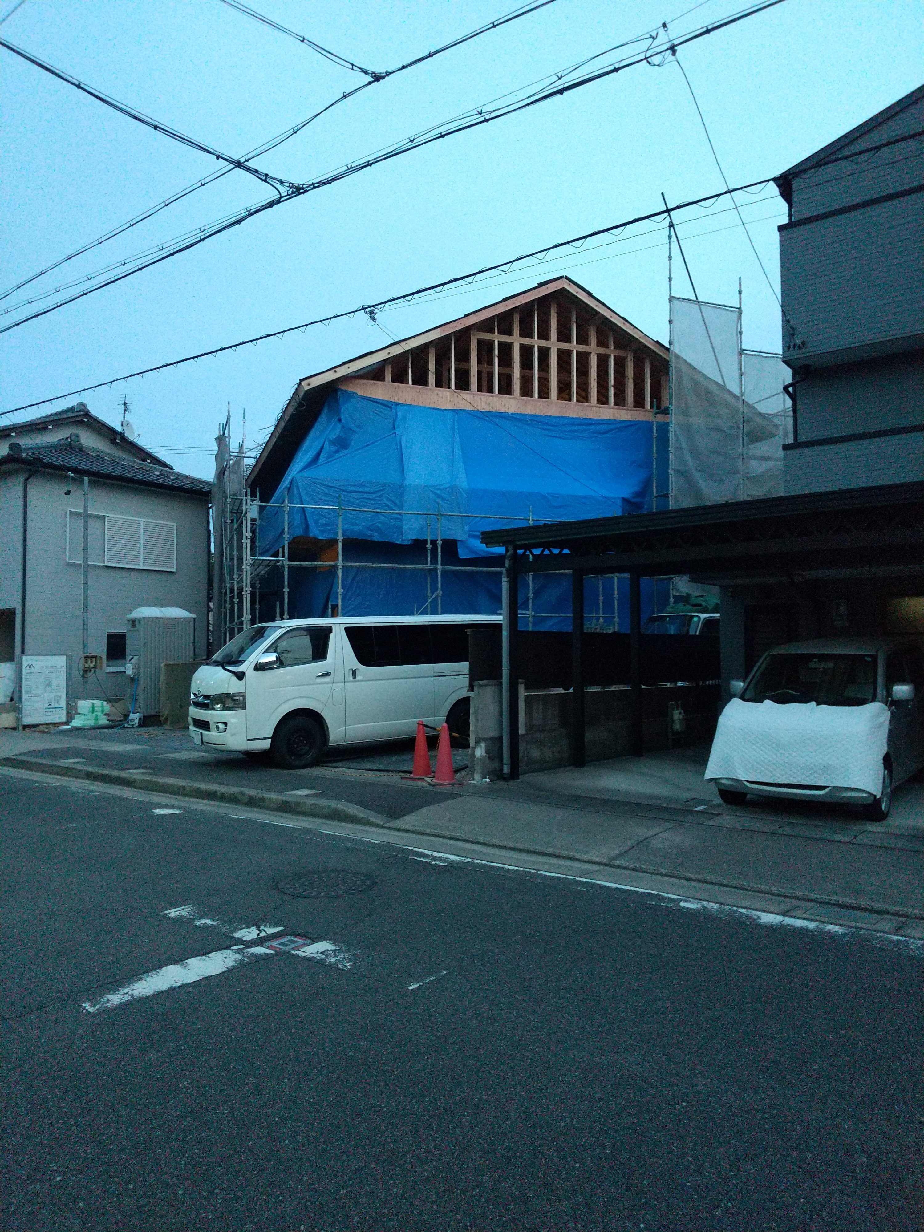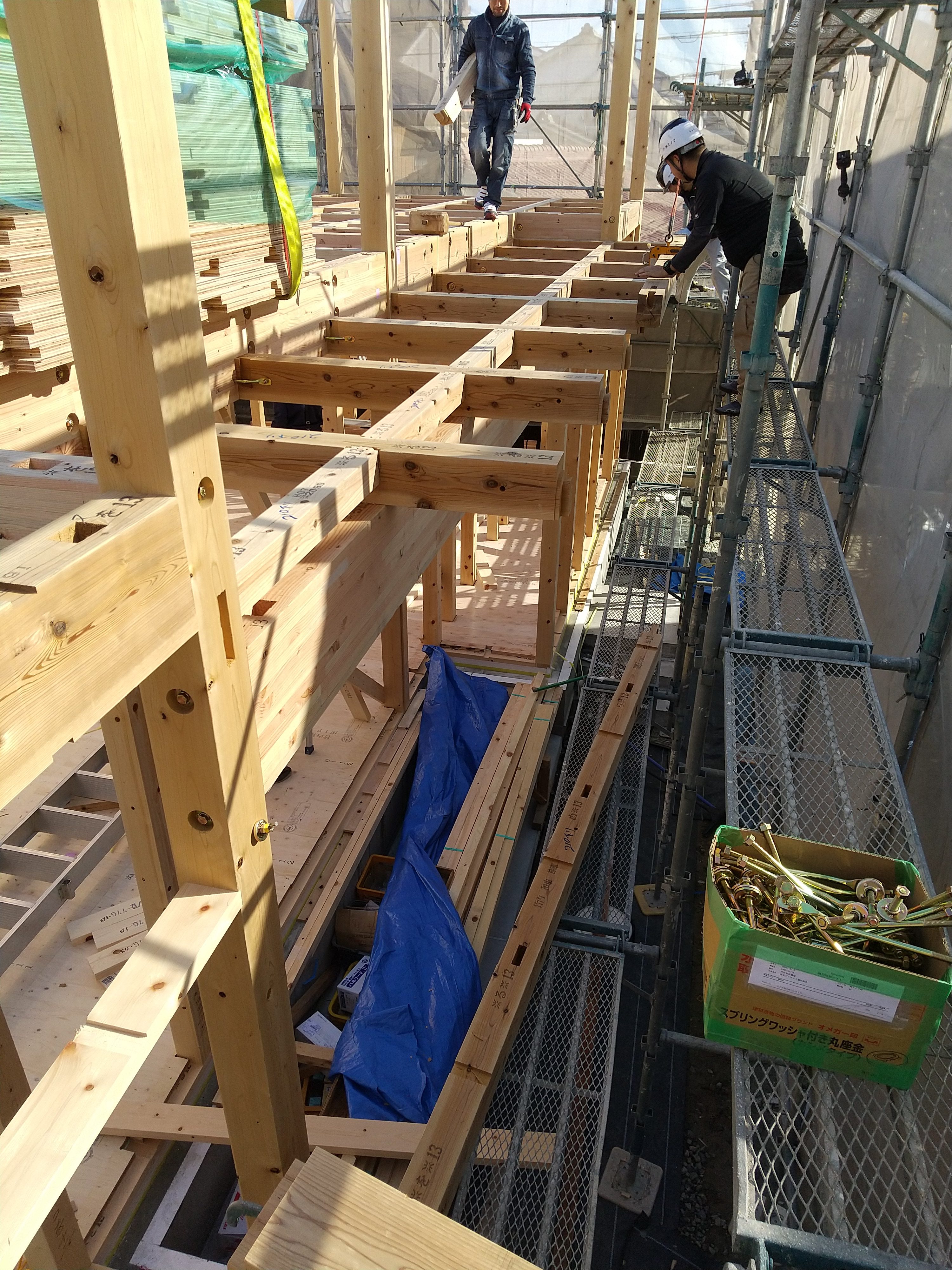 今回は、外周部の耐力壁として構造用合板を使用しています。上棟ではレッカー車もありますので、ここまで皆で進めておくと後が楽なんだそうです。明日も引き続き危険な作業ですので、無事に上棟が終えられます様に。