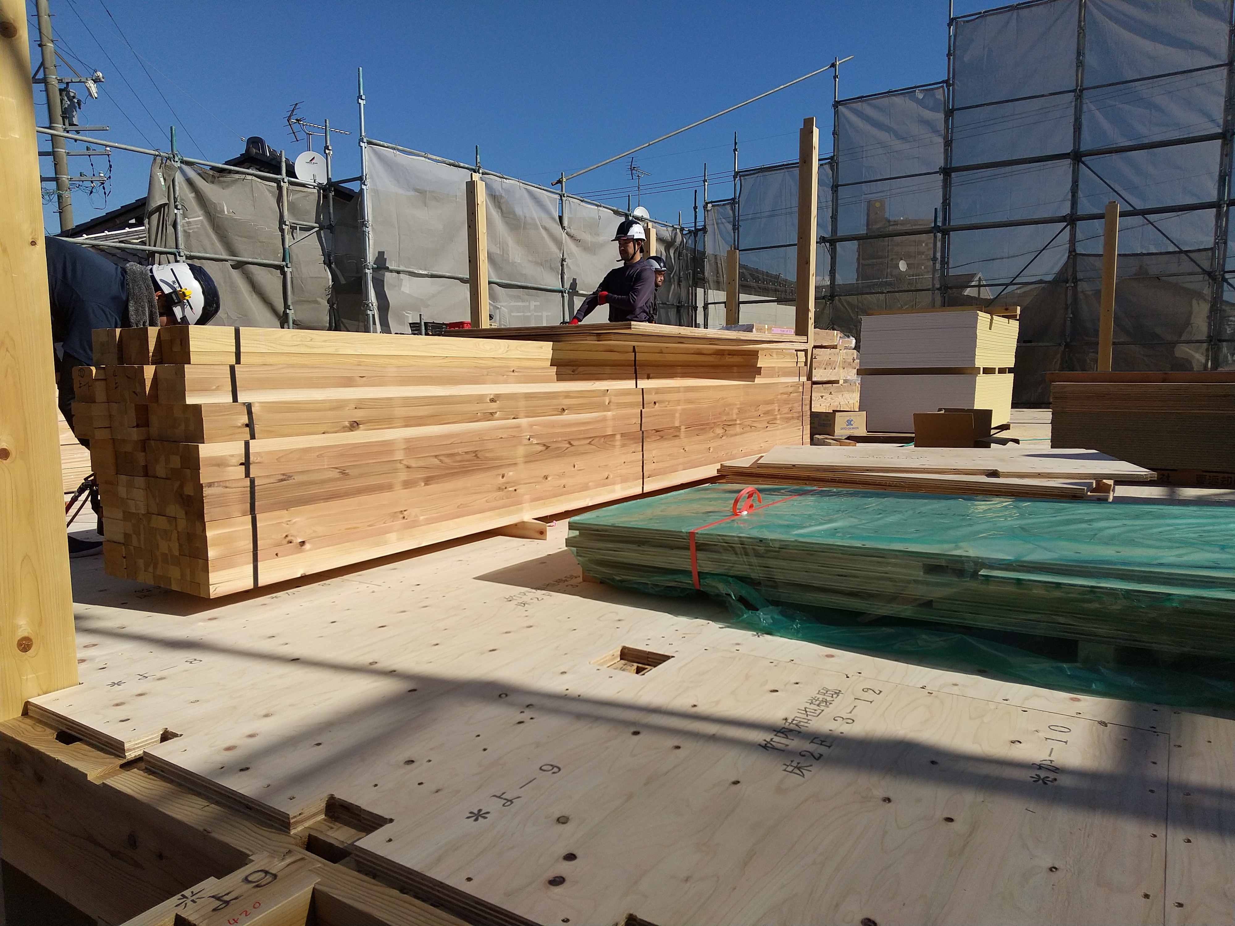 大きなt様のお宅は2階の剛床(床の合板下地)まで張ってお昼休憩です。剛床工法はいいですね、根太工法と比べて、地震などの横からの水平力に抵抗力がある上に、この上棟の際に途中で2階の床に敷き詰めるので安心です。20年前はほとんどの現場がこの剛床方法ではなかったので、2階の梁を大工さんが組んでいる時は、見ているだけで鳥肌が立ったものです。