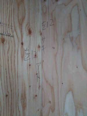 お父様に間違えて説明してしまいましたが、今回の耐力壁はプレカット工場で刻んだものではなくh典棟梁作の物でした。だからマジックの手書きの番付だったんですね。(1階は黒、2階は赤のペンでどの通りのどこに張るのか分かり易いように番付してあります。)