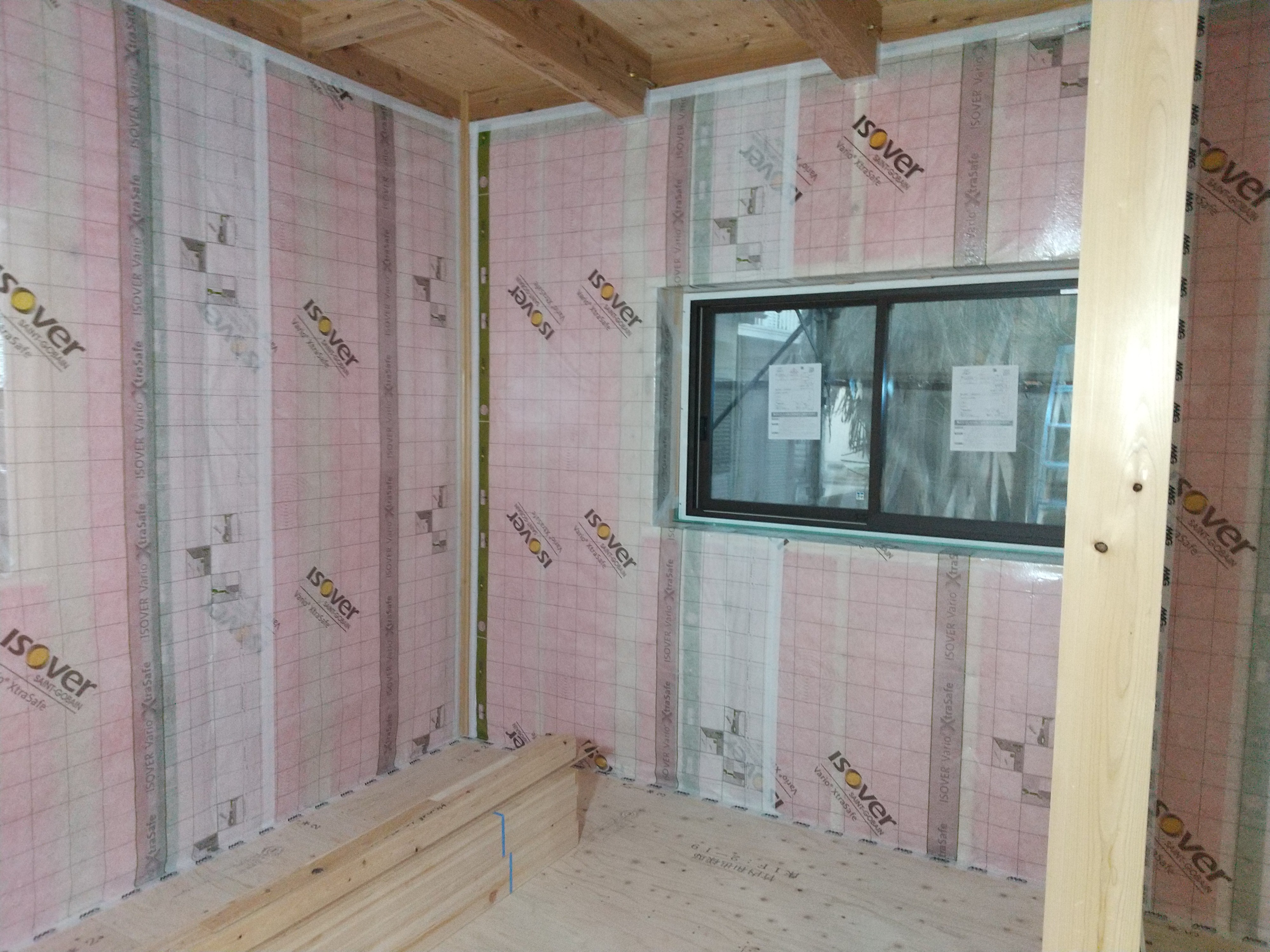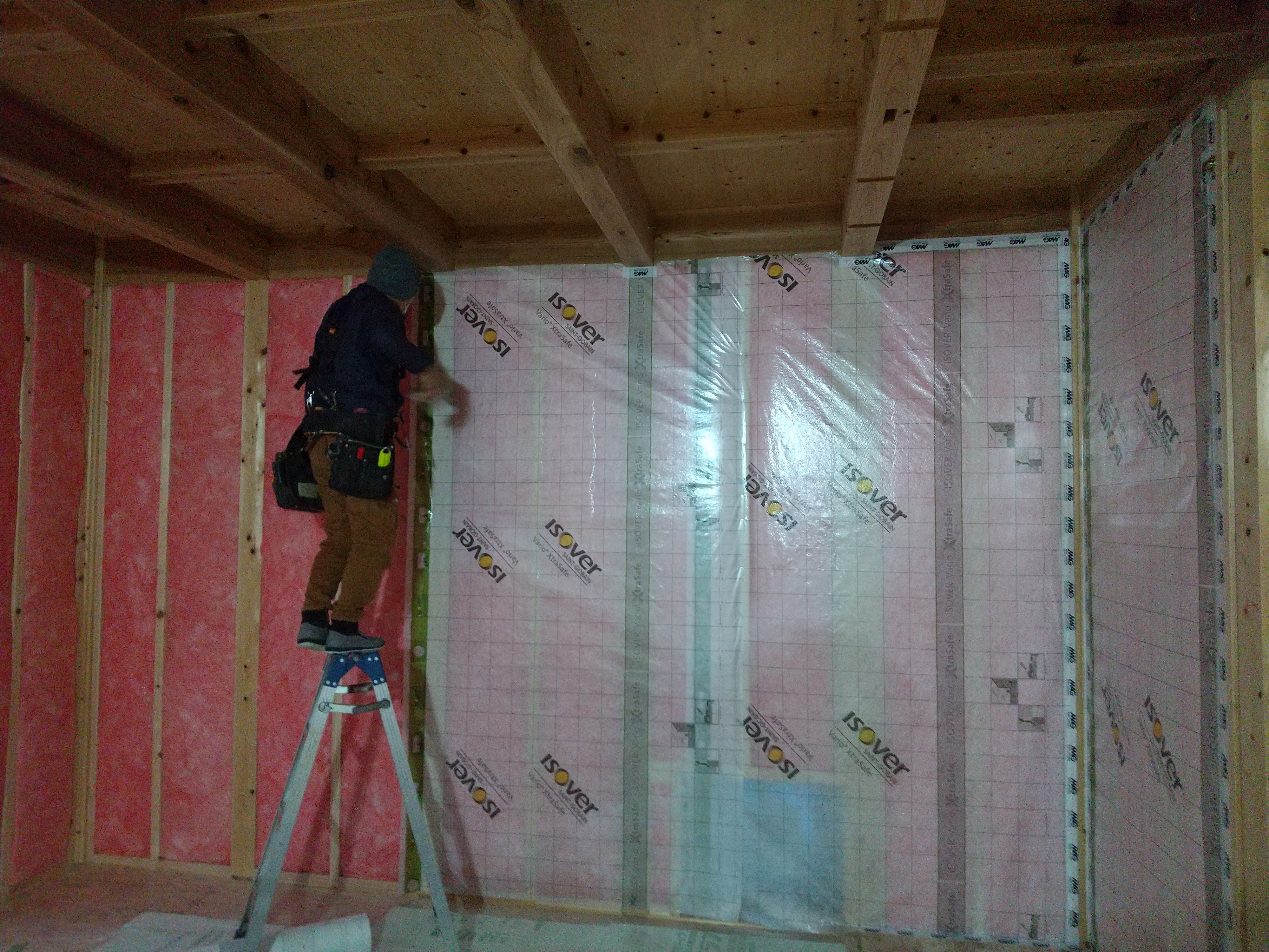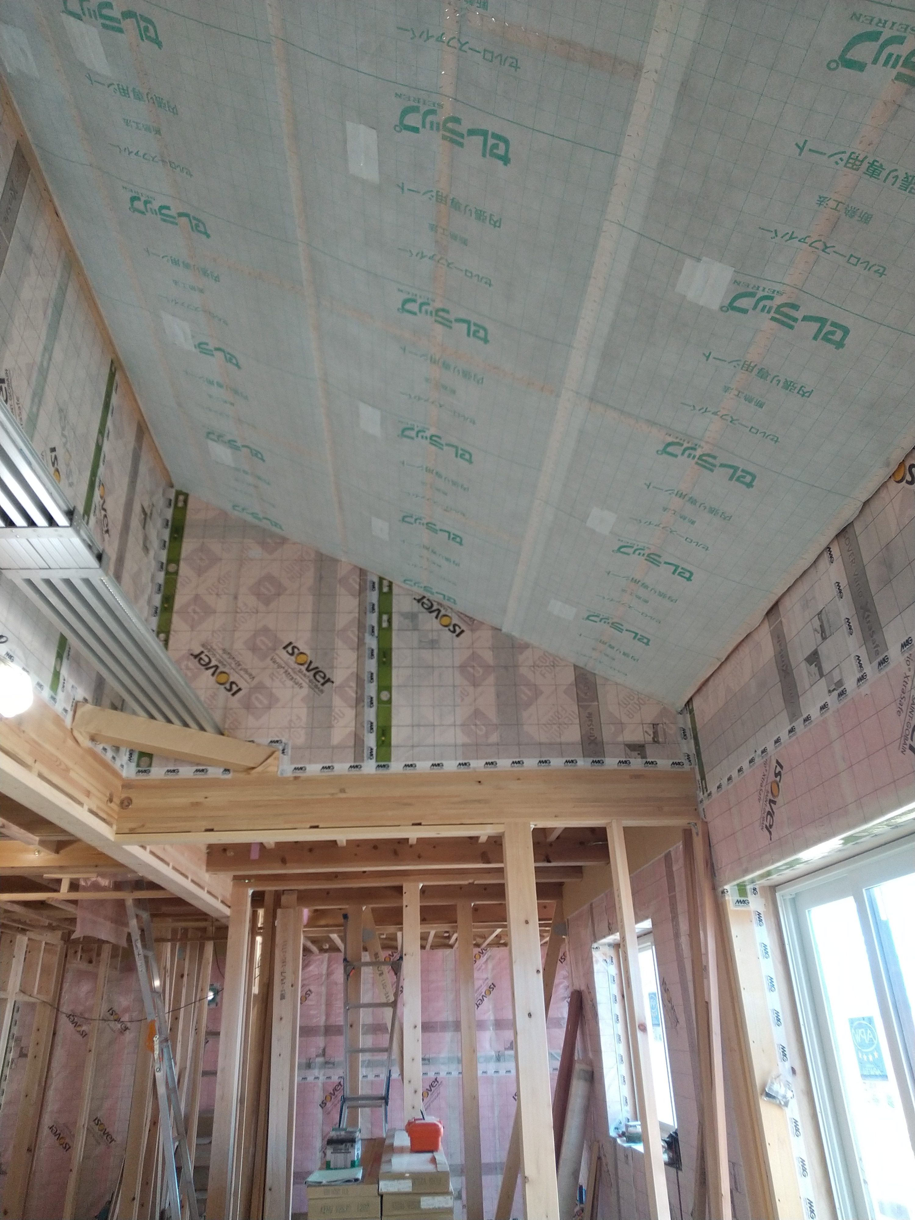 内部に入ると、巨匠k池大工さんが手際よくきれいに気密シートを張っています。1階はもうこんな様子。驚異のスピードです。