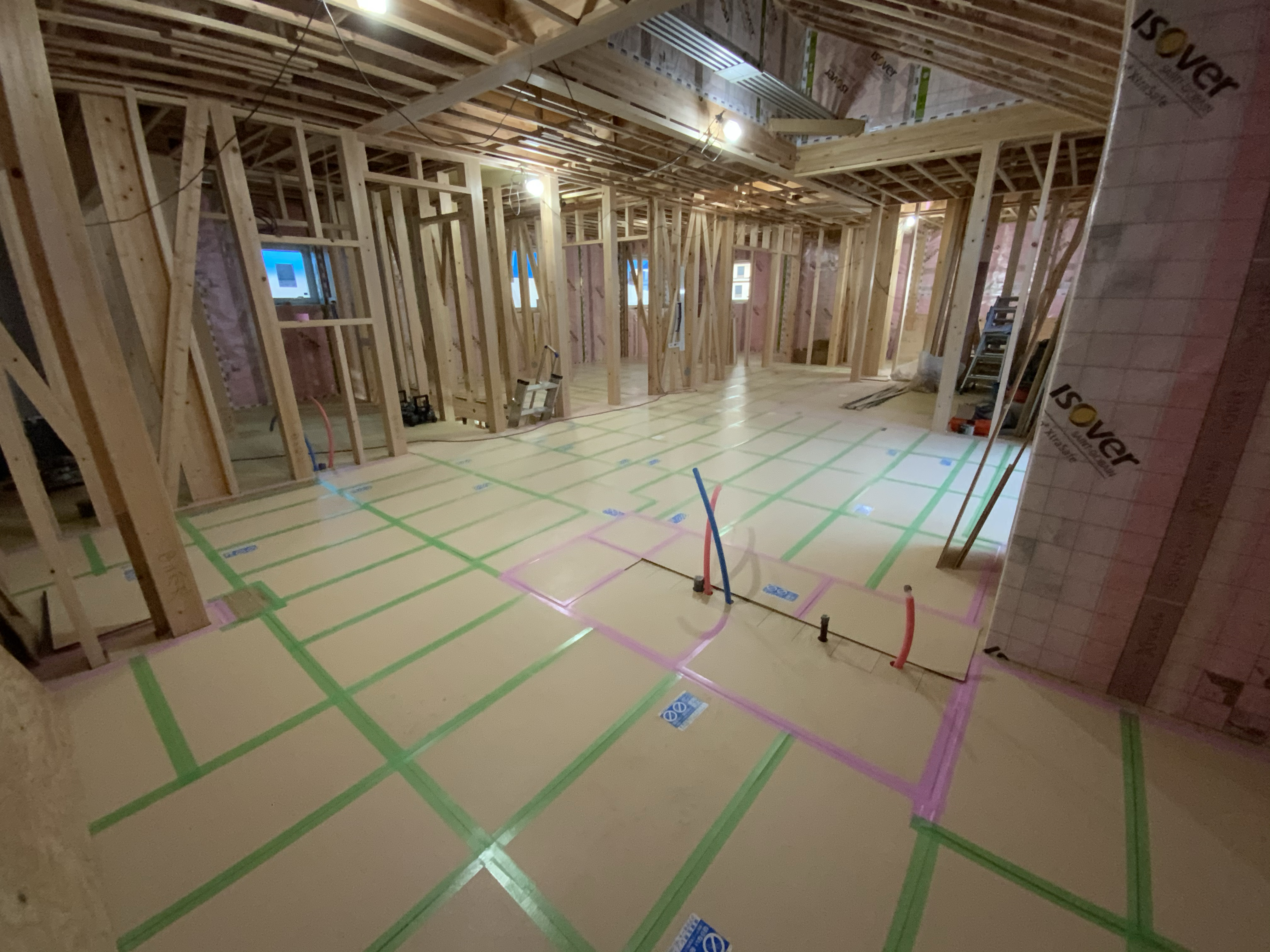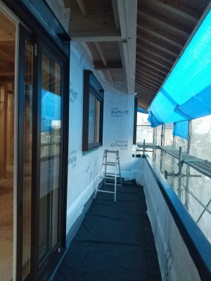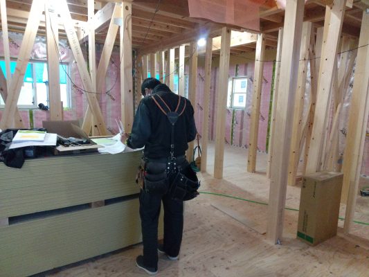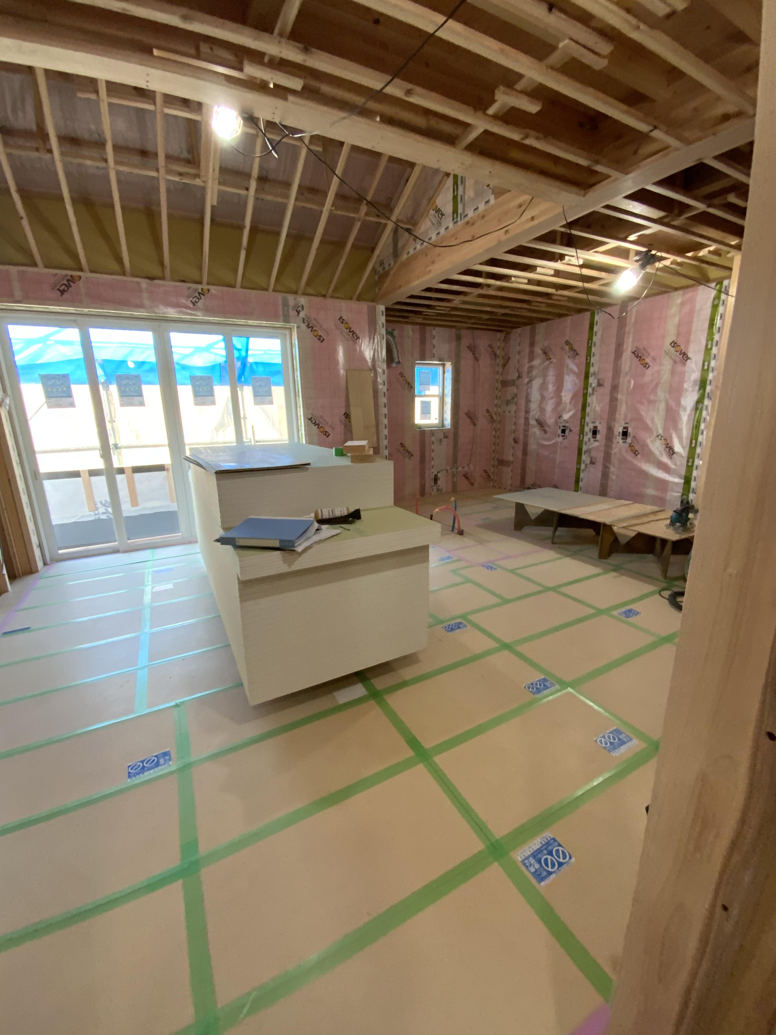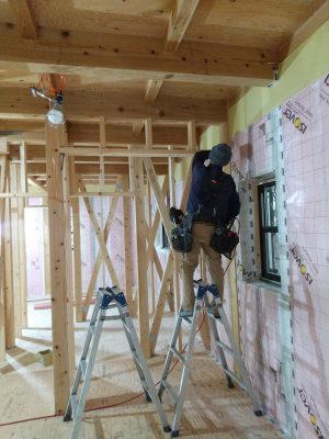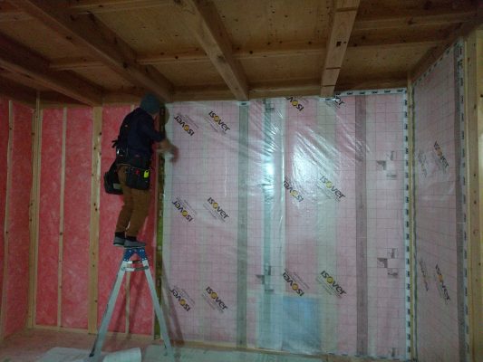 内部に入ると、巨匠k池大工さんが手際よくきれいに気密シートを張っています。1階はもうこんな様子。驚異のスピードです。