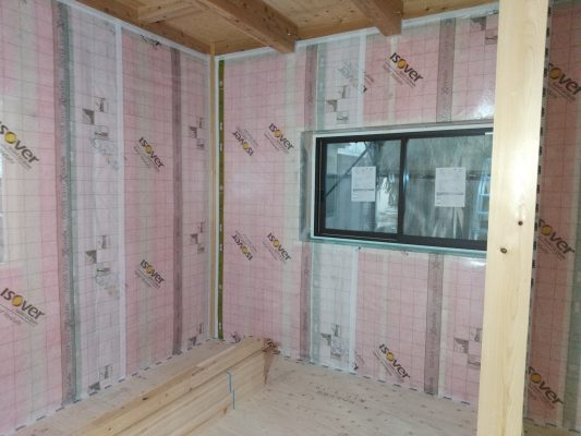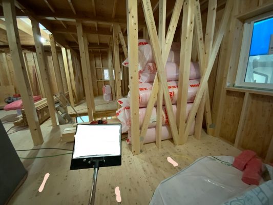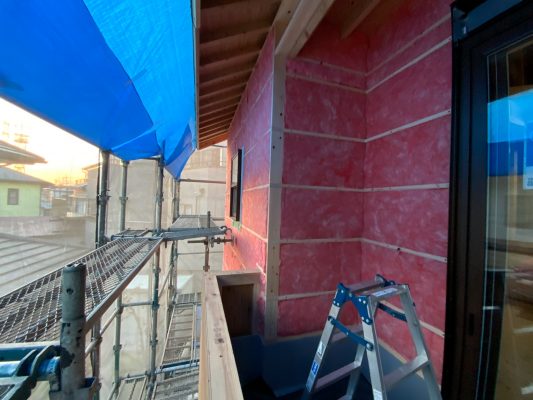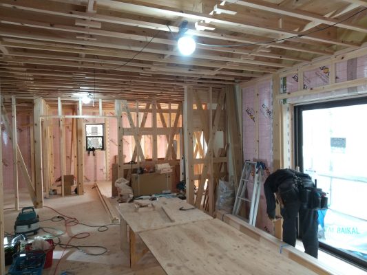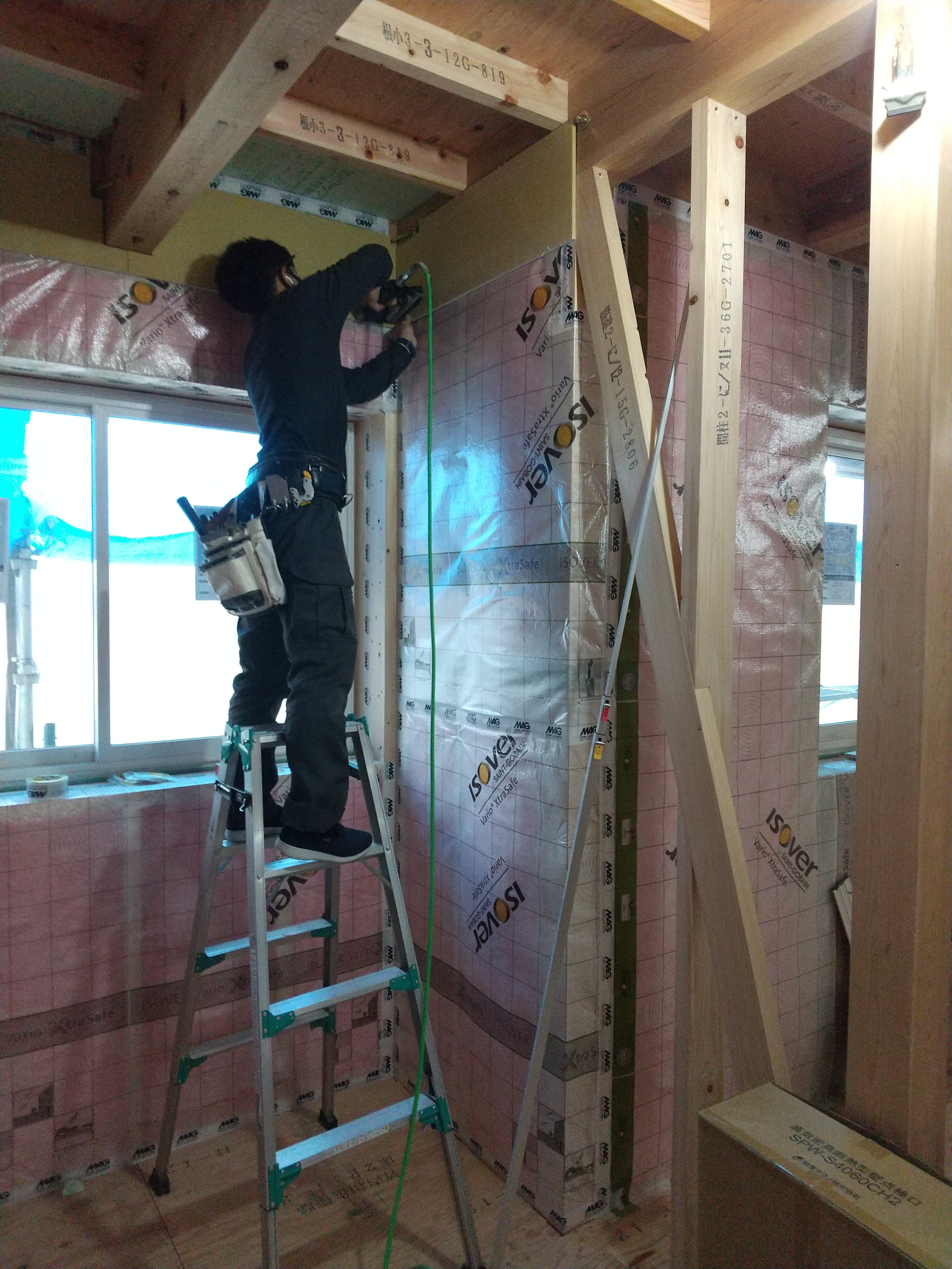 2階は若手大工のk保木君が黙々と断熱材をはめ込んでいます。10日の日曜日にt様達と棚と電気打ち合わせをした時とは一転、暖かい現場内です。と呑気な事を言っている場合ではないです💦
