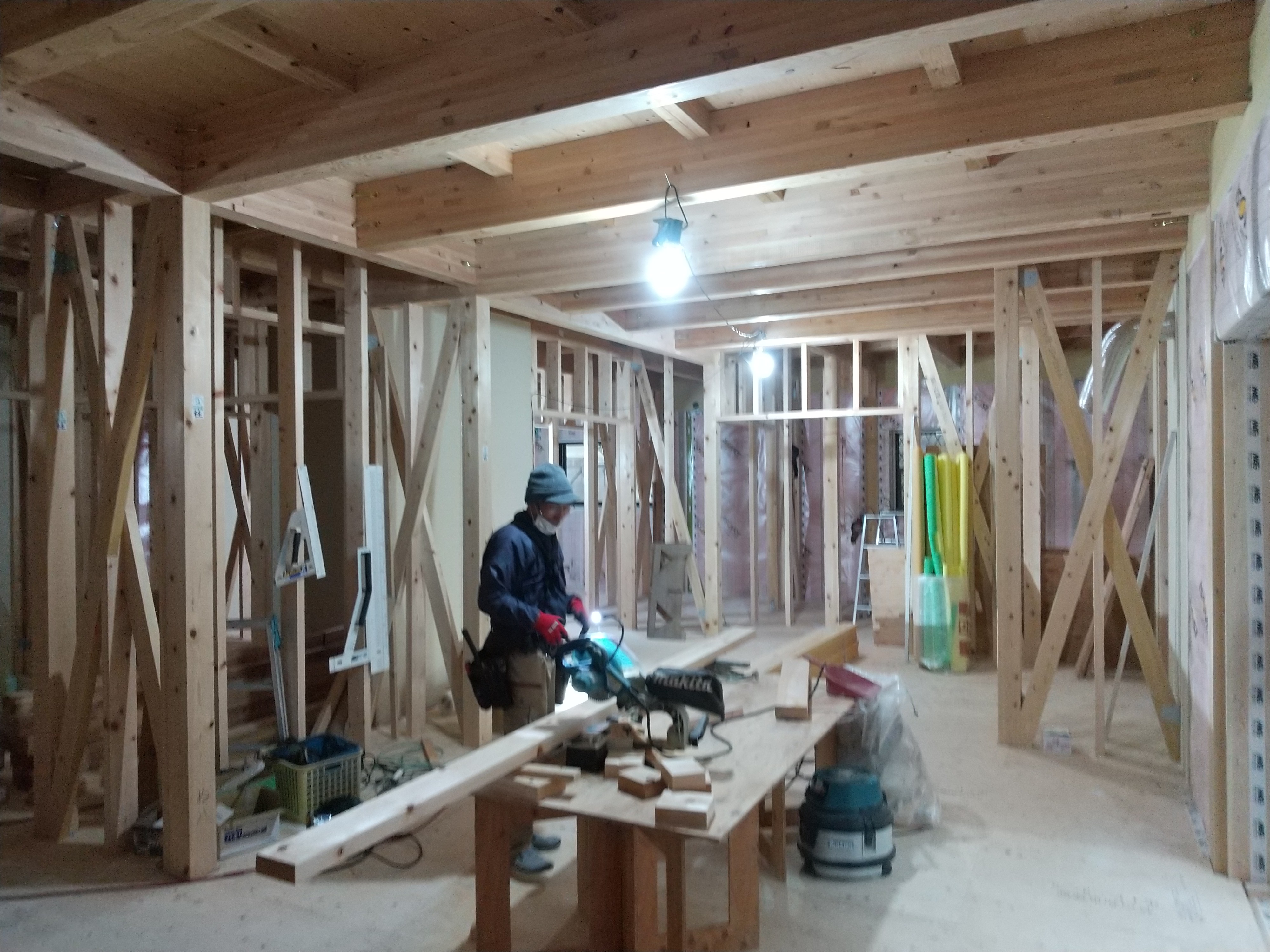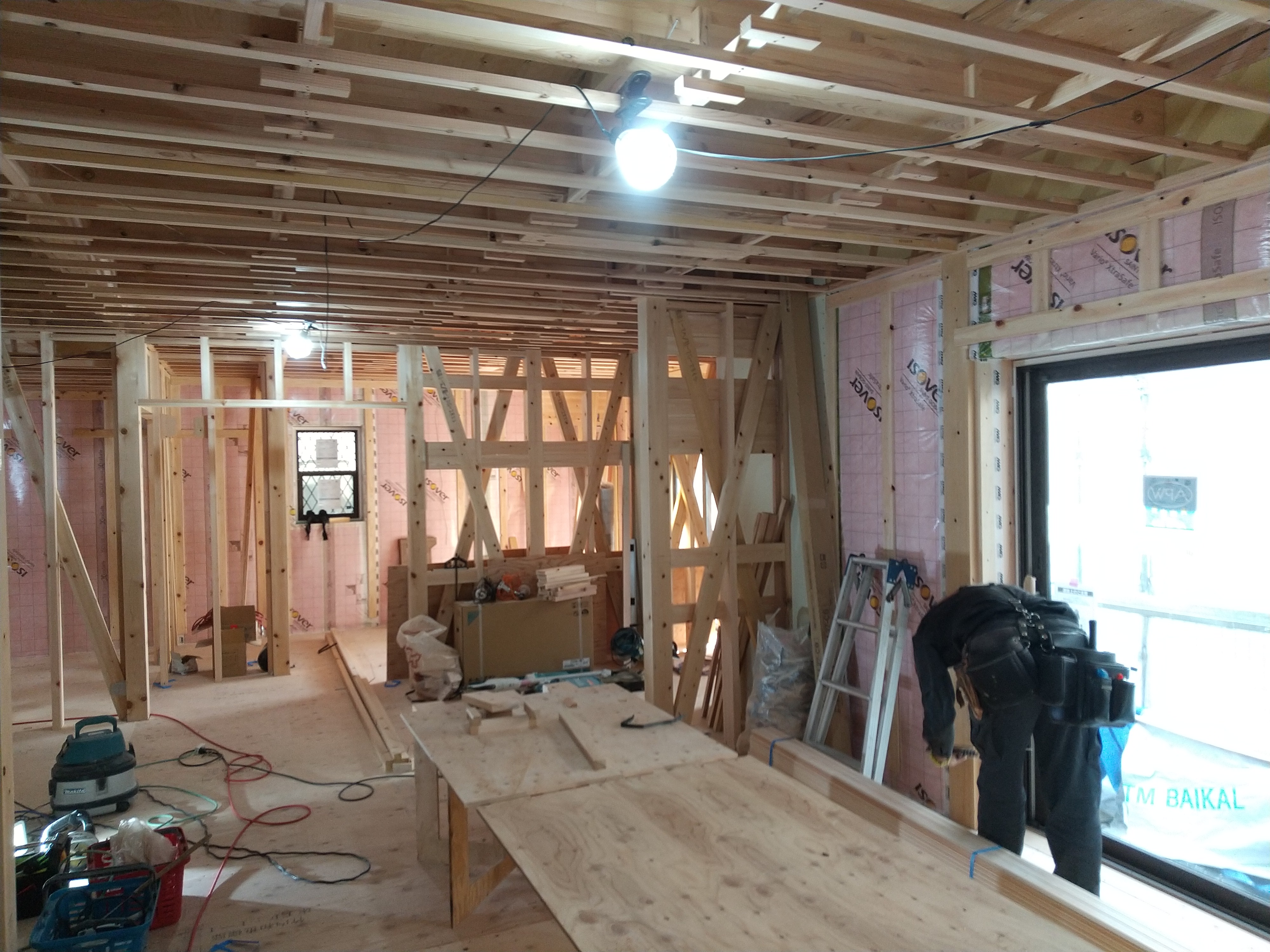 先日見に来てからまだ4日しか経っていませんが、k池巨匠によって1階は既に天井下地が組み終わりかけています💦h典棟梁は外壁に面した壁の下地を張っています。