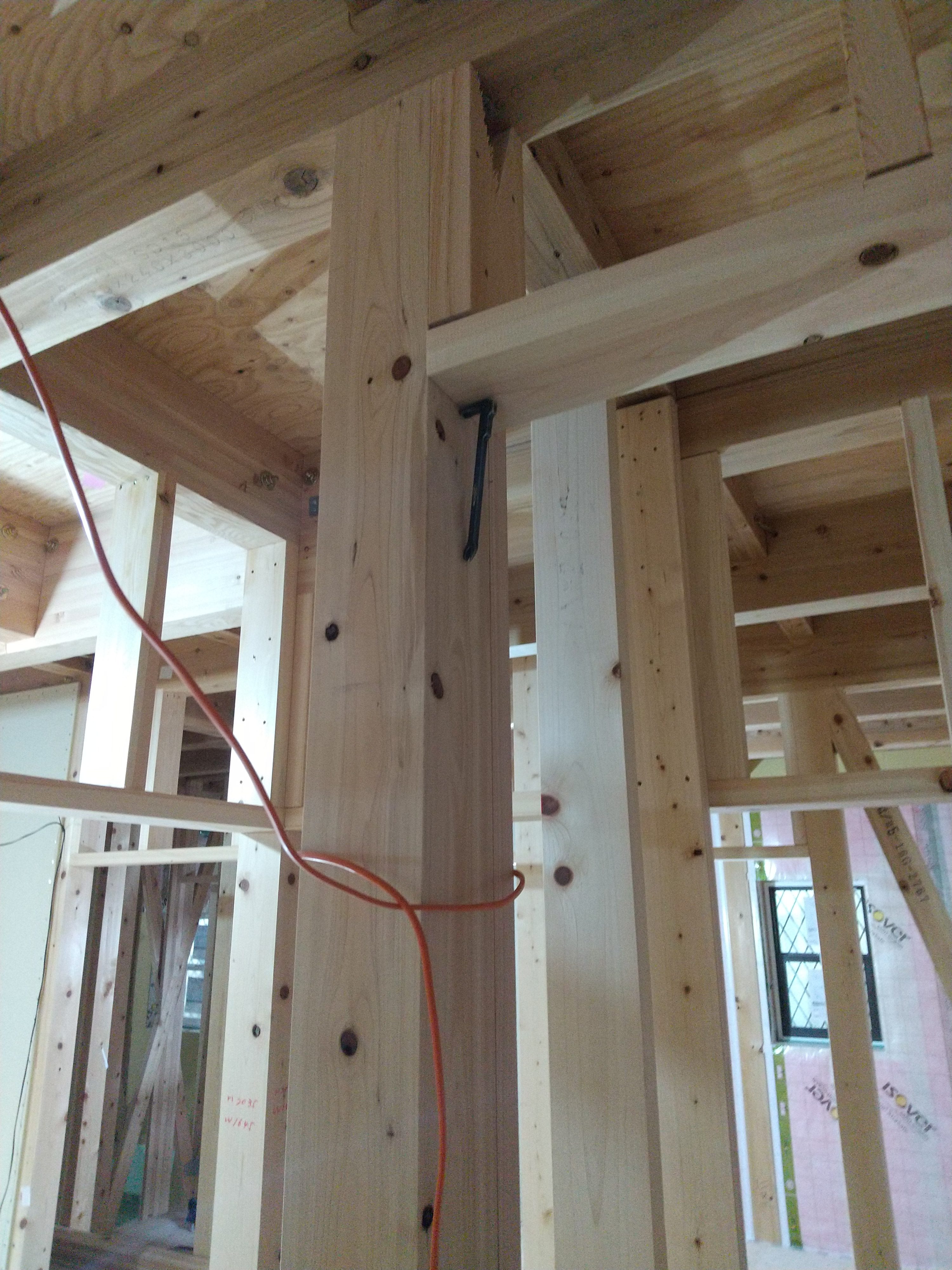 基礎と土台を緊結するためのアンカーボルトも設置されています。(ホールダウン金物は、柱と土台を緊結する金物で、地震力や風圧力によって柱に引き抜きの力がかかる部分に用いられます。)ただ取り付けるための物ではなく、とても重要な金物達なのです。