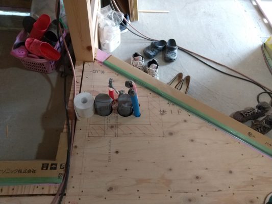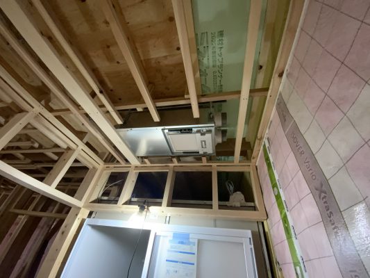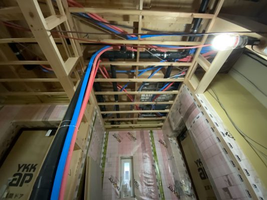 今日は昨日に引き続き、t井設備さんチームが、配管を仕込みに来ています。ここは、2階世帯の玄関部分。2階のお風呂、洗面、トイレ、洗濯機の給排水が集まって1階に降りてくるパイプシャフトになります。パイプシャフトの位置は、いいところに収納などが1階にあればそこを少し拝借できるのですが、無いとパイプシャフトと気付かれない様にどうしたらよいかなど、案外気を遣います。