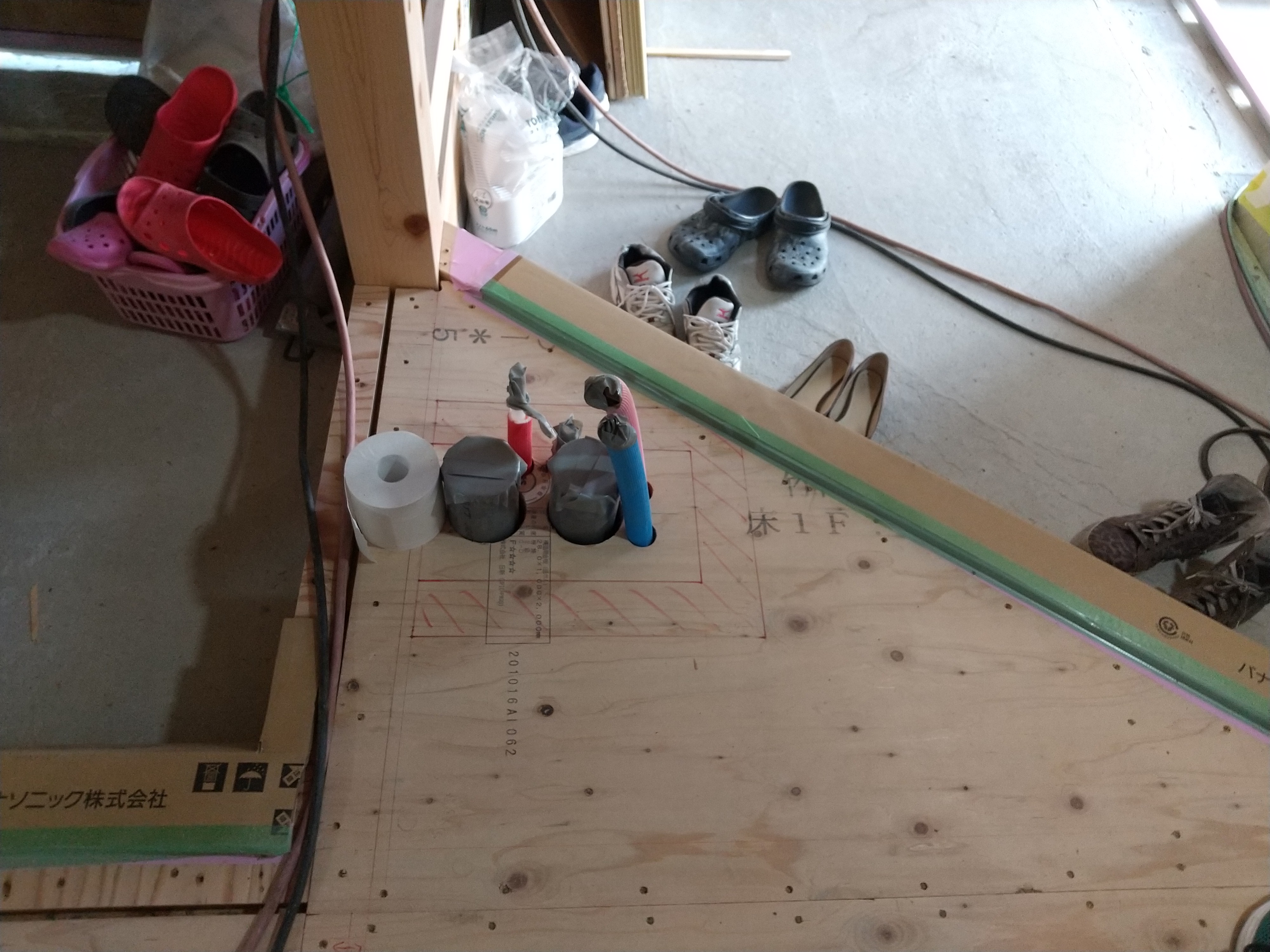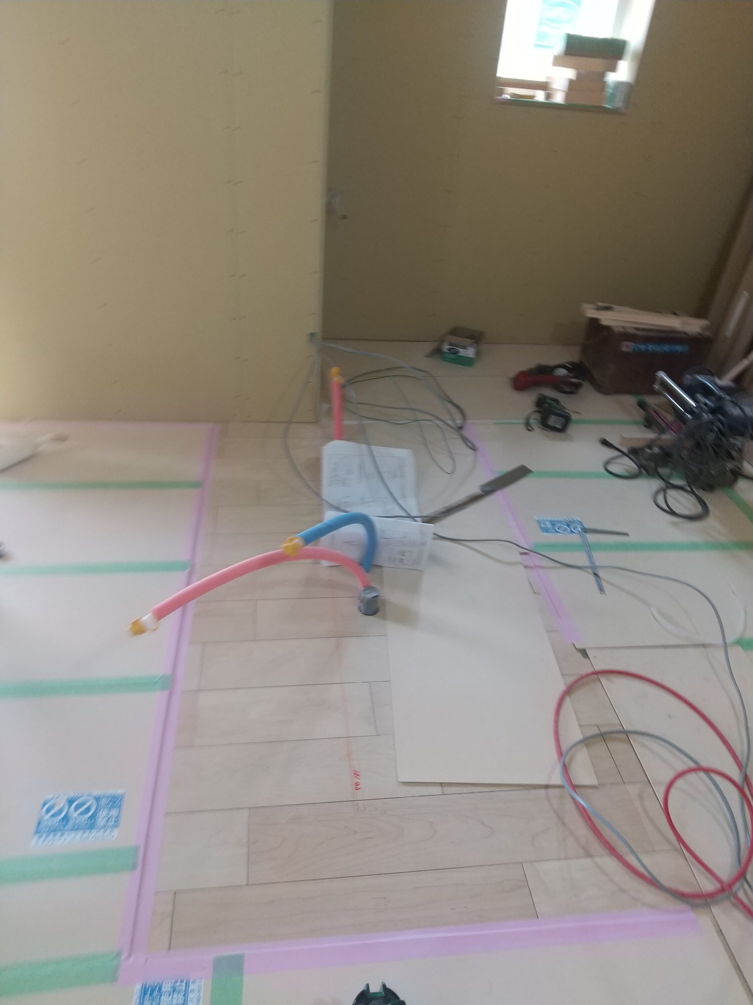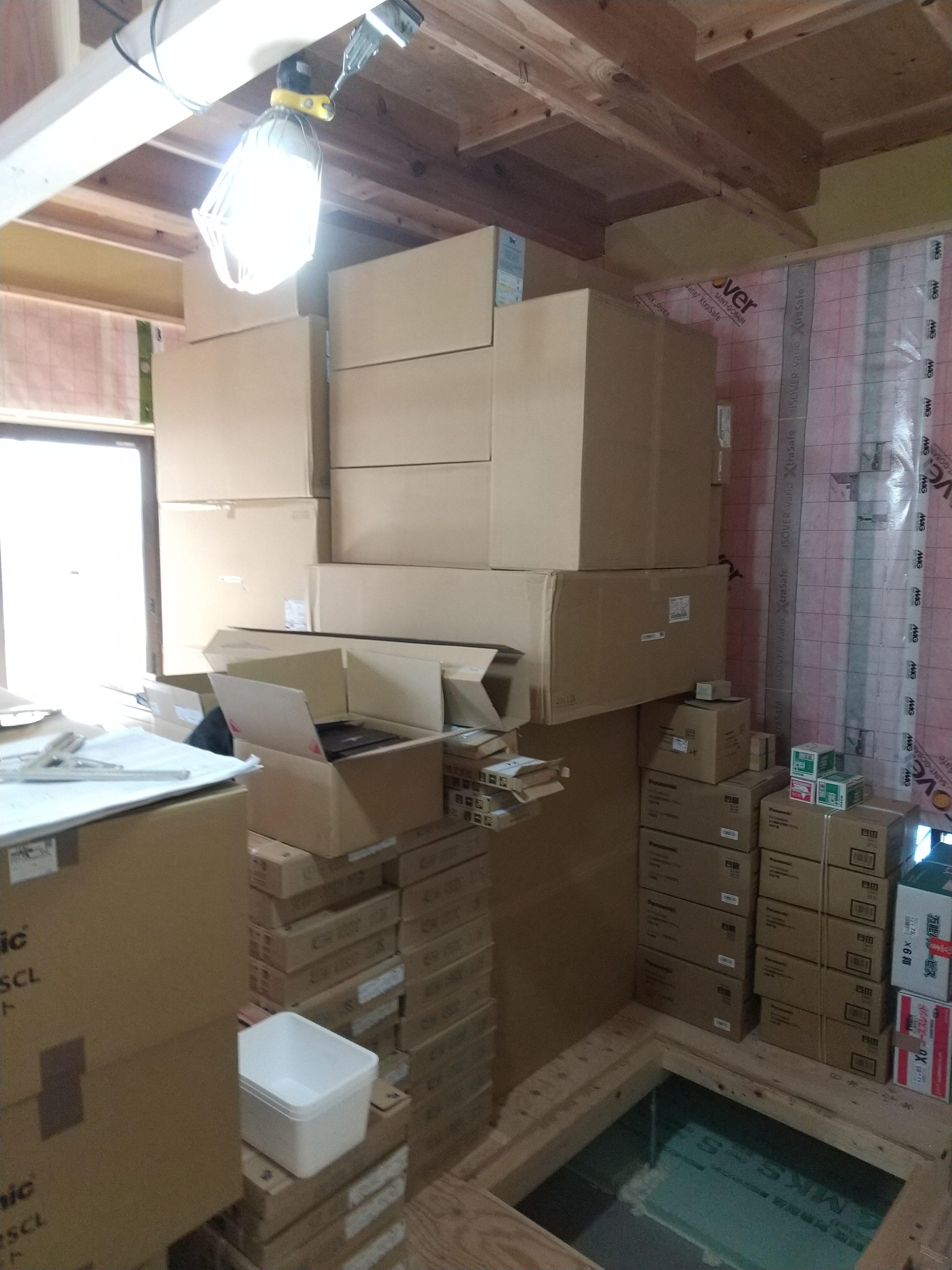 1階の和室には、この後施工される換気設備、エアコンなどの部材が床材と共に所狭しと言った感じに、運びこまれています。f井電気のh場さんは、完成間近の物件にひっぱりだこで、なかなか来れていない様子です。