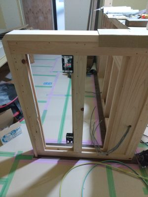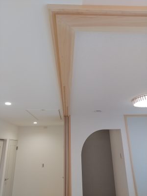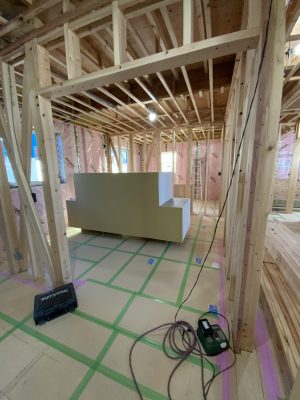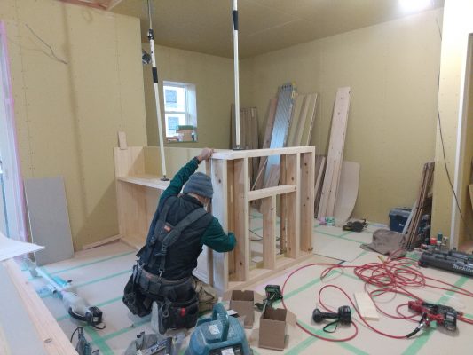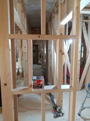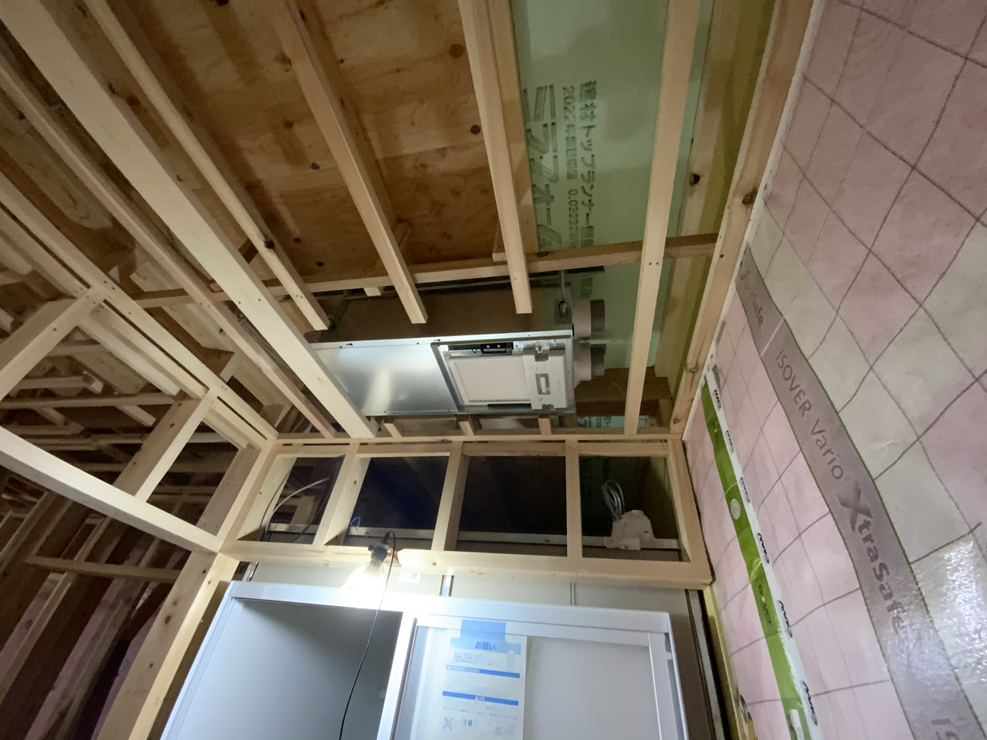 キッチンのレンジフードが取り付けられる部分や、ニッチなど、決めていただいた商品や棚などが取り付けられるように、プラスターボードを張る前にこのように下地を入れておきます。この作業を行うため、皆様には早めに、設備の選定や棚の打合せをお願いしています。