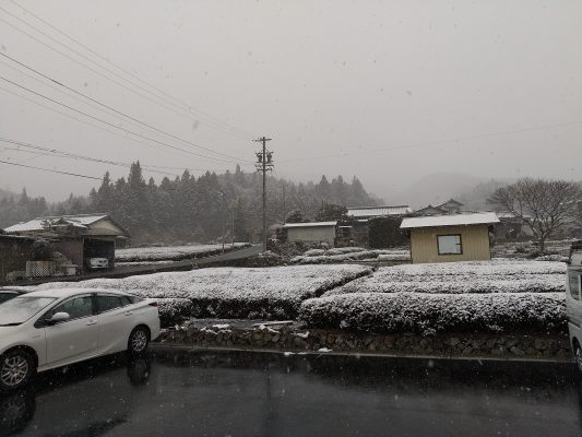 本日の白川町の様子です。雪がしんしんと降っています。名古屋方面から41号を北に進んで、今日は曇りだったせいか、飛騨川の飛水狭あたりは本当に翡翠のような川の色。白川町に入ると山はうっすら雪化粧で、早朝の運転もちょっとした気分転換になりました。