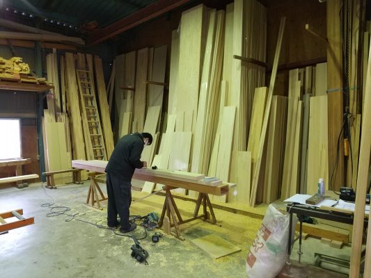 本社事務所の横にある工場では、h典棟梁が加工を行っています。h典棟梁の奥様、辺ちゃんは雪が降ってもお仕事されてますよ~(笑)