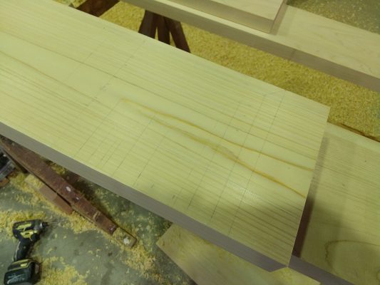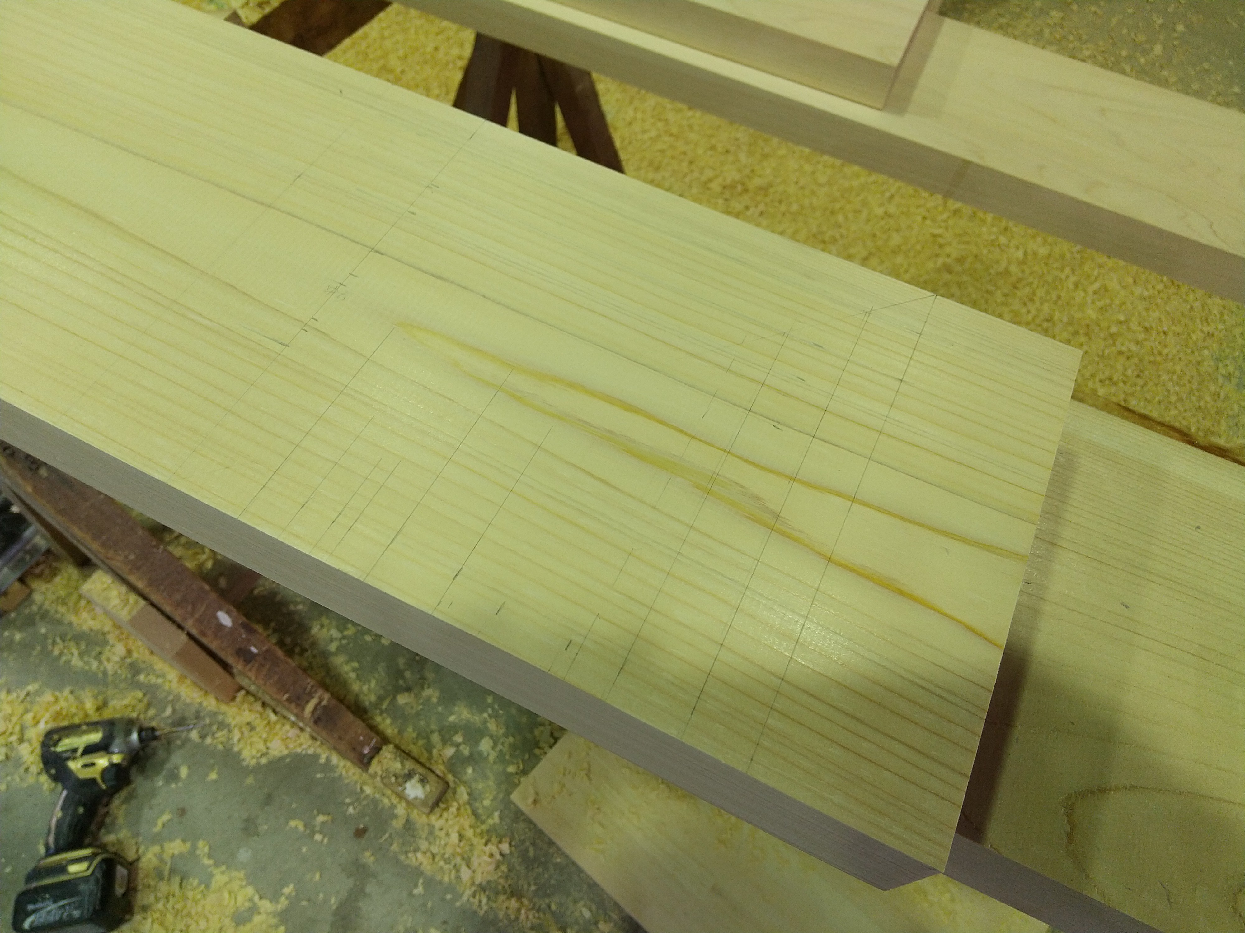 今日は2階の小上がりのタタミスペースの敷居。来週は1階のトイレカウンター、2階のキッチンカウンター下の収納を加工予定です。細かい寸法も知りたいとの事で、詳細図に細かい寸法を描いてみようと思います。